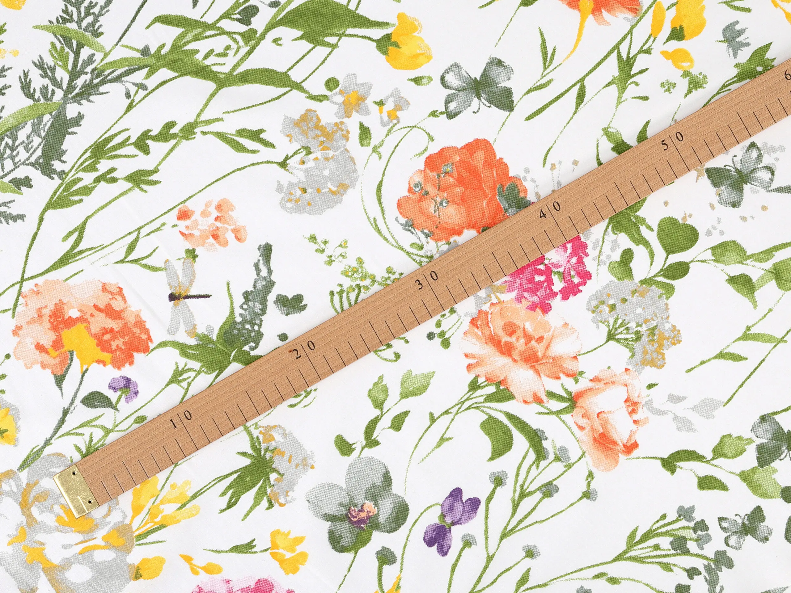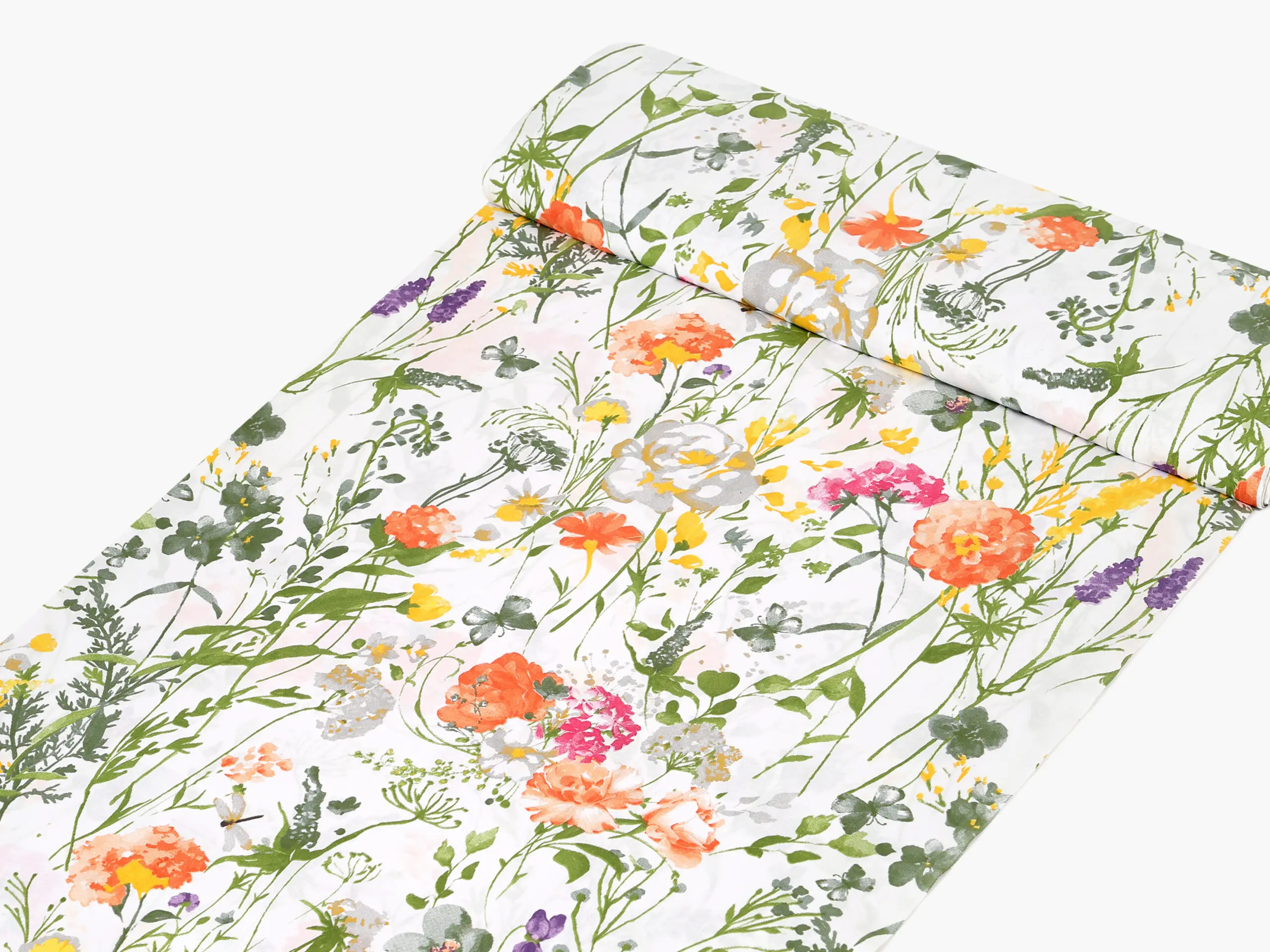 Bavlněná látka akvarelová louka značky Škodák je vyrobená z hustě tkané 100% bavlny o gramáži 145 g/m².