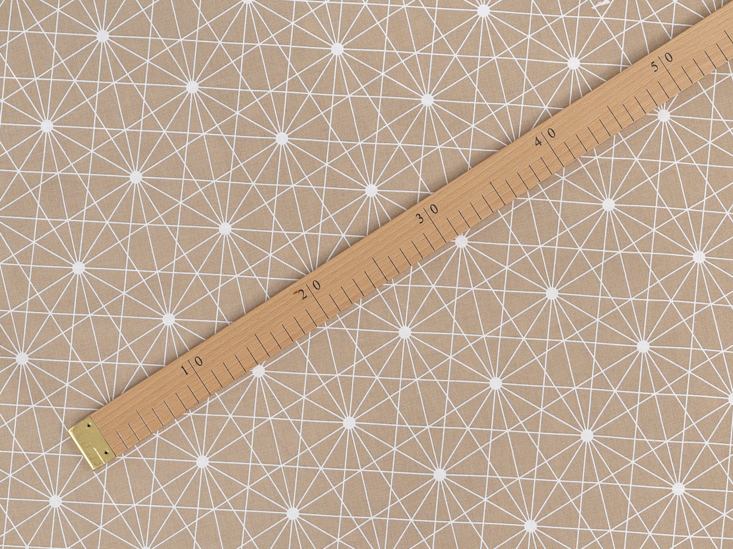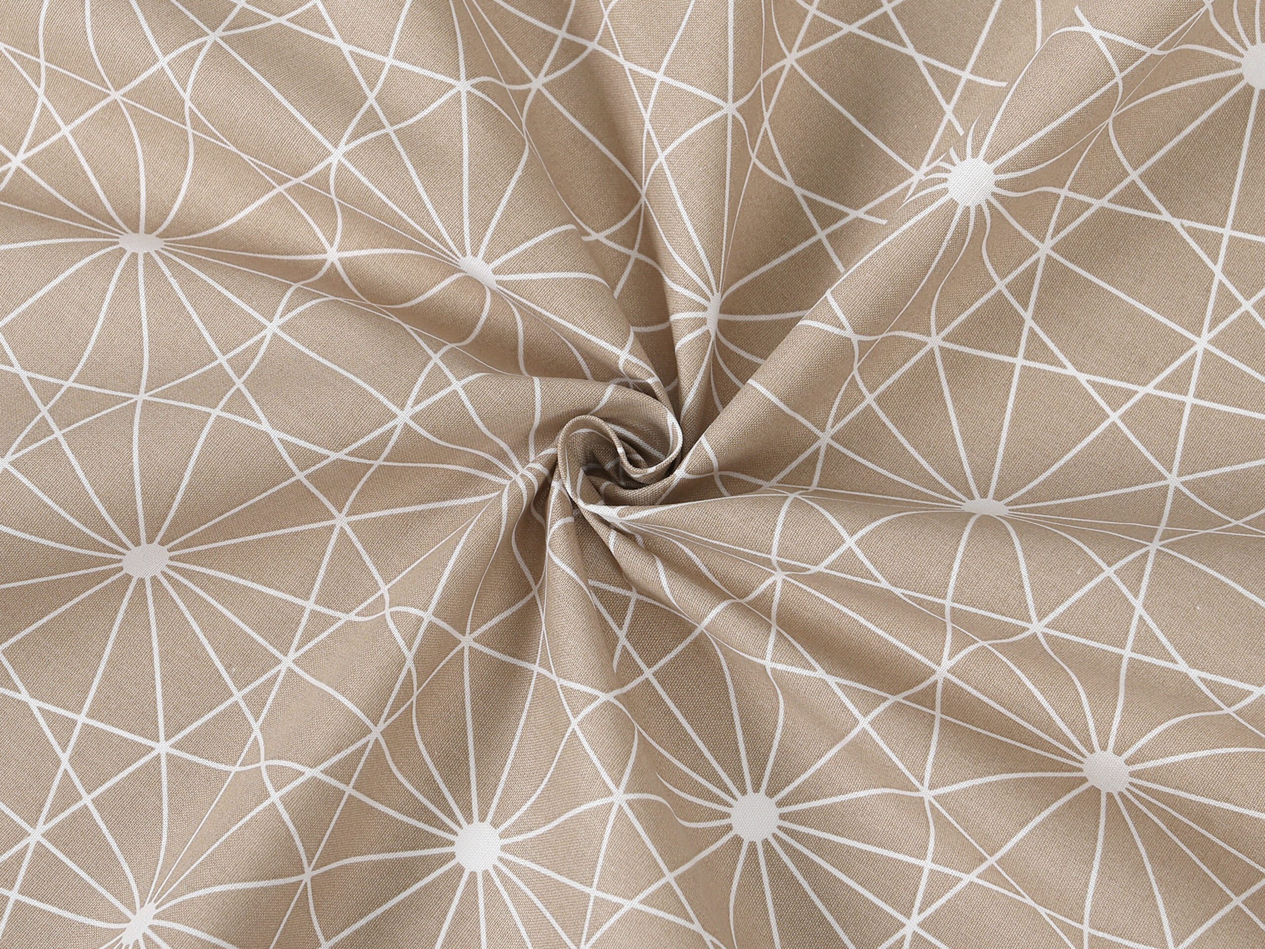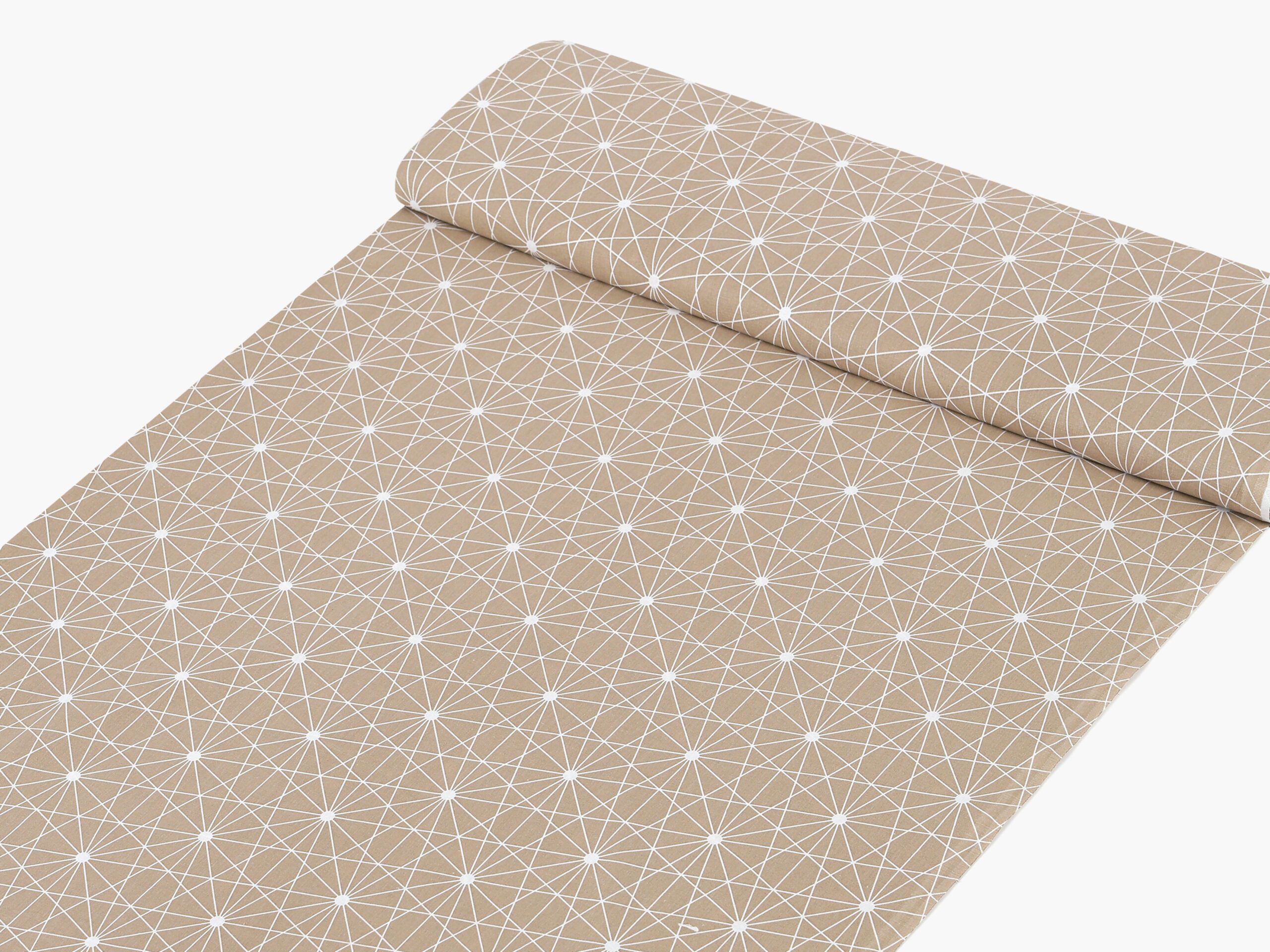 Bavlněná látka bílé čáry na hnědé značky Škodák je vyrobená z hustě tkané 100% bavlny o gramáži 145 g/m².