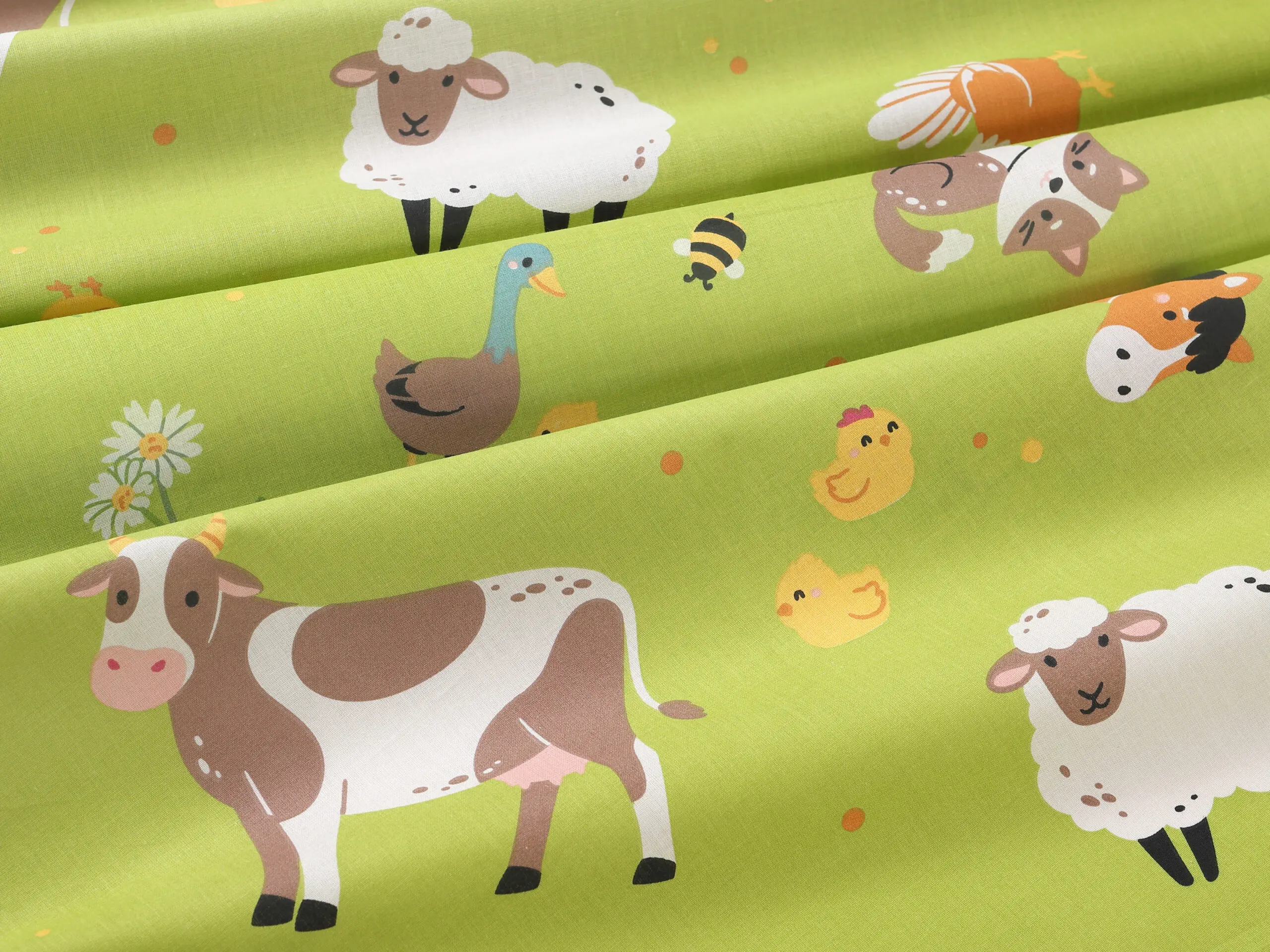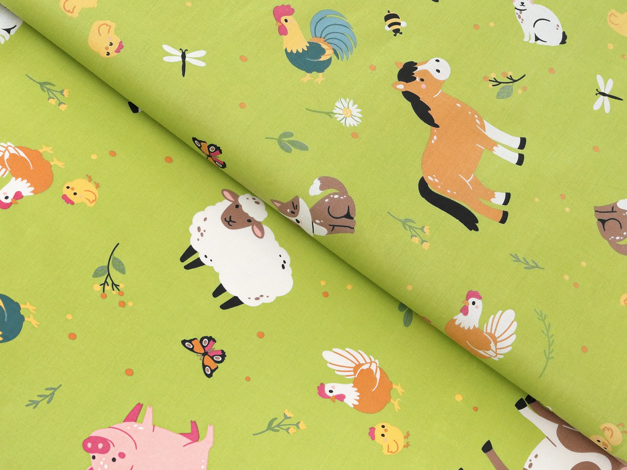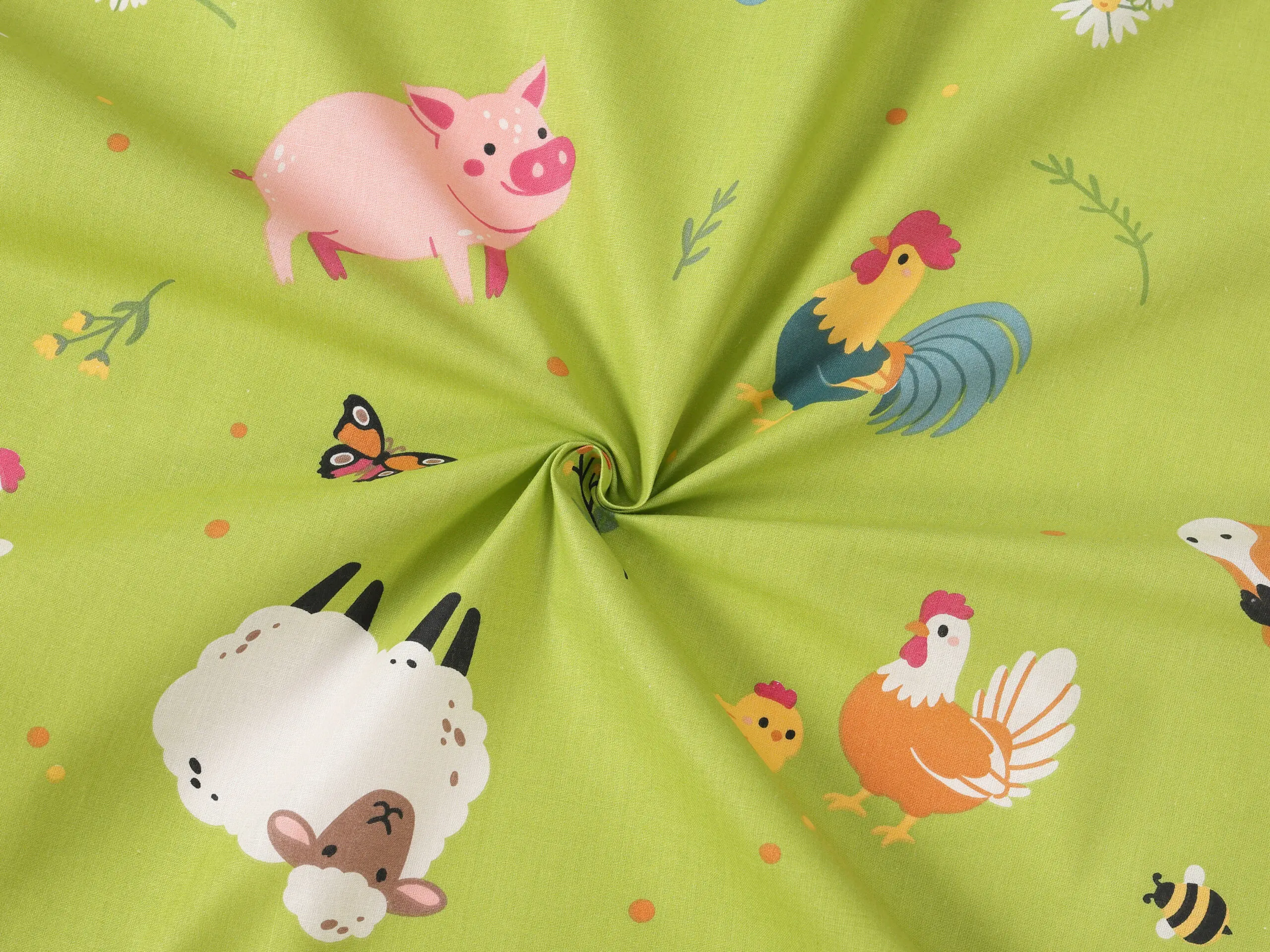 Bavlněná látka česká farma na zelené značky Škodák je vyrobená z hustě tkané 100% bavlny o gramáži 145 v g/m².