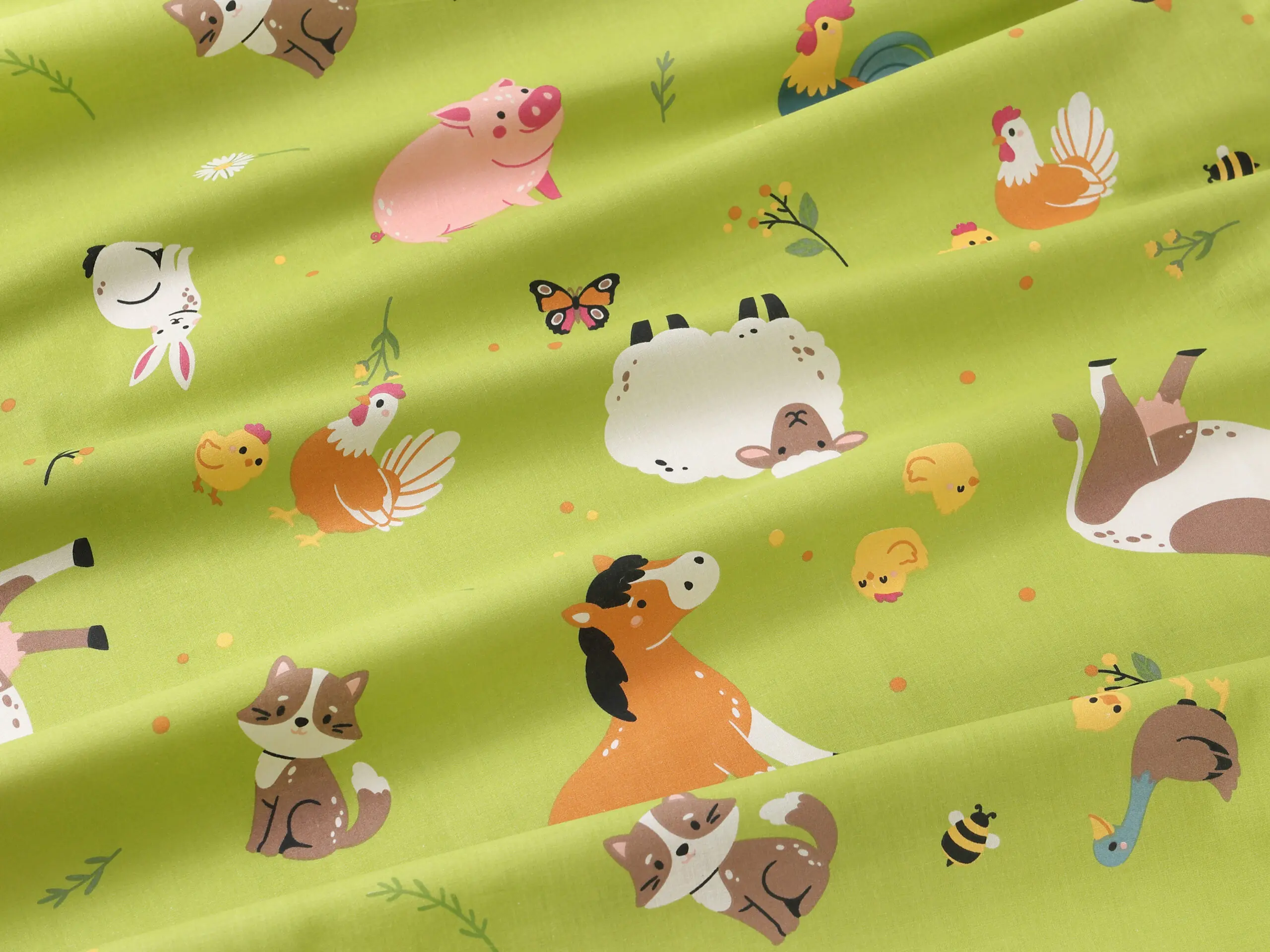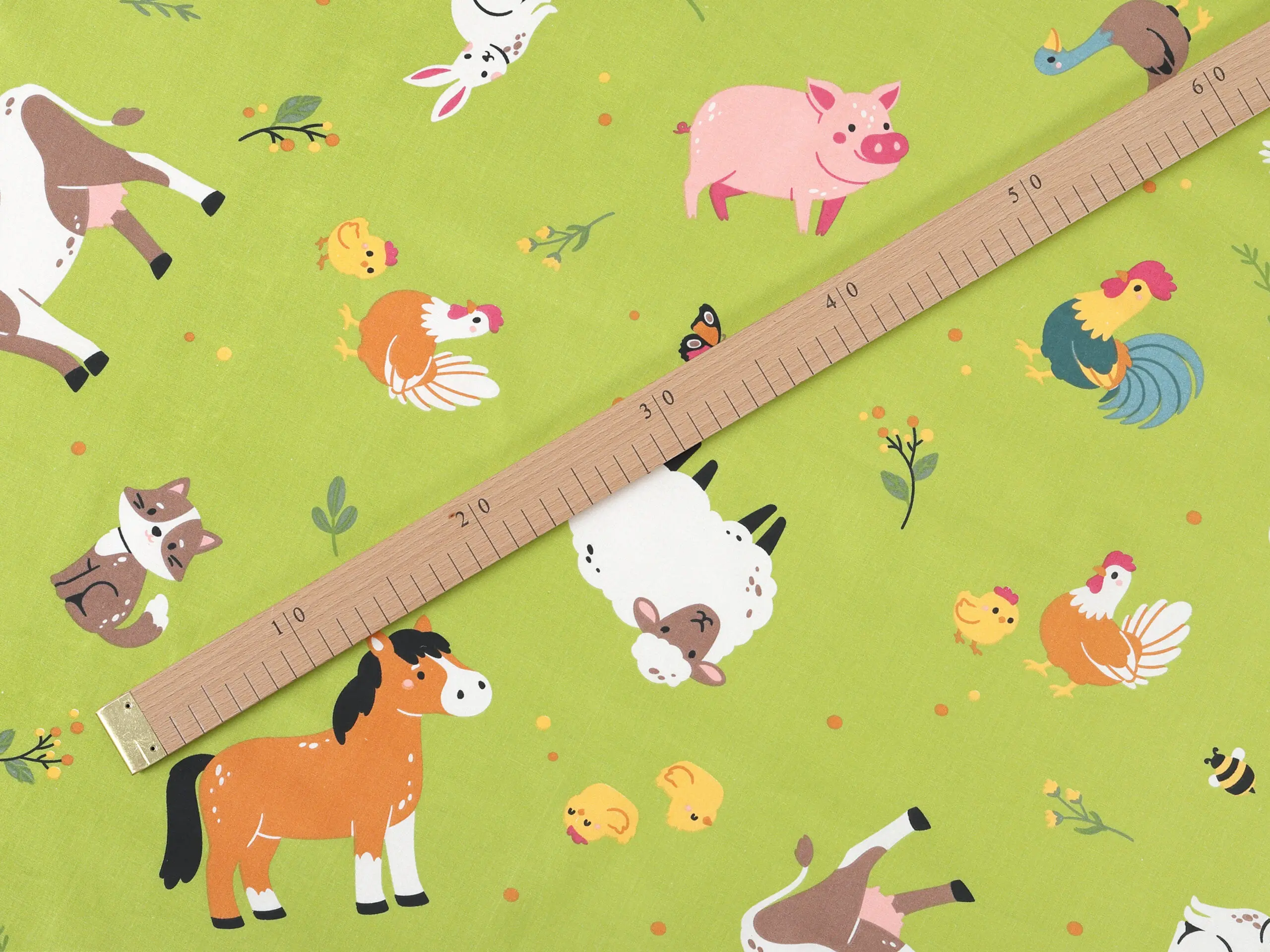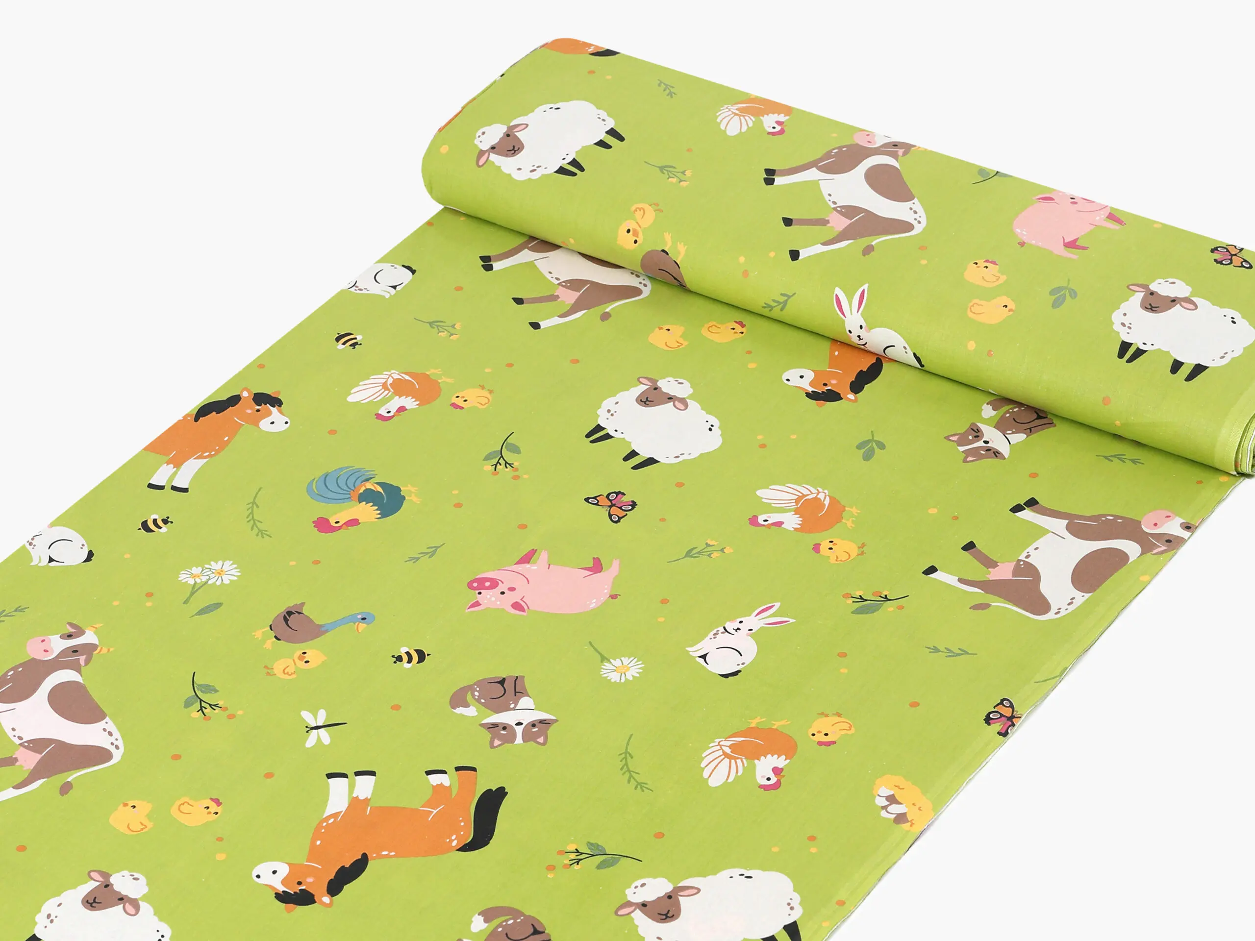Bavlněná látka česká farma na zelené značky Škodák je vyrobená z hustě tkané 100% bavlny o gramáži 145 v g/m².