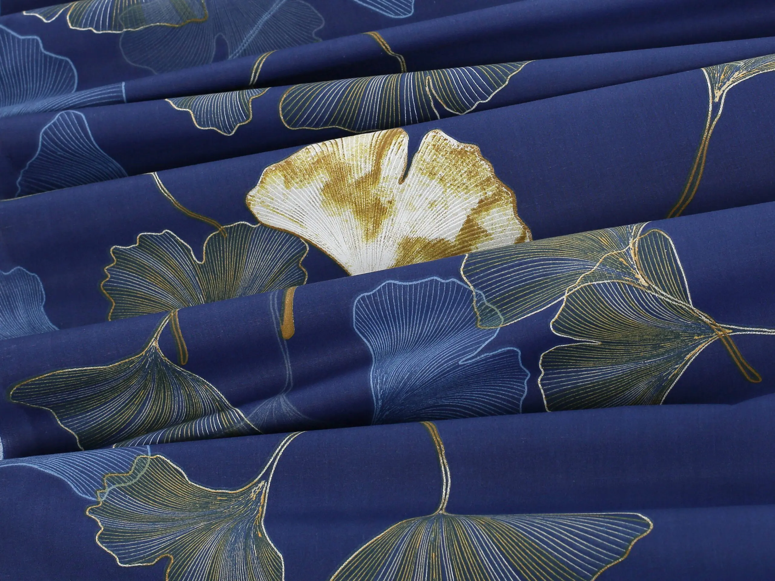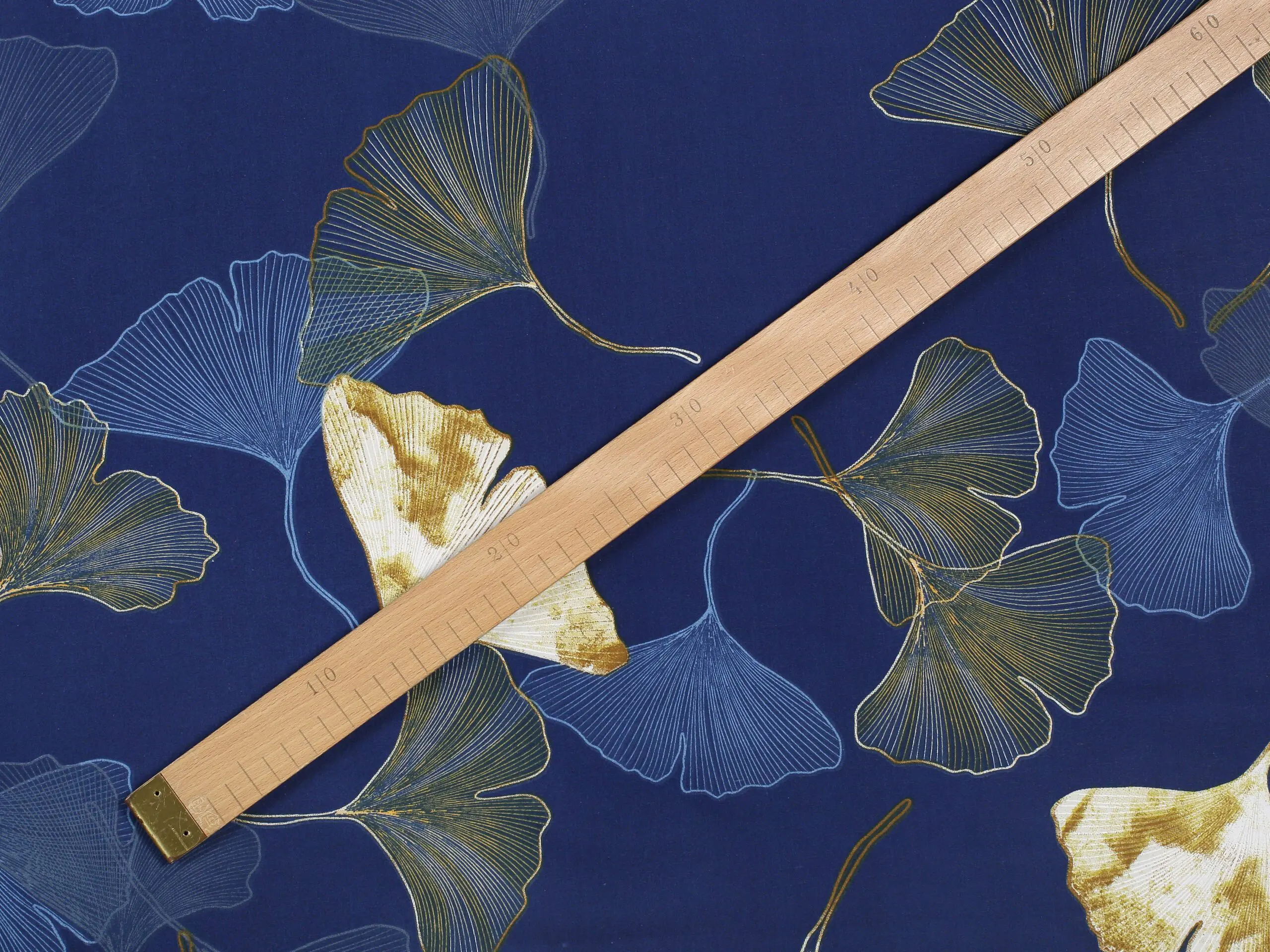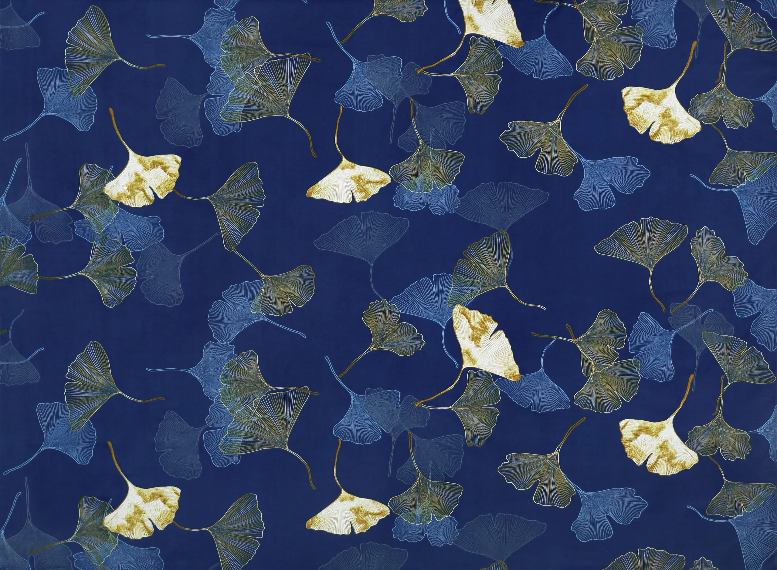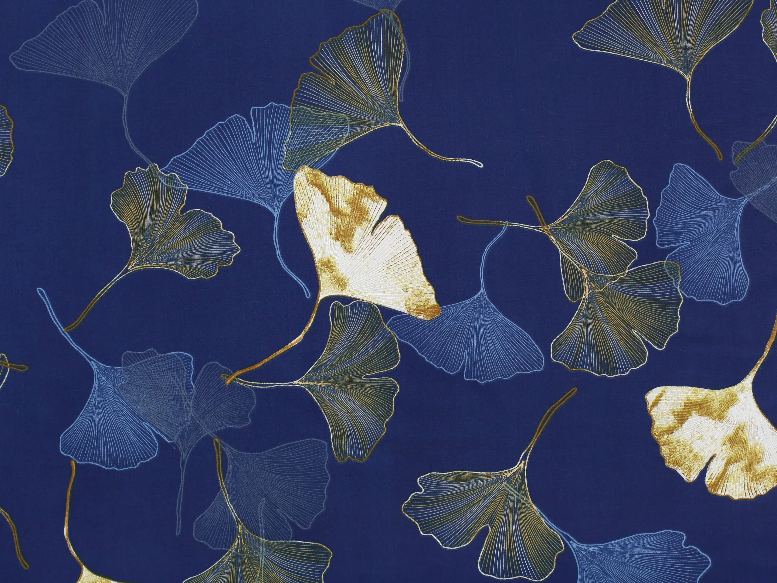 Nabízíme ji v šíři 145 cm a je k dispozici v krásném vzoru designovými listy ginkgo na modrém podkladu.