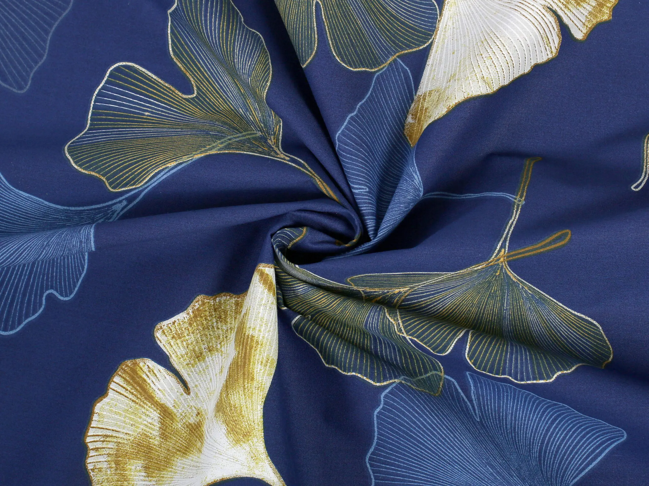 Bavlněná látka ginkgo na modré značky Škodák je vyrobená z hustě tkané 100% bavlny o gramáži 145 g/m².