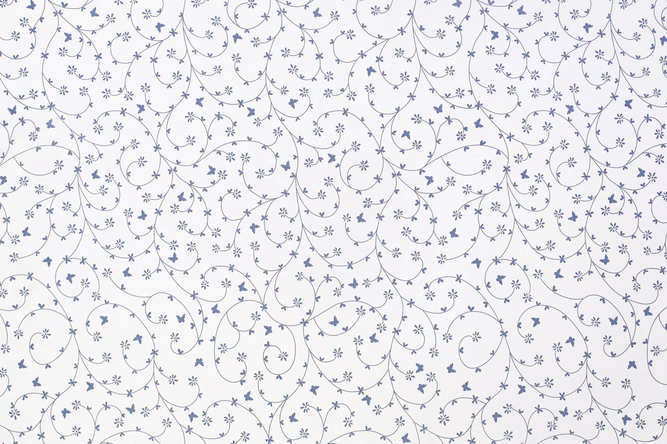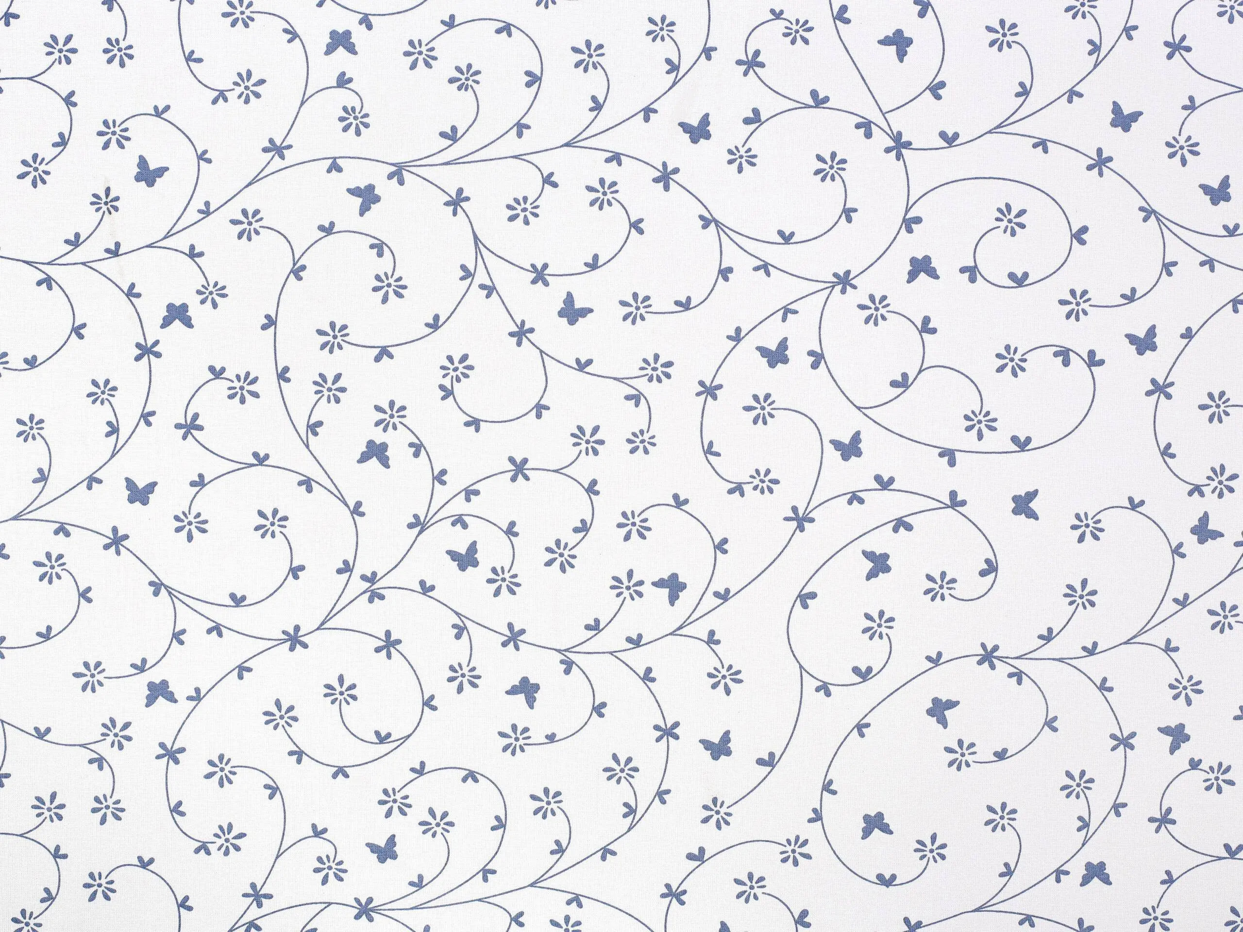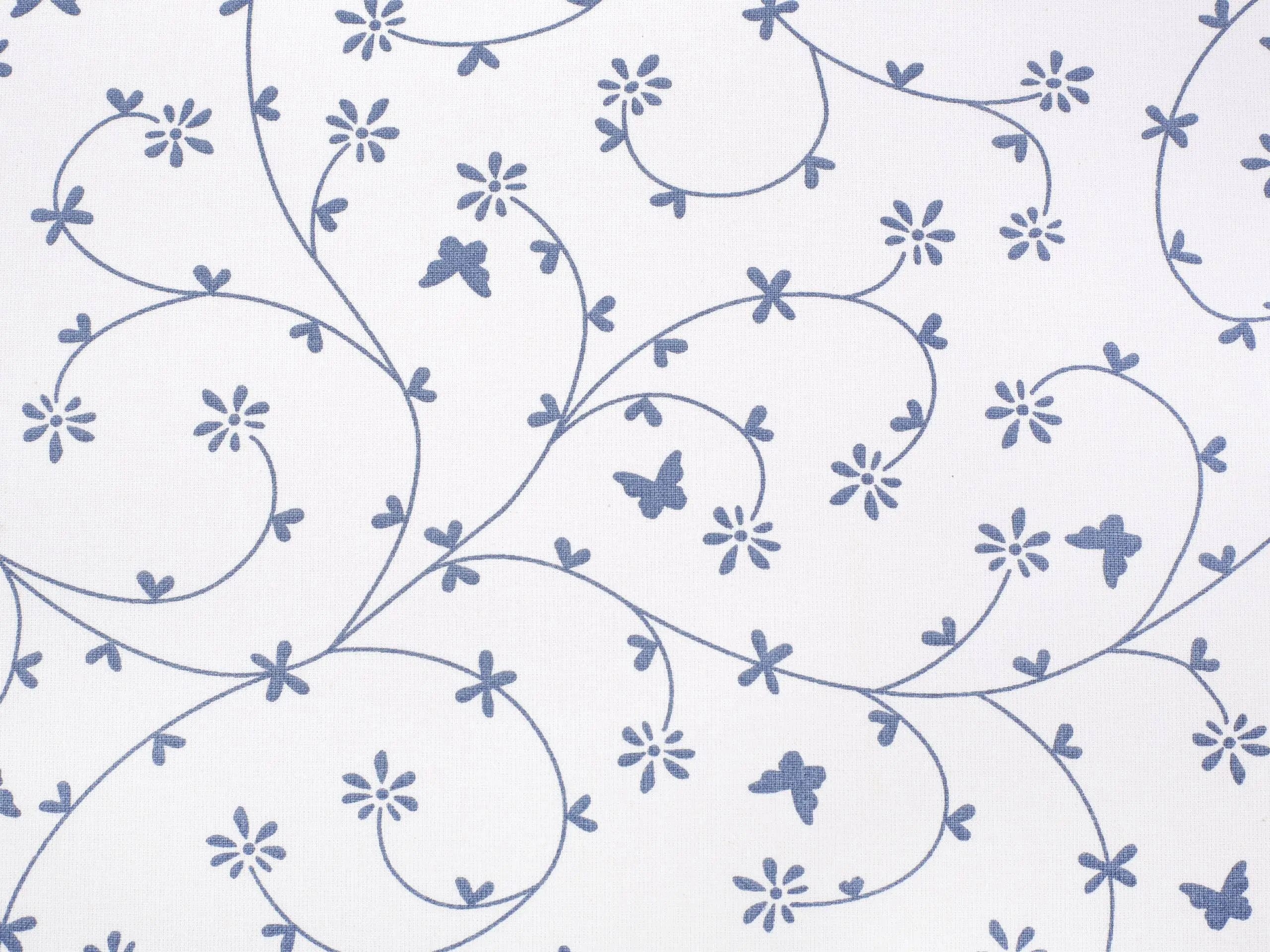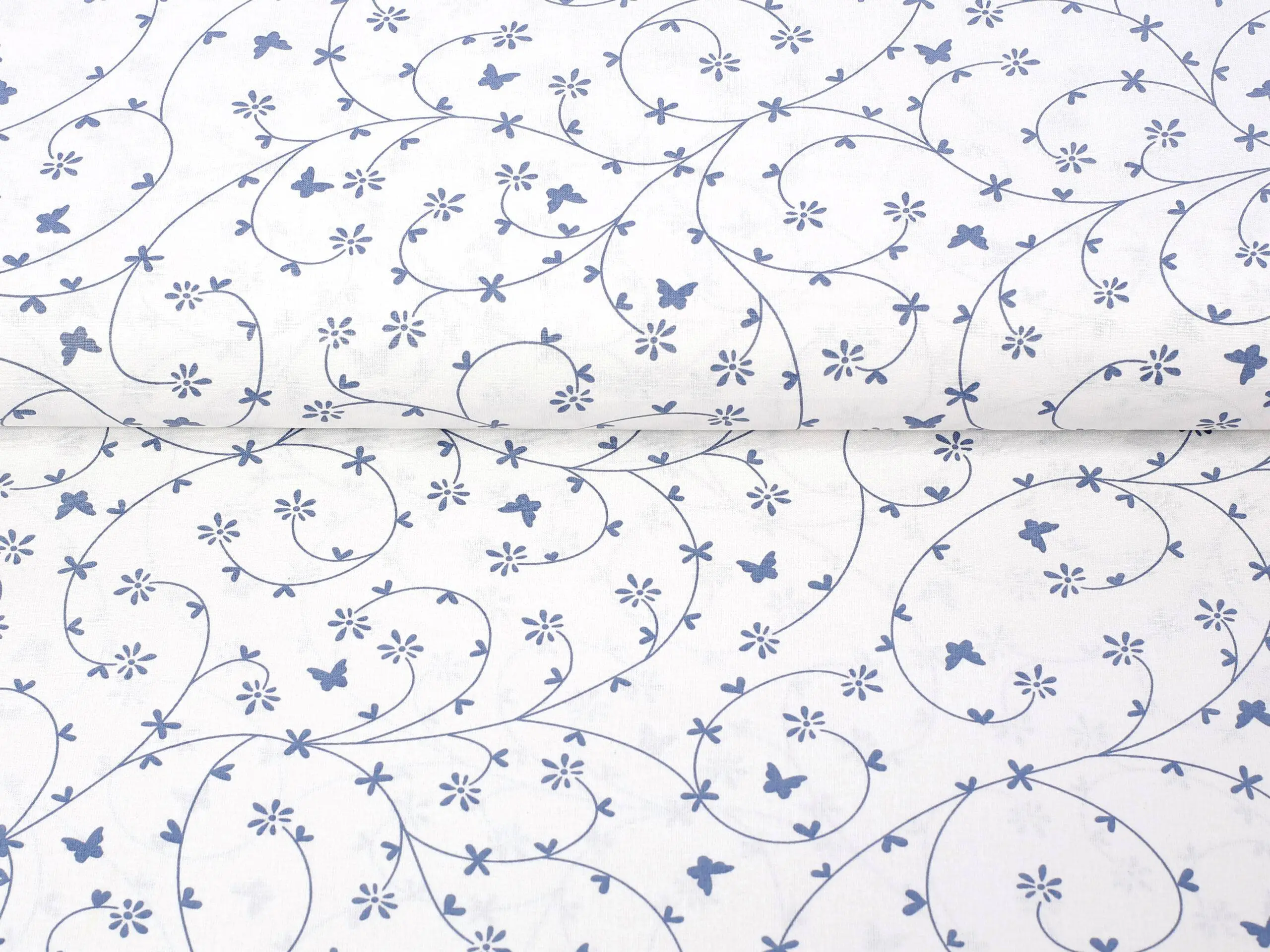 Nabízíme ji v šíři 145 cm a je k dispozici v krásném motivu s modrými motýlky na podkladové bílé barvě.