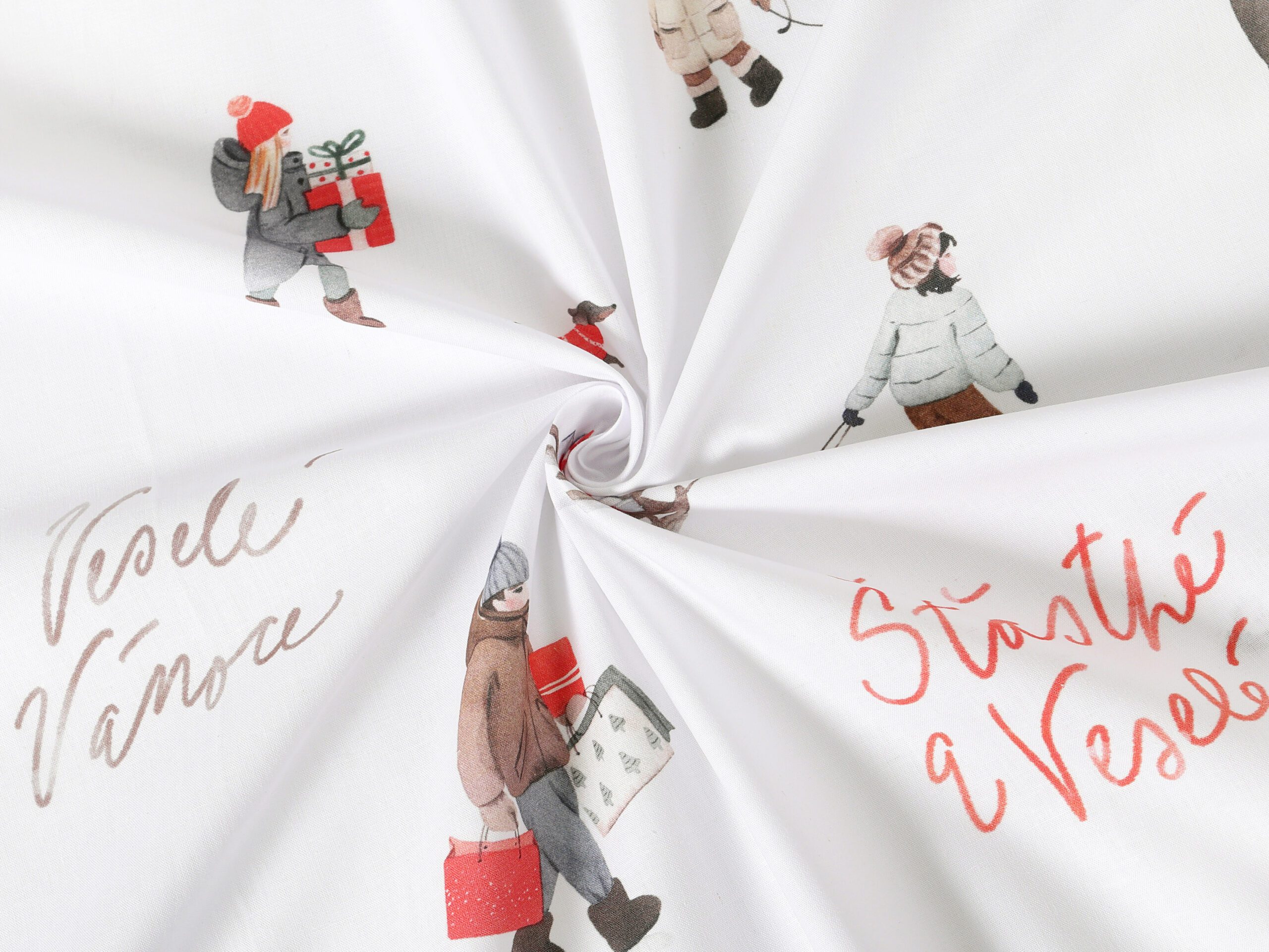 Nabízíme ji v šíři 150 cm a je k dispozici v krásném vzoru veselých Vánoce na podkladové bílé barvě.