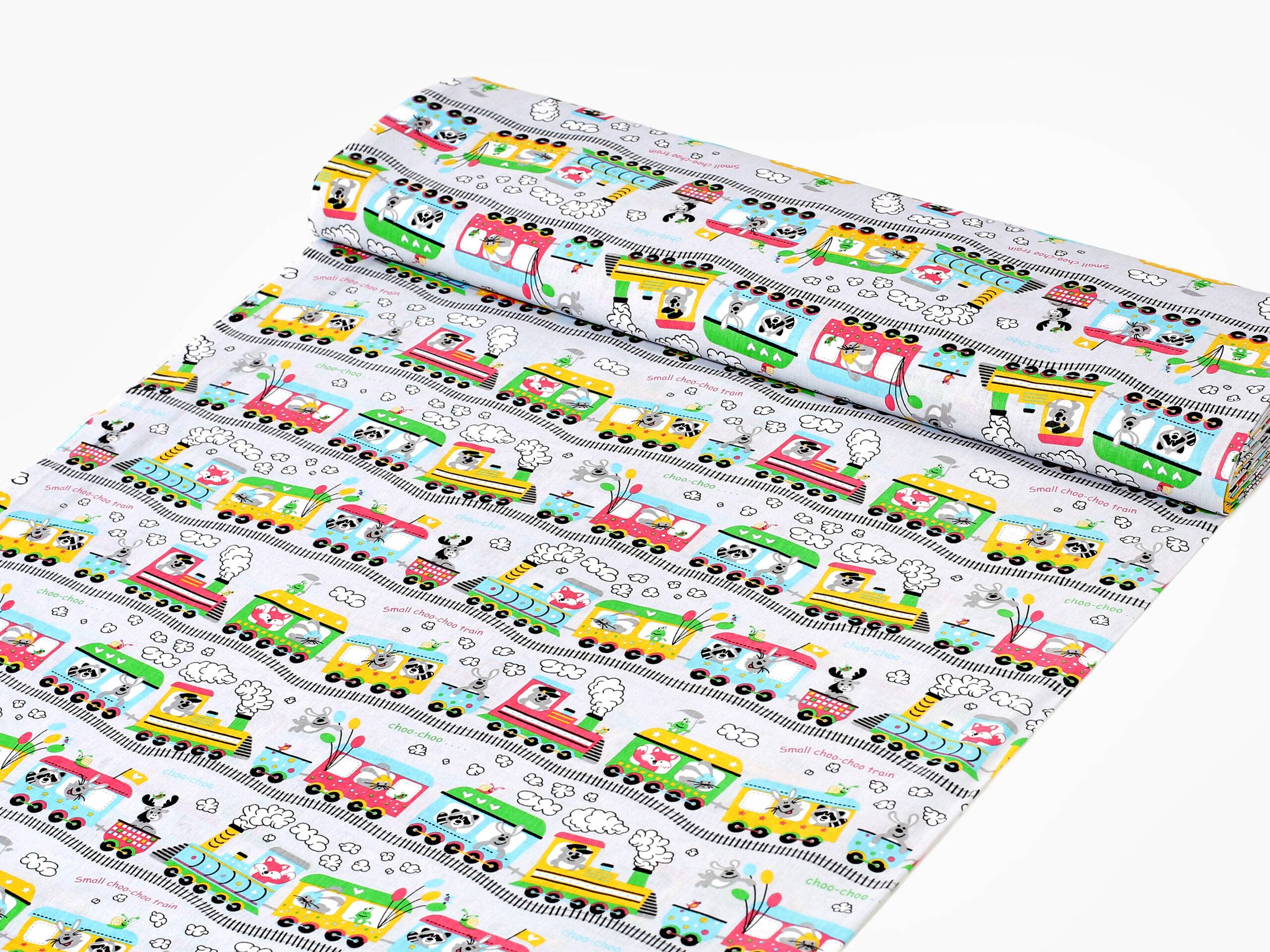 Bavlněná látka vláčci na šedé značky Škodák je vyrobená z hustě tkané 100% bavlny o gramáži 145 g/m².