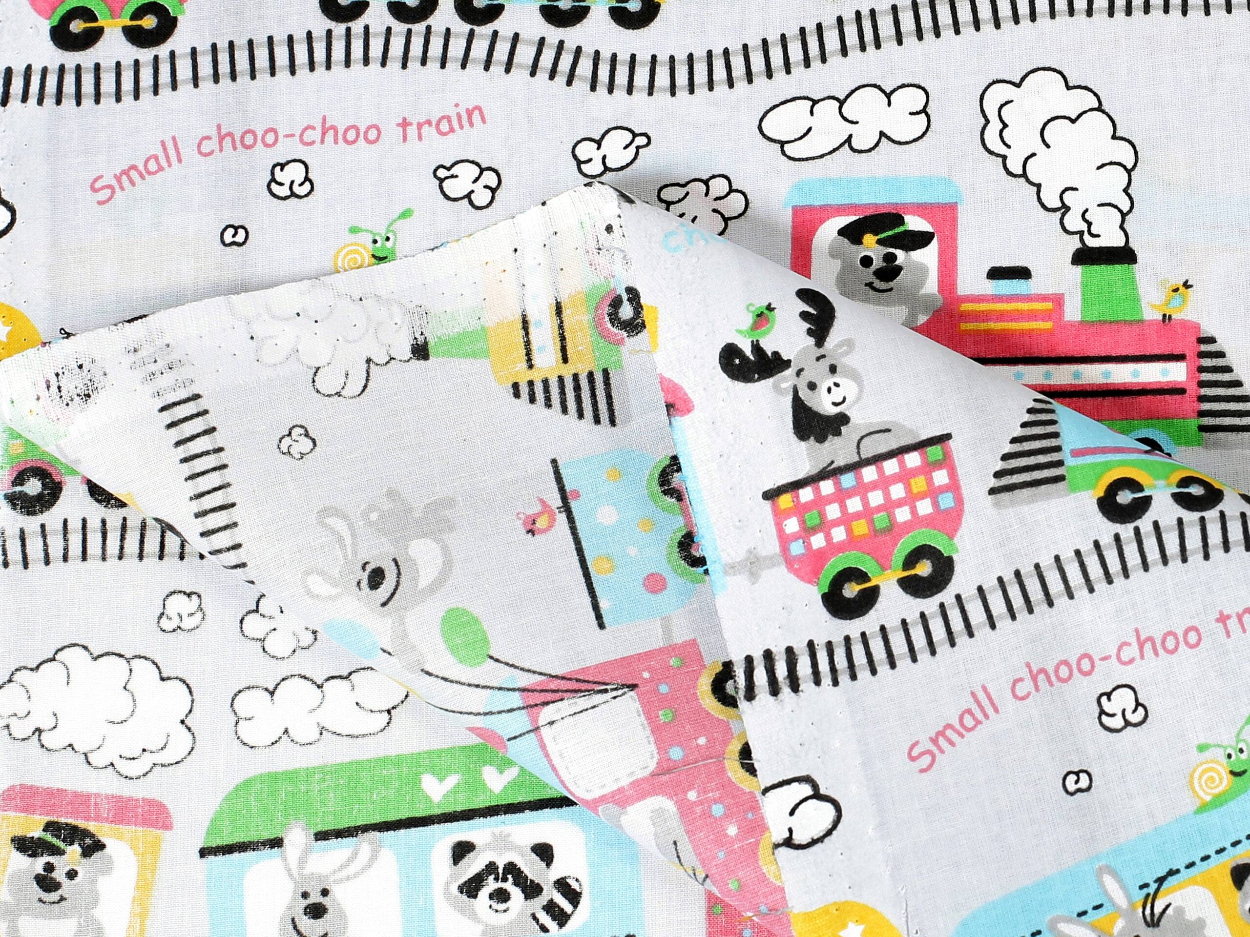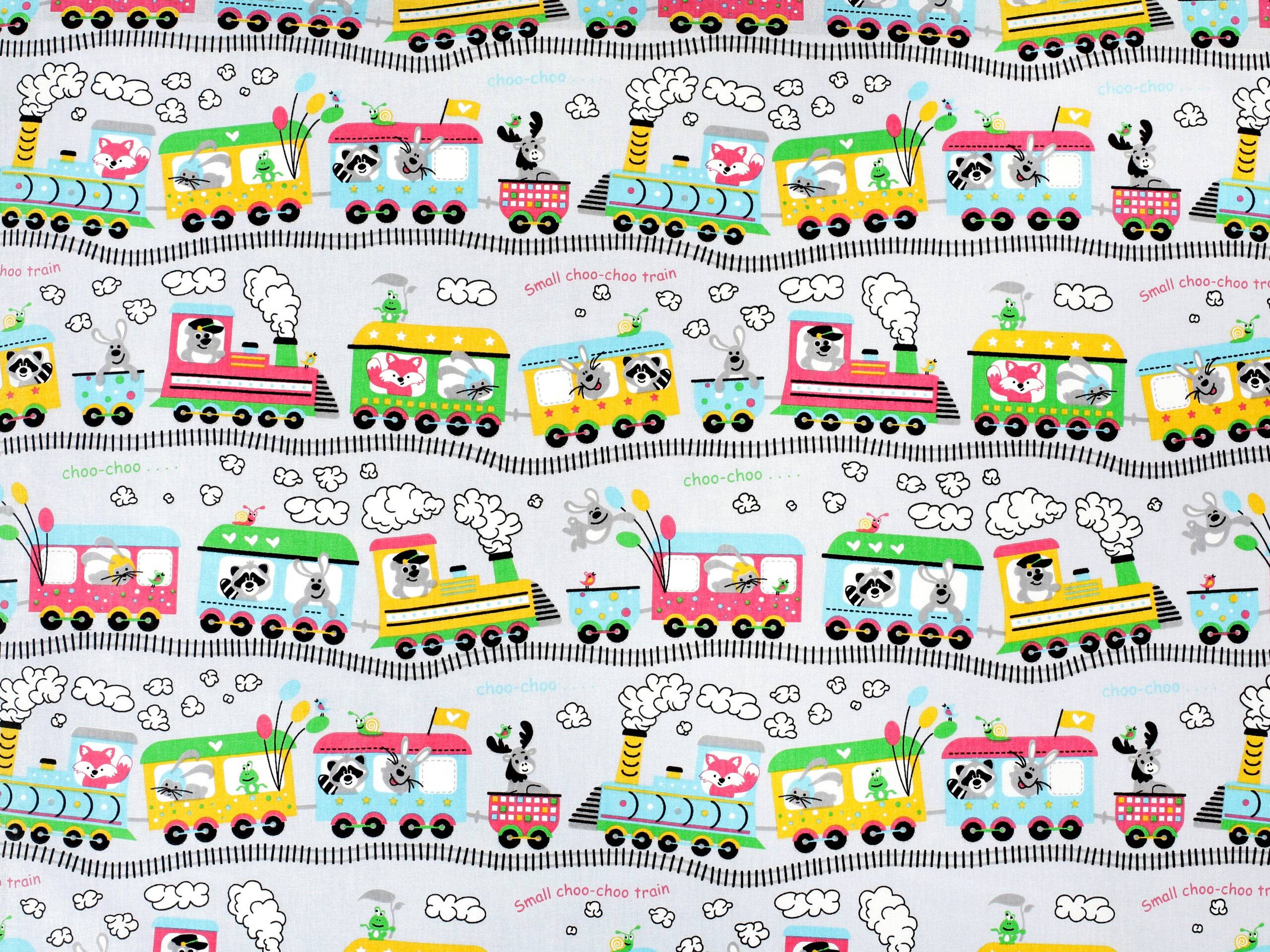 Bavlněná látka – vláčci na šedé – metráž šířka 160 cm