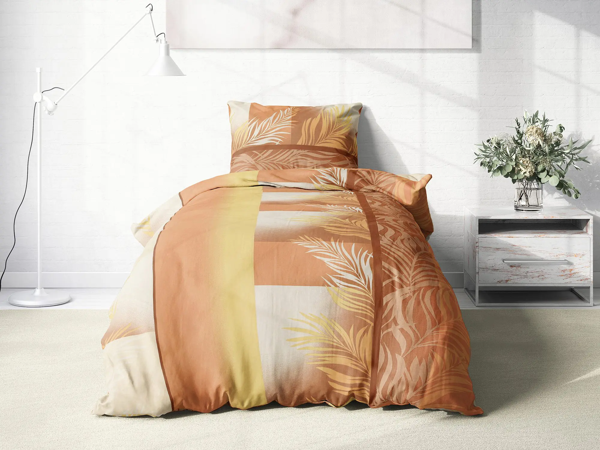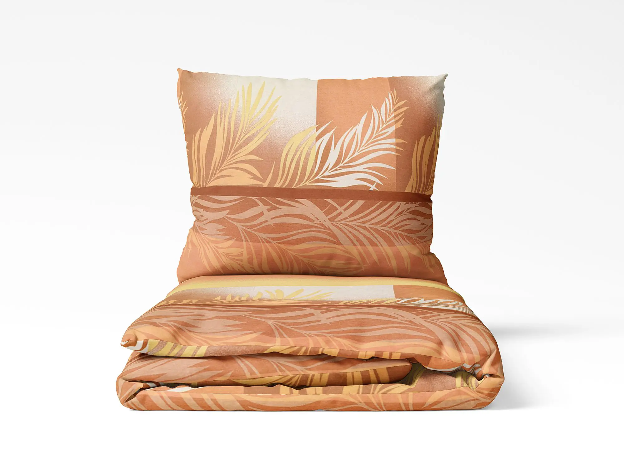 Motiv béžového a lososového listí na hnědém/ béžovém pozadí přidává povlečení skvělý šarm.