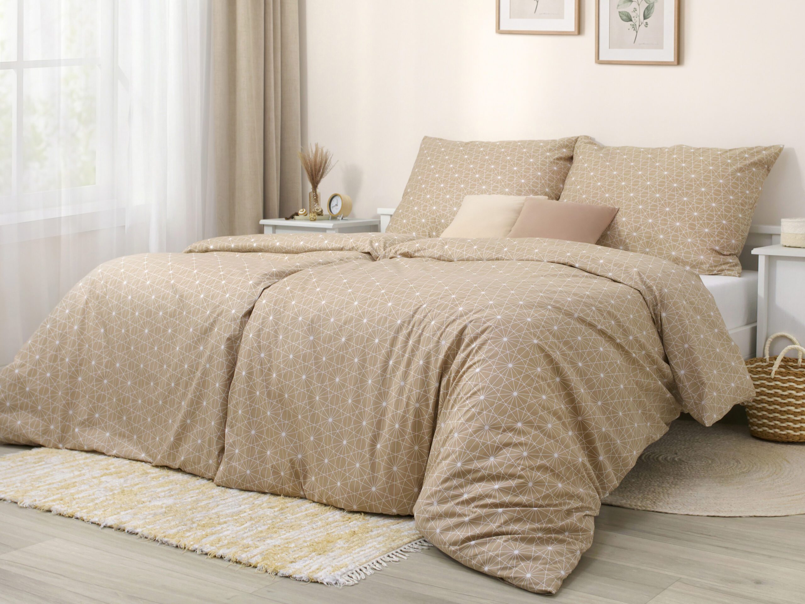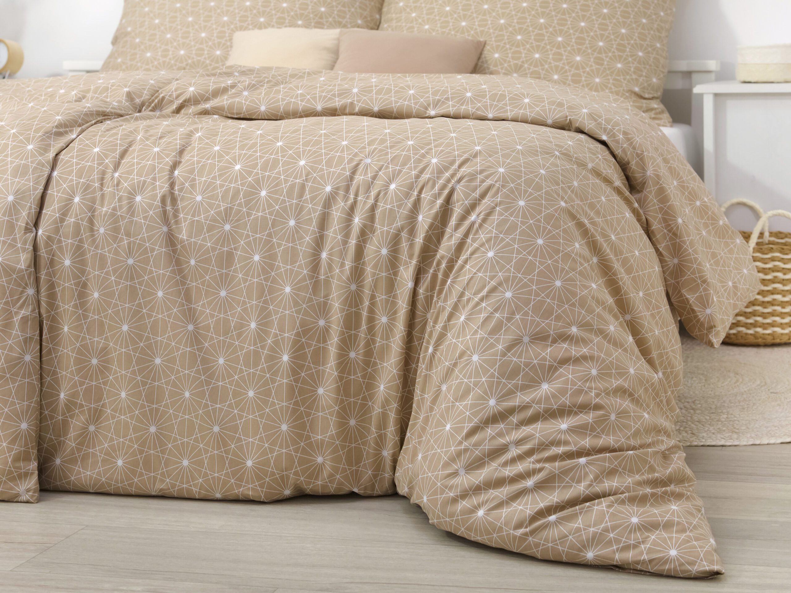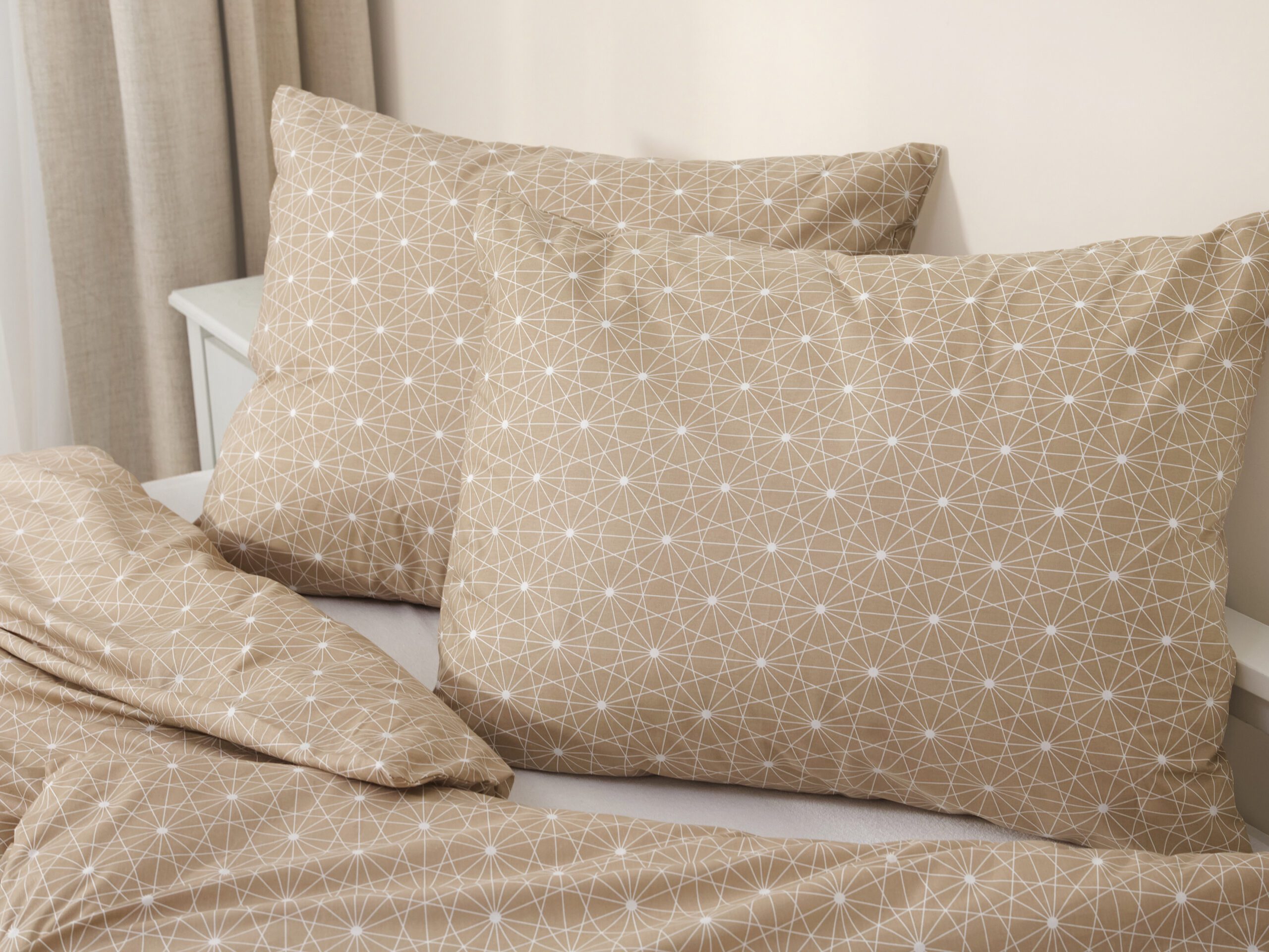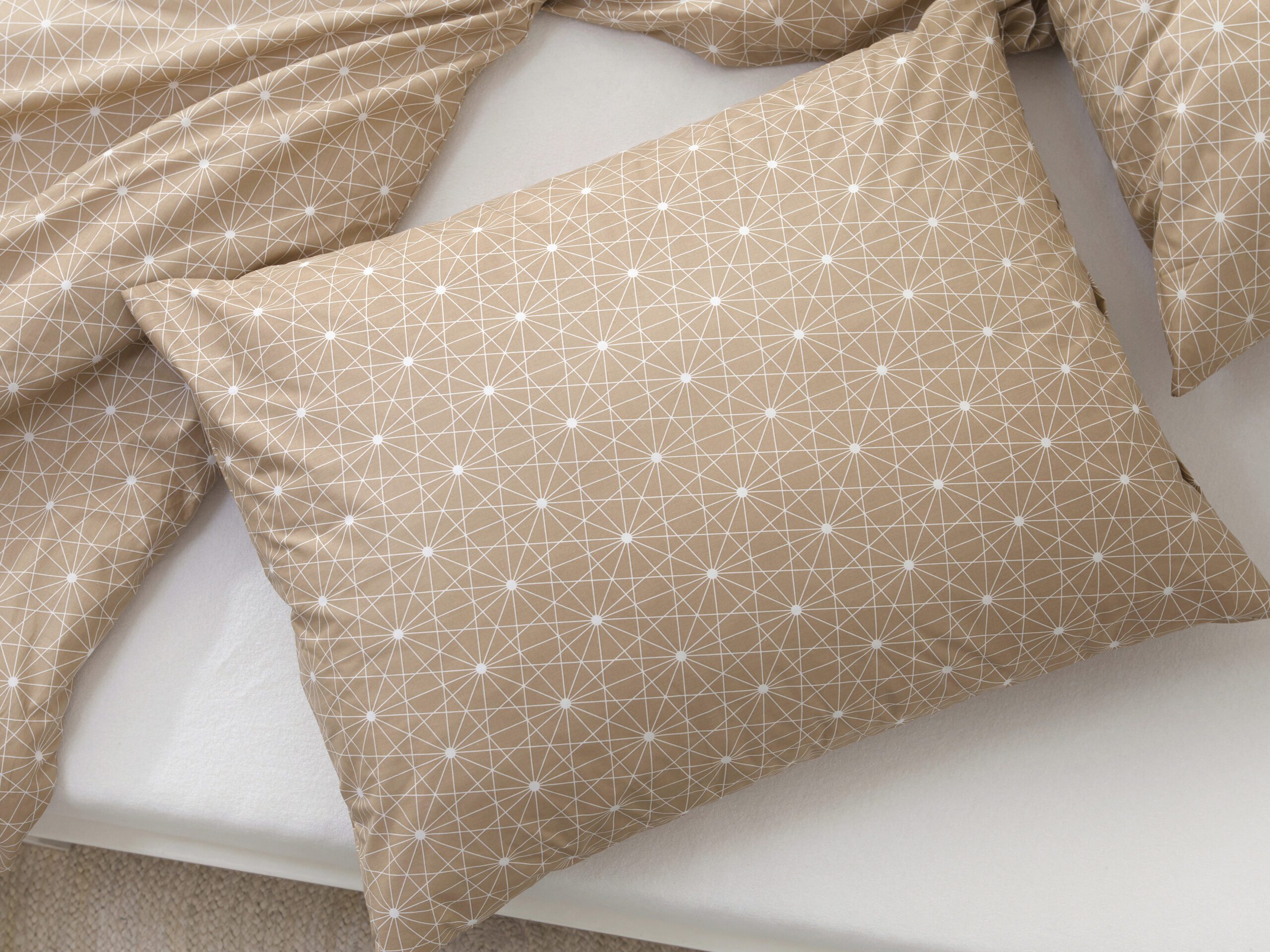 Motiv bílých čar na hnědém pozadí přidává povlečení skvělý šarm.