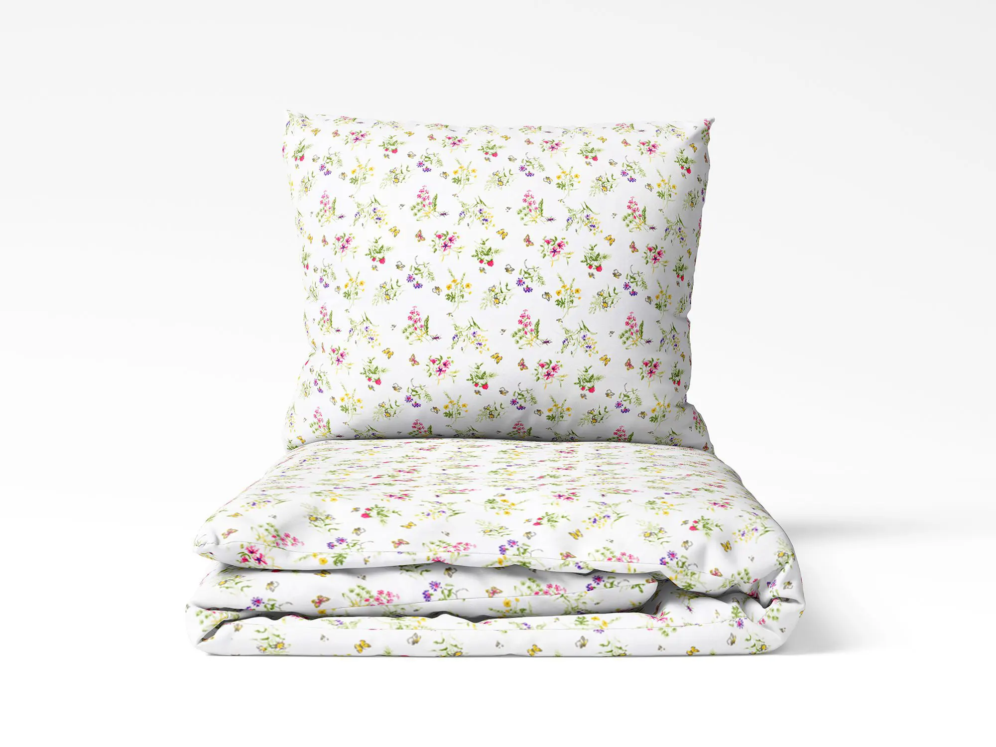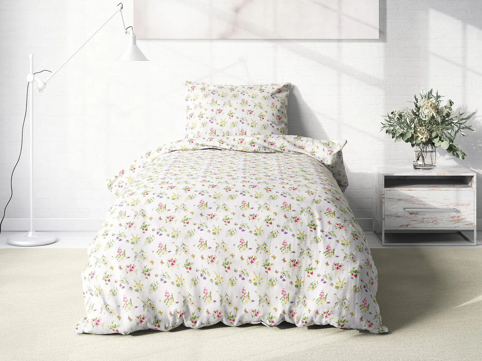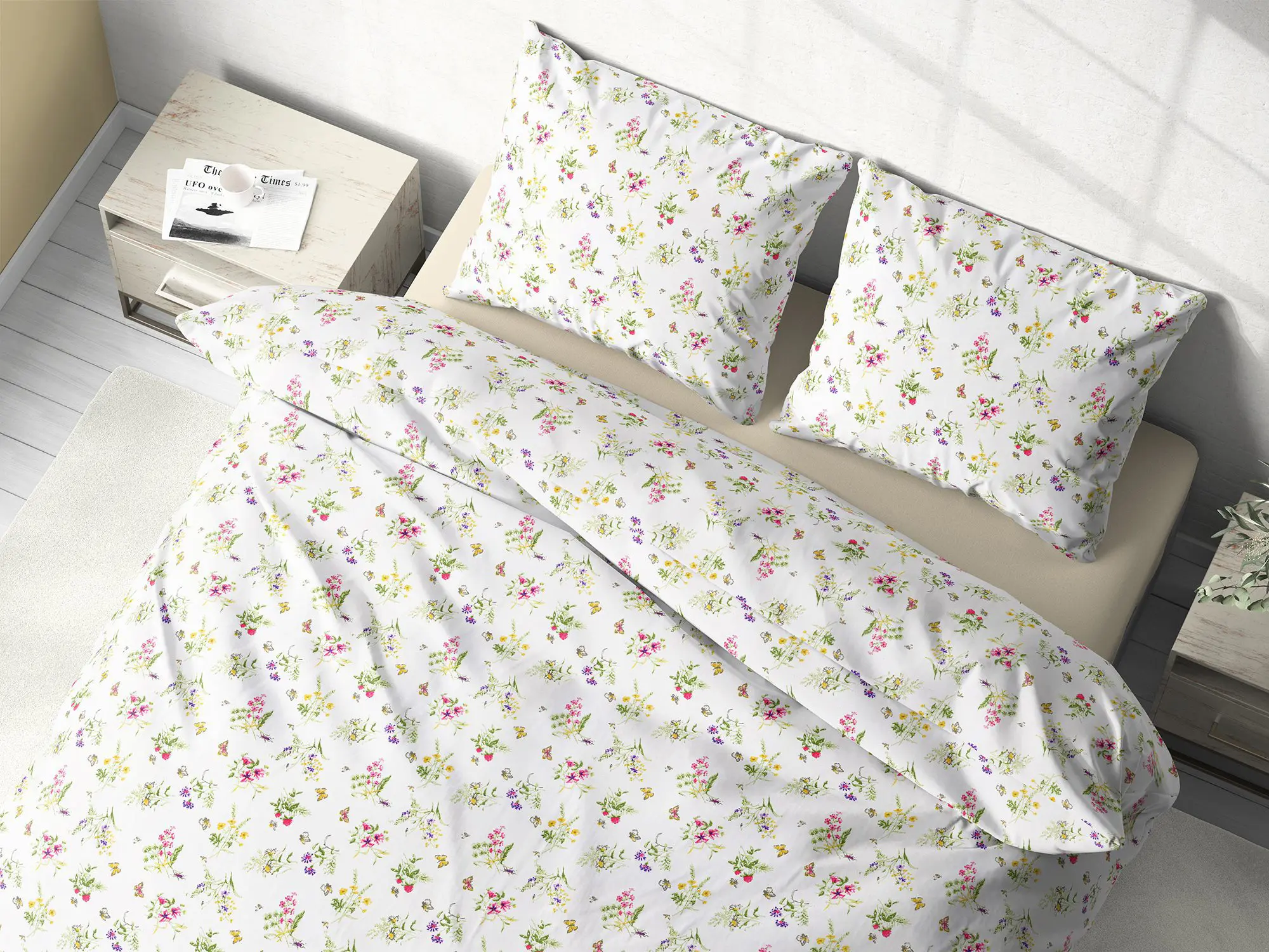 Motiv rozkvetlé louky na bílém pozadí přidává povlečení skvělý šarm.