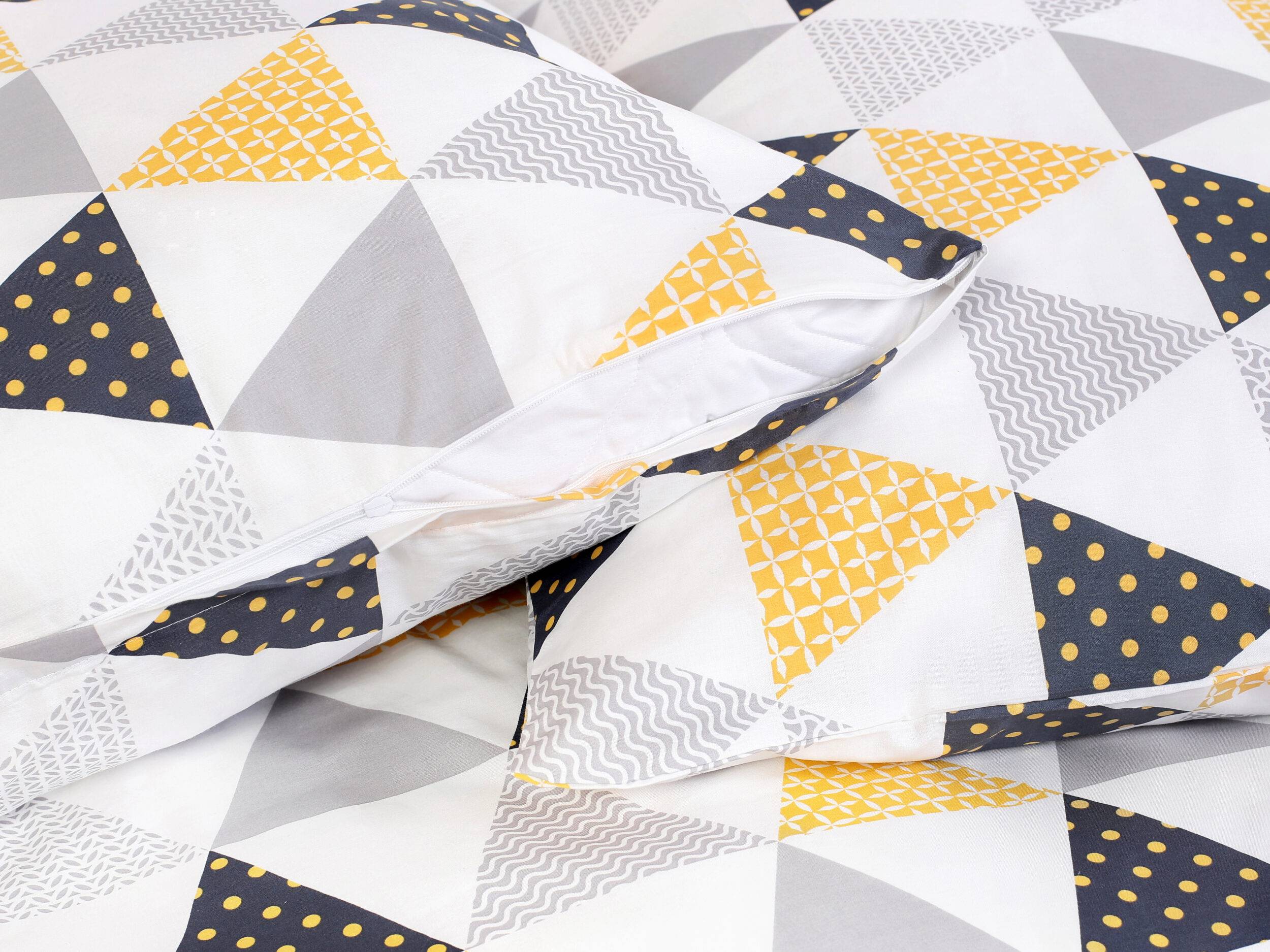 Motiv retro hořčicových trojúhelníků na bílém pozadí přidává povlečení skvělý šarm.