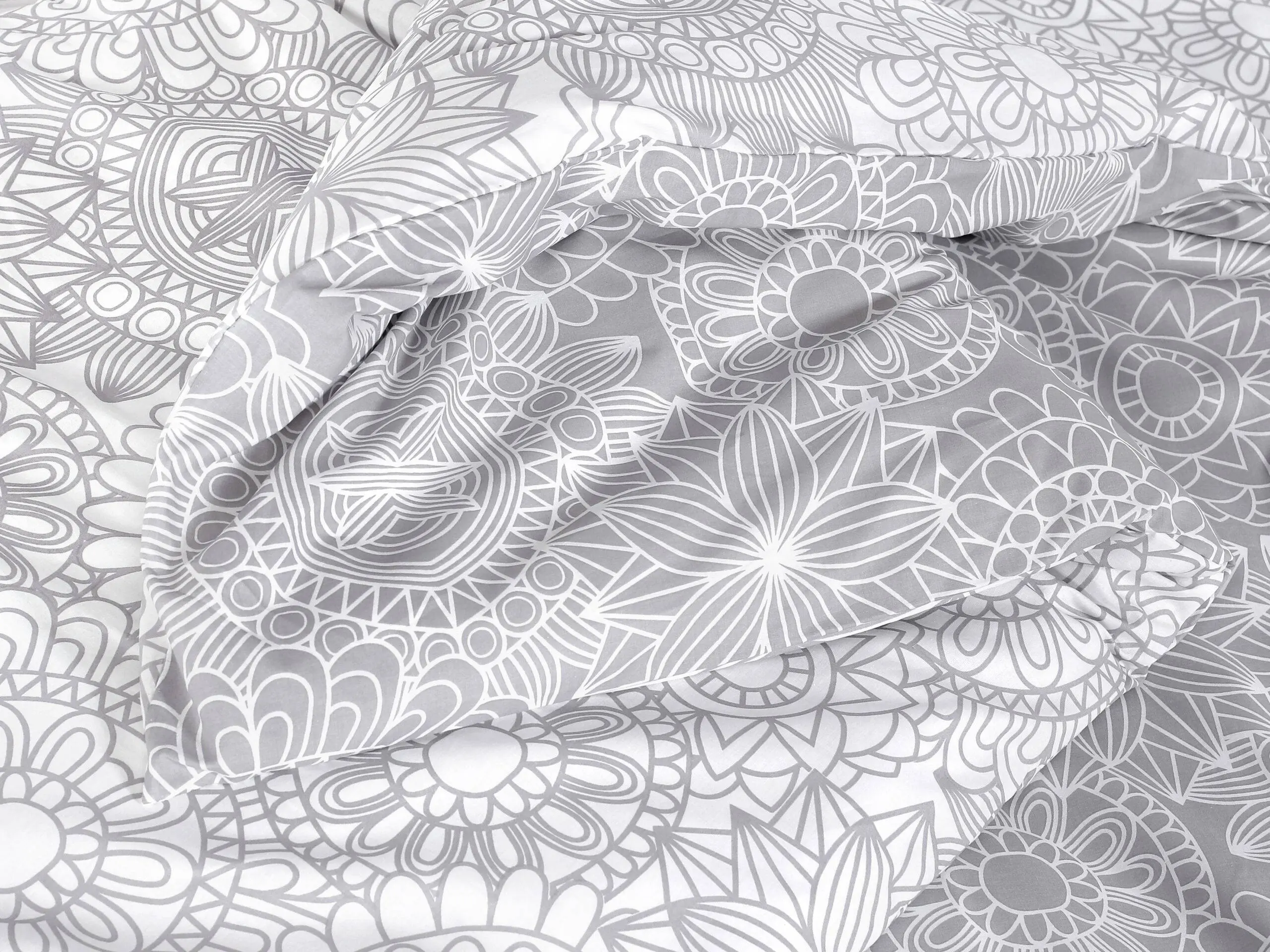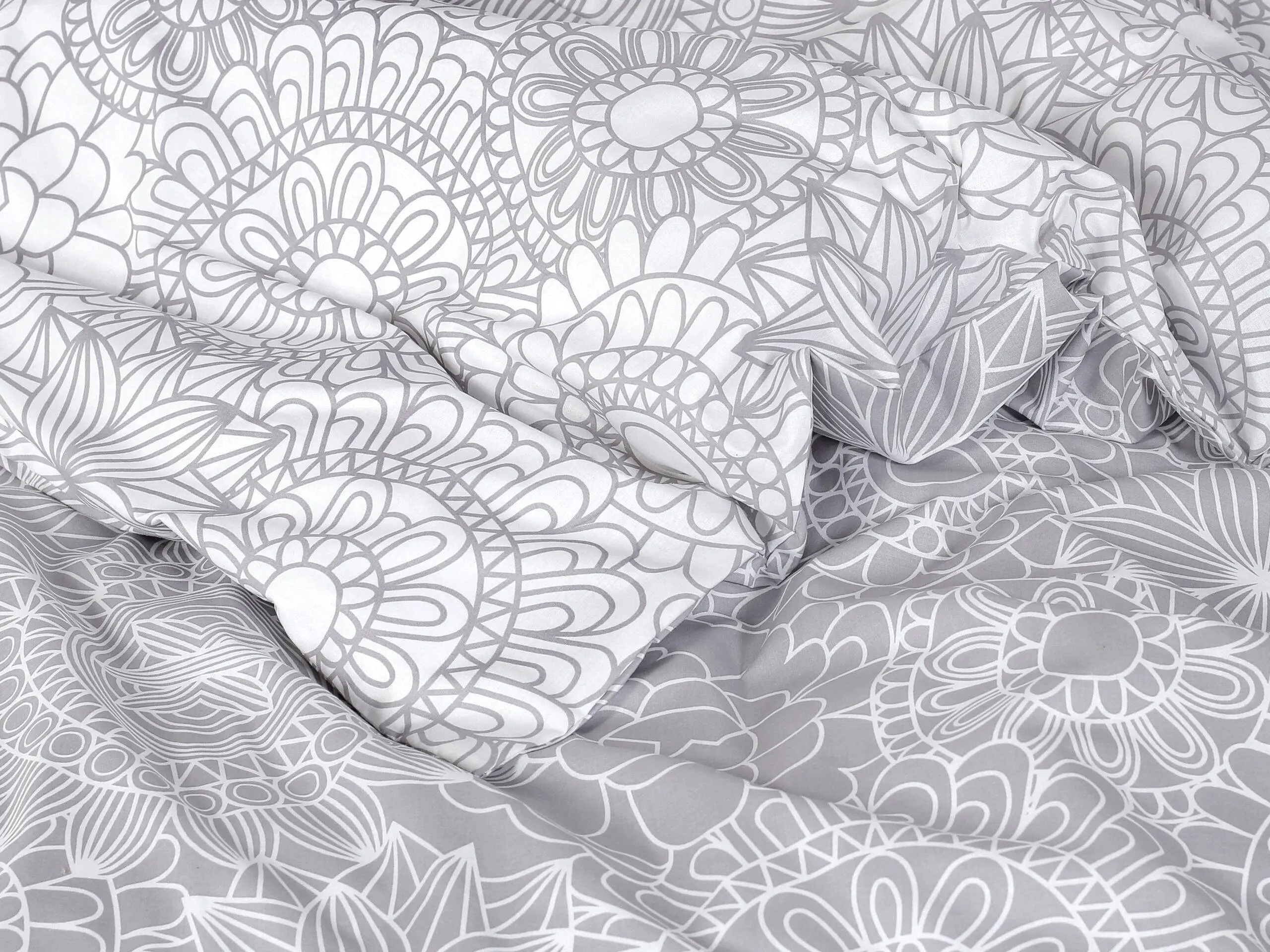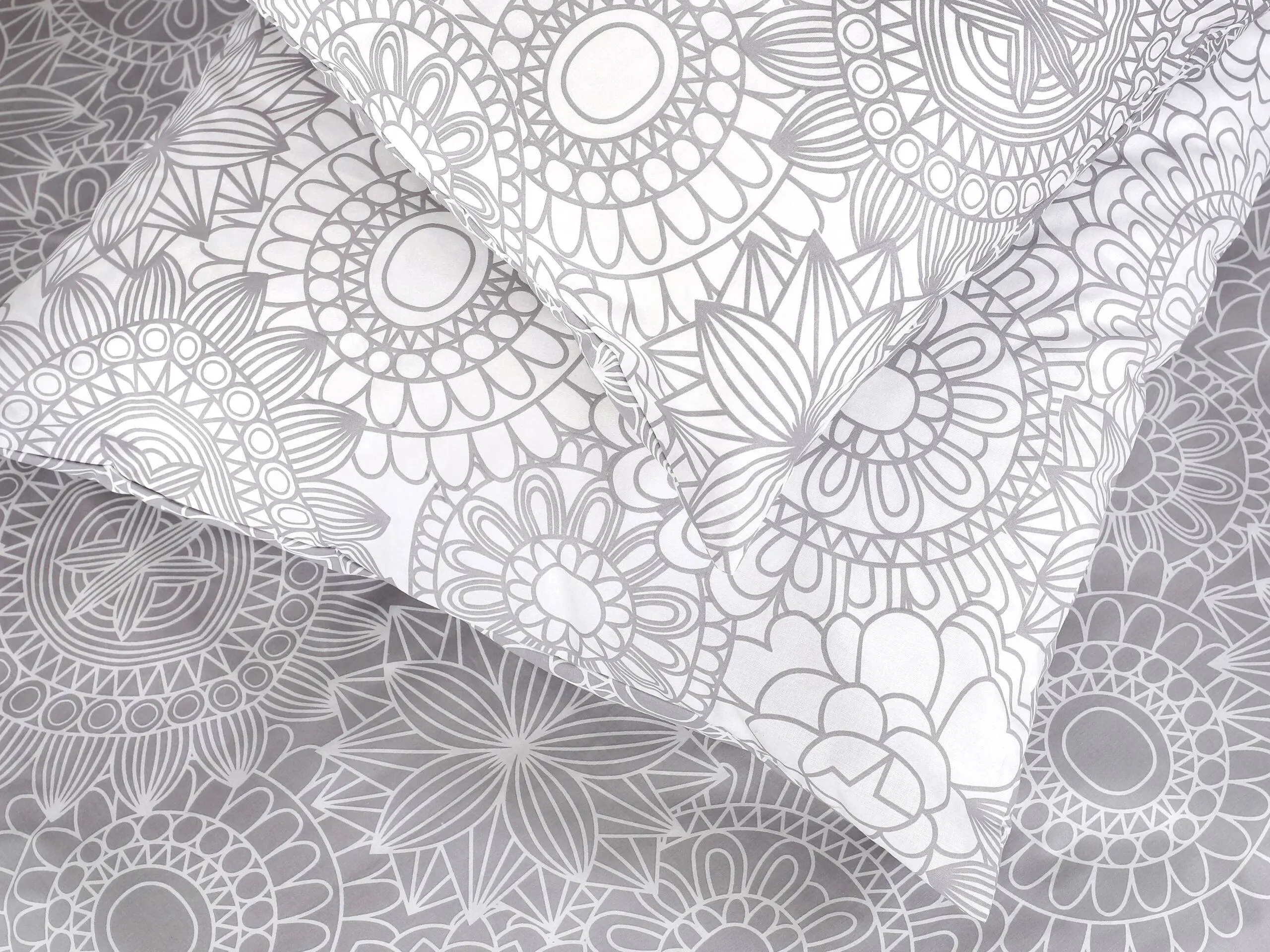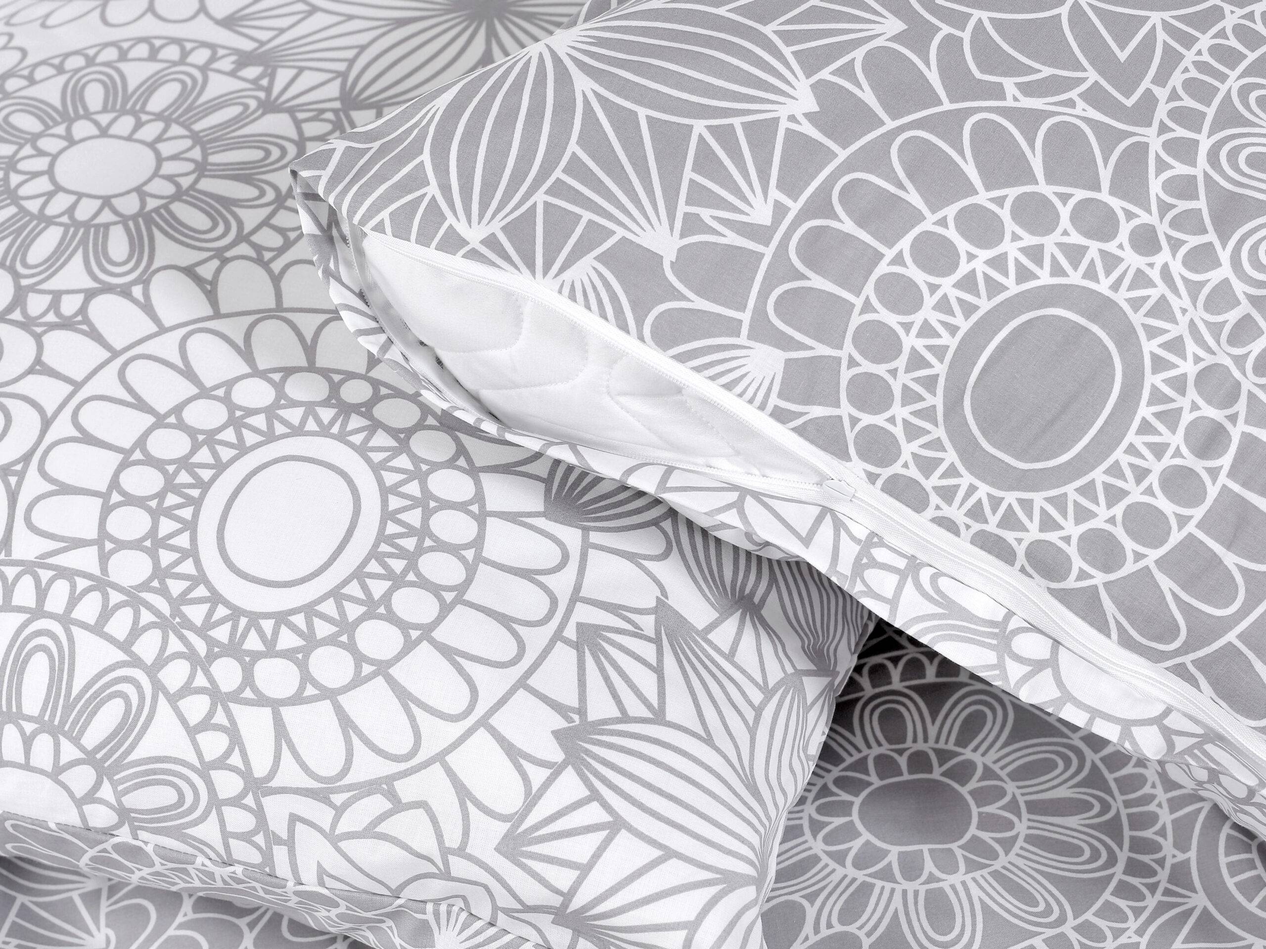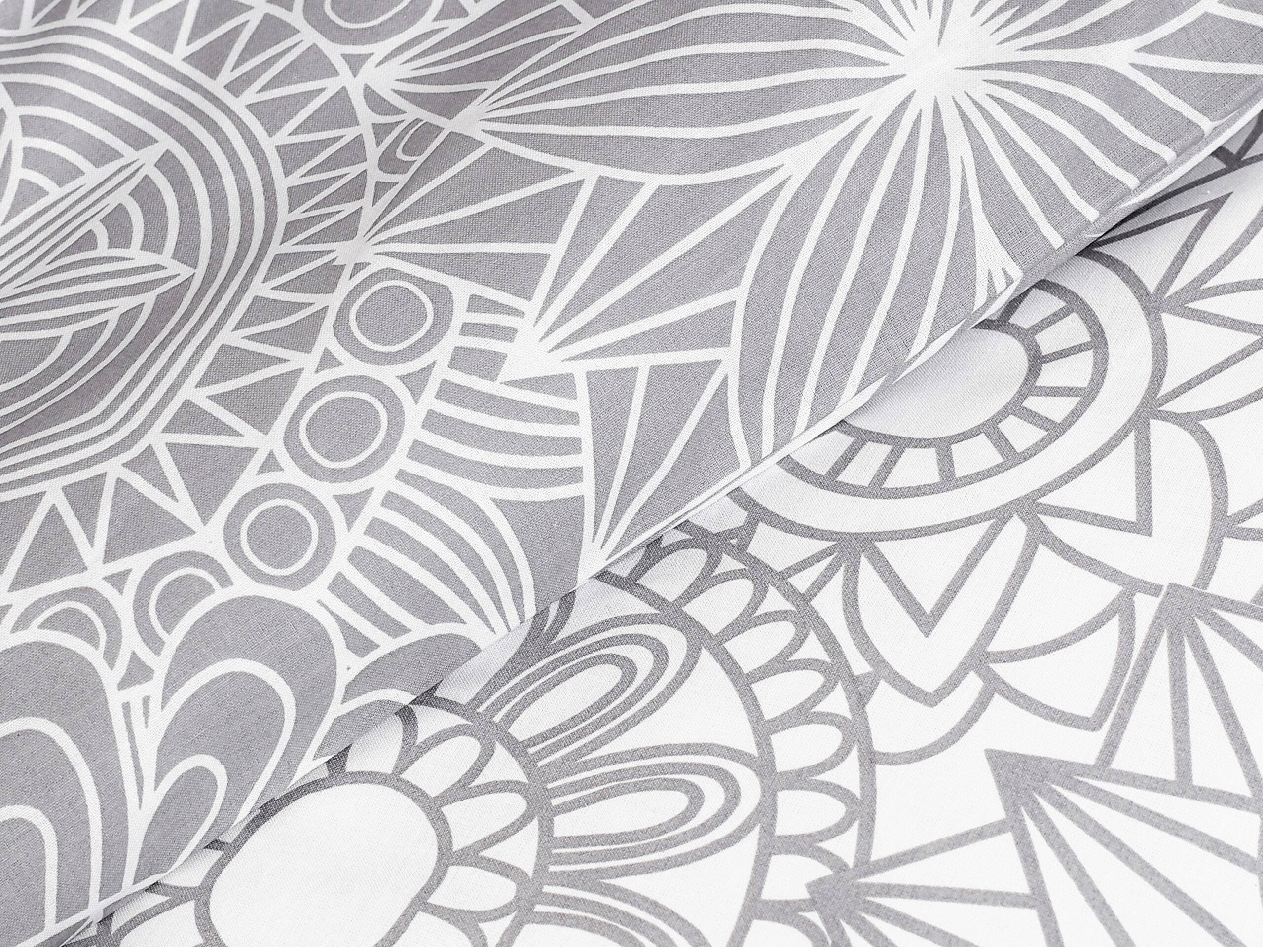 Motiv šedých/ bílých mandal na bílém/ šedém pozadí je variabilní, oboustranně využitelný a přidává povlečení skvělý šarm.