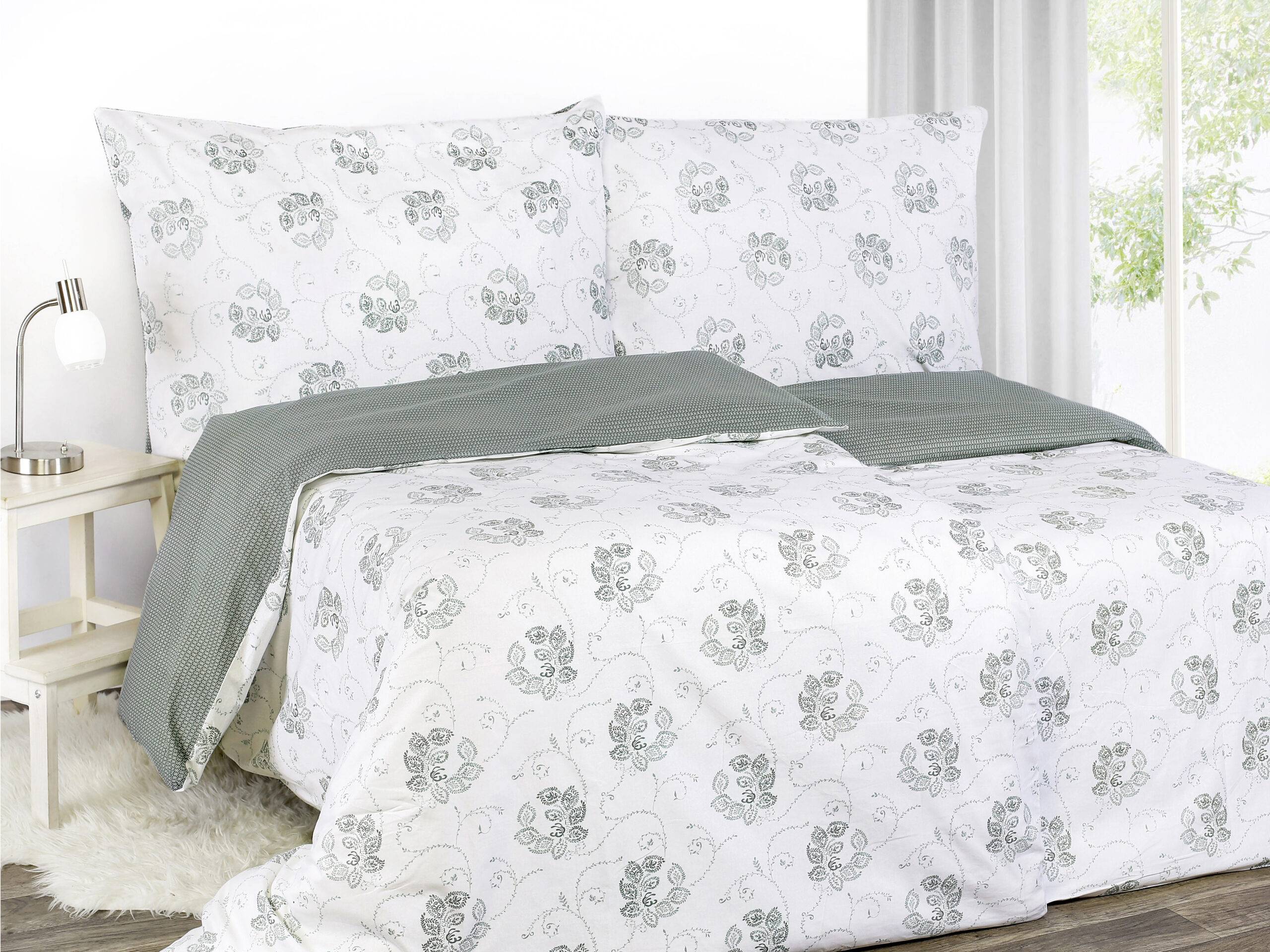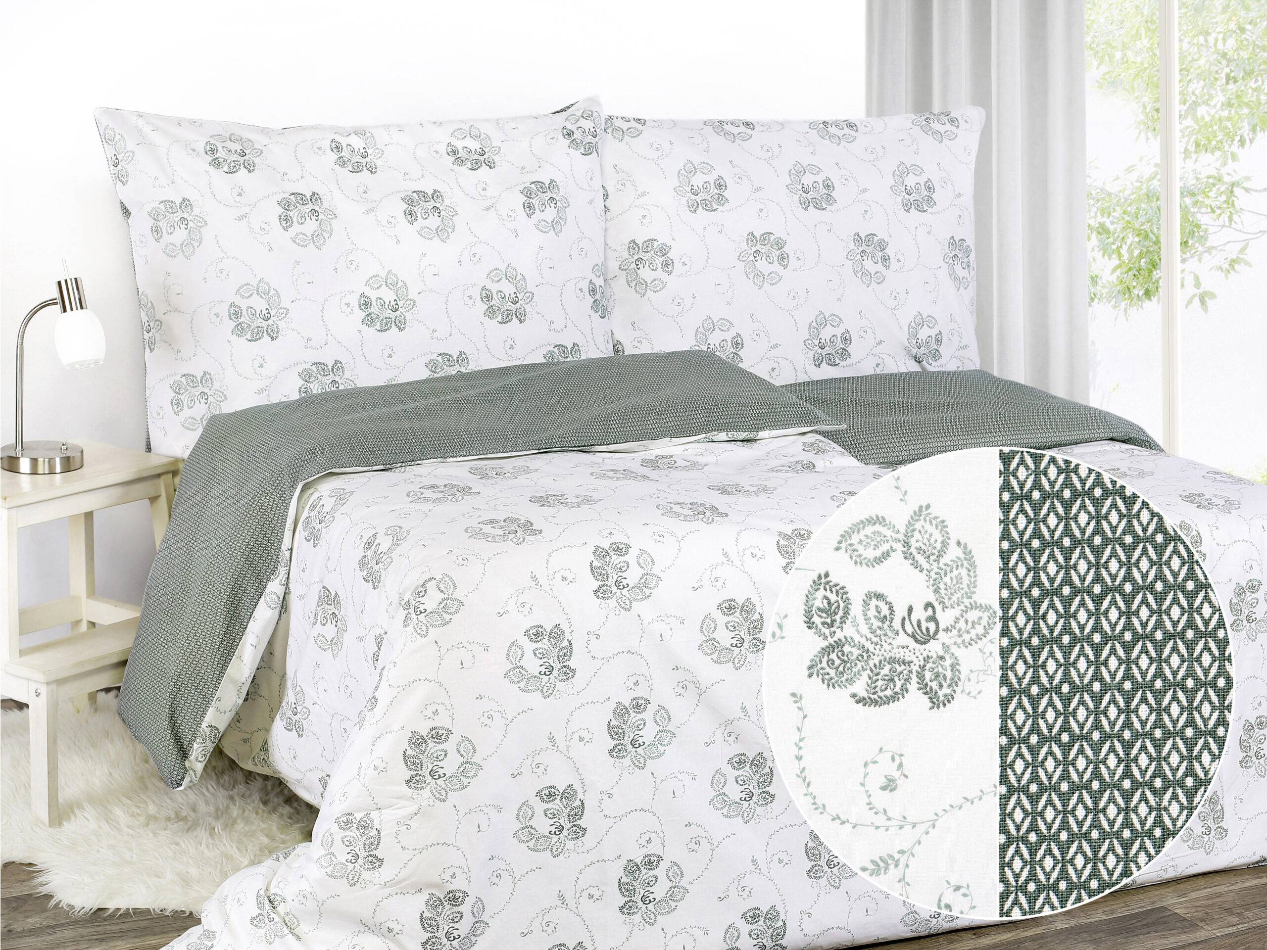 Motiv stylizovaných zelených květů/ geometrických tvarů na bílém/ zeleném pozadí je variabilní, oboustranně využitelný a přidává povlečení skvělý šarm.