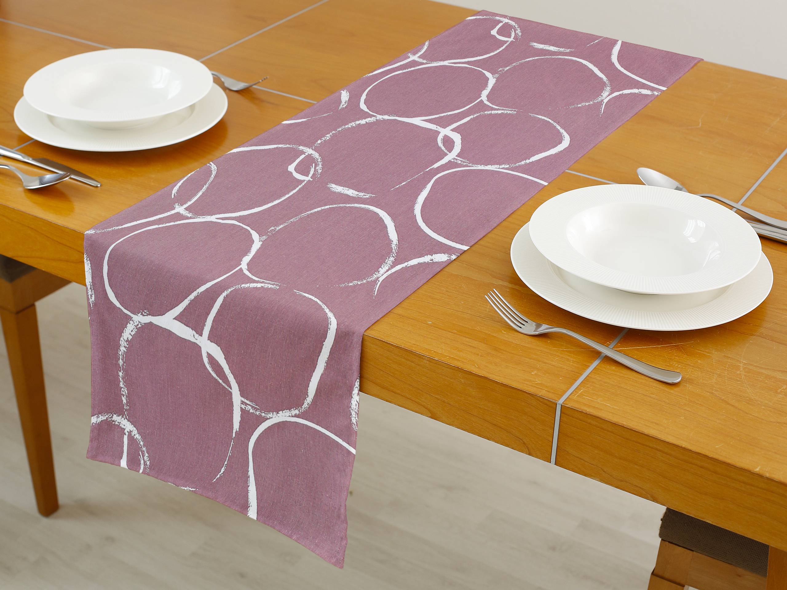 Bavlněný běhoun se vzorem bílých kol na vínové dodá vašemu stolu šmrnc a je zároveň skvělým doplňkem pro každou příležitost. Skvělá investice pro váš jídelní stůl.