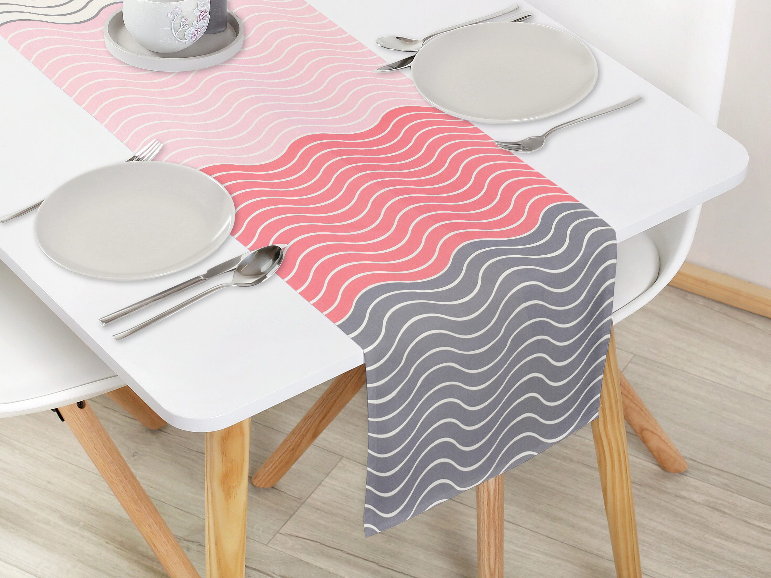 Bavlněný běhoun se vzorem šedých a růžových vlnek dodá vašemu stolu šmrnc a je zároveň skvělým doplňkem pro každou příležitost. Skvělá investice pro váš jídelní stůl.