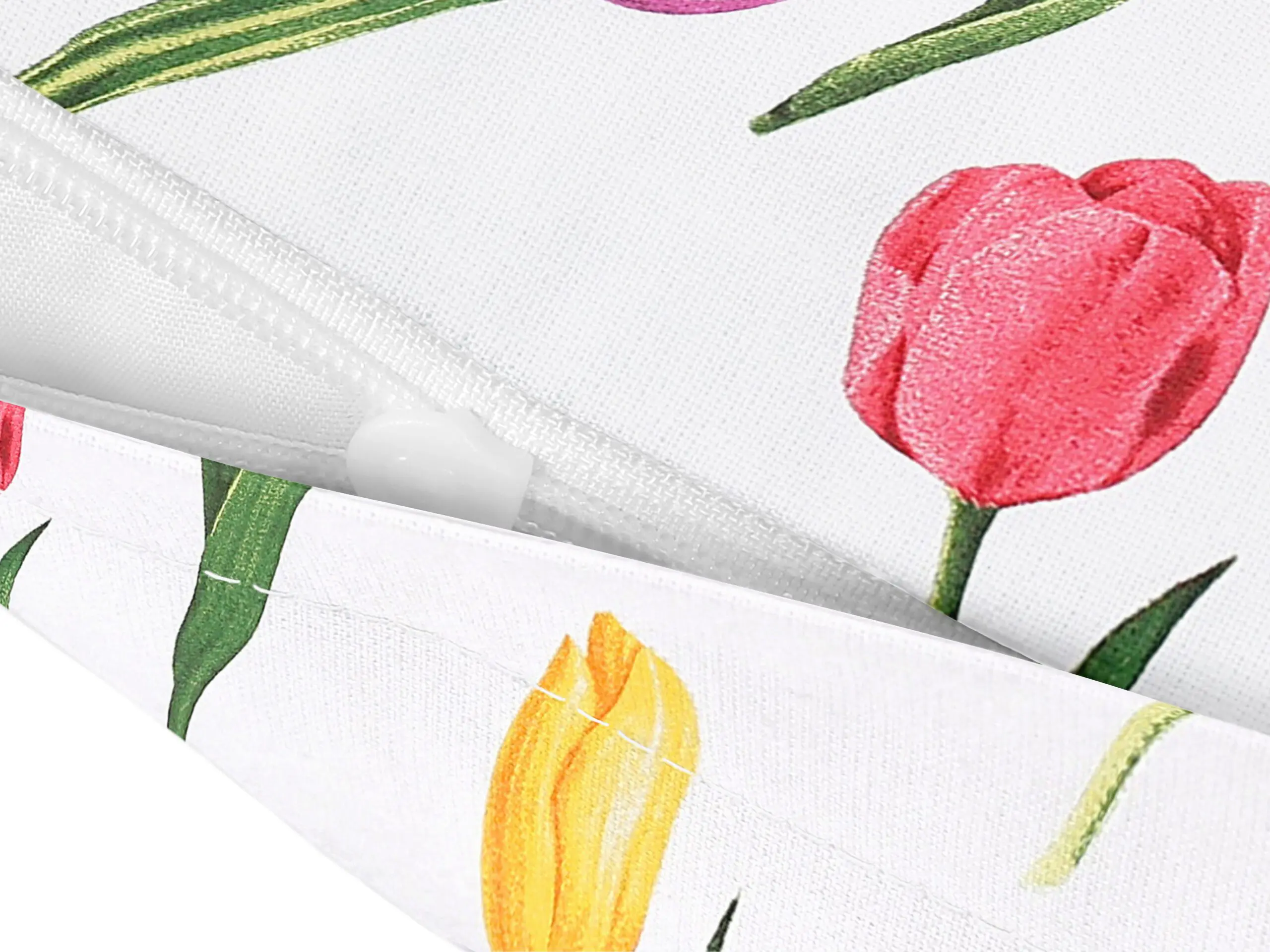 Váš polštář bude zářit díky vzoru s tulipány. Povlak má praktické zapínání na zip, který je elegantně skrytý pod látkou.
