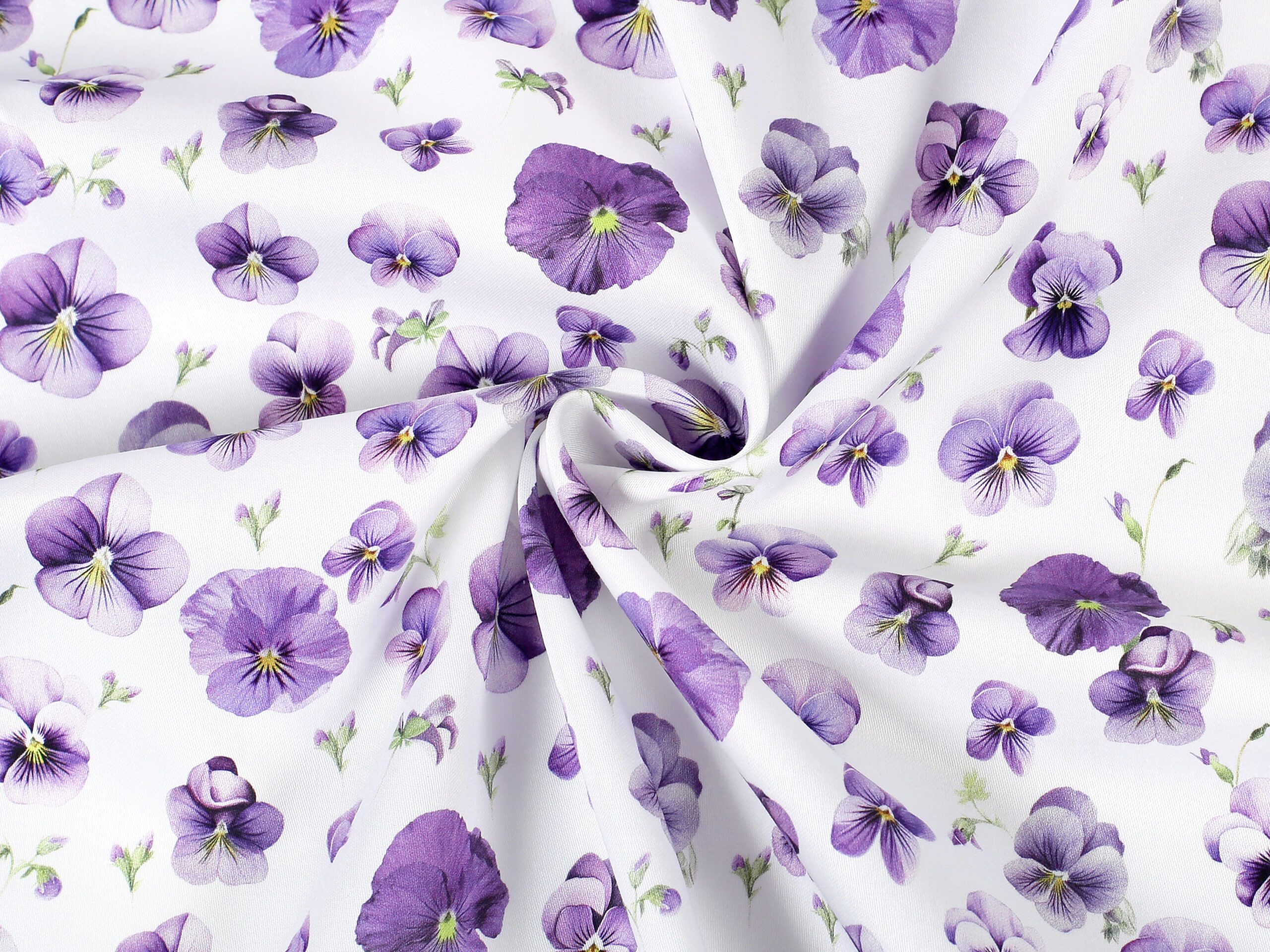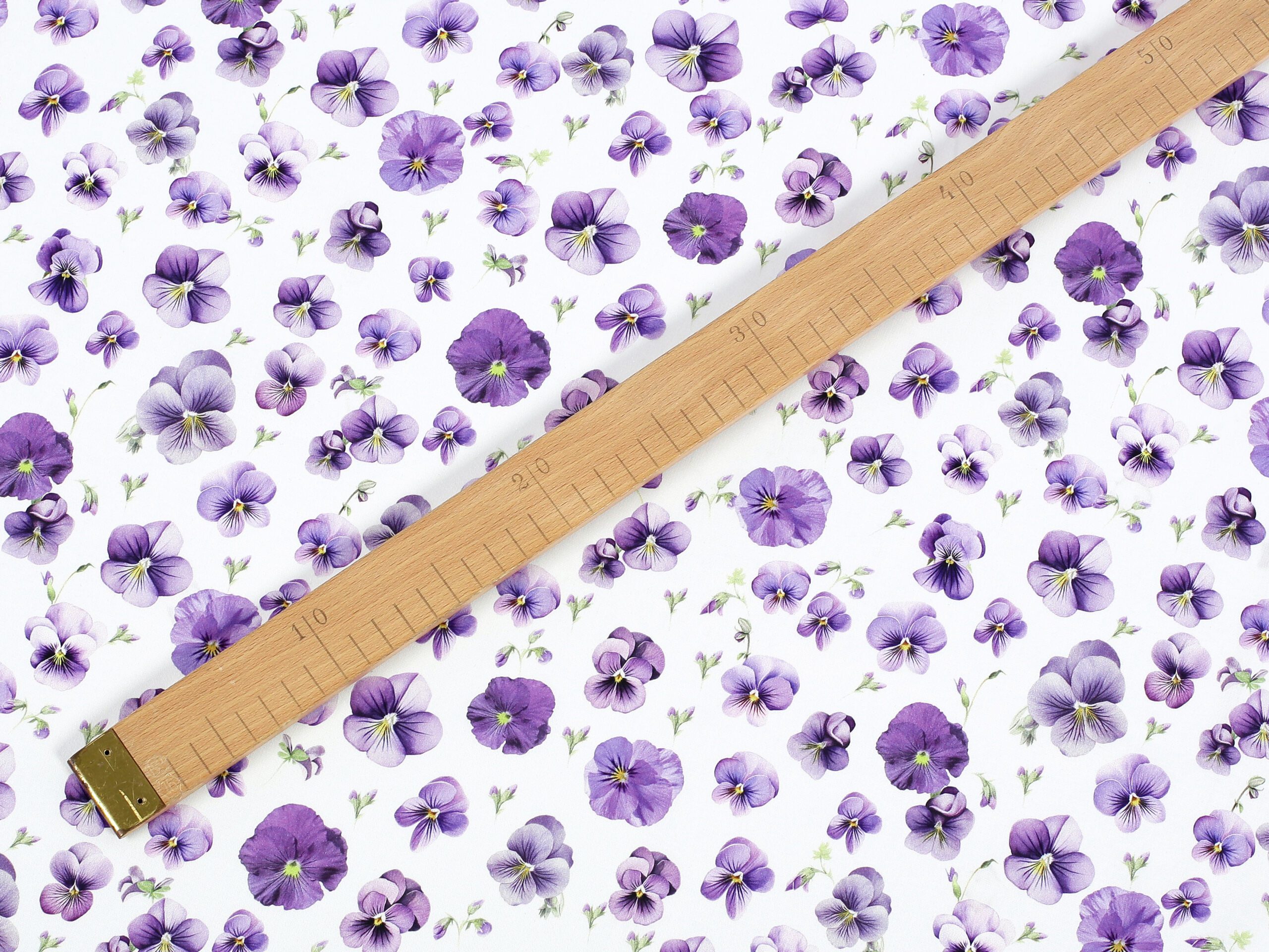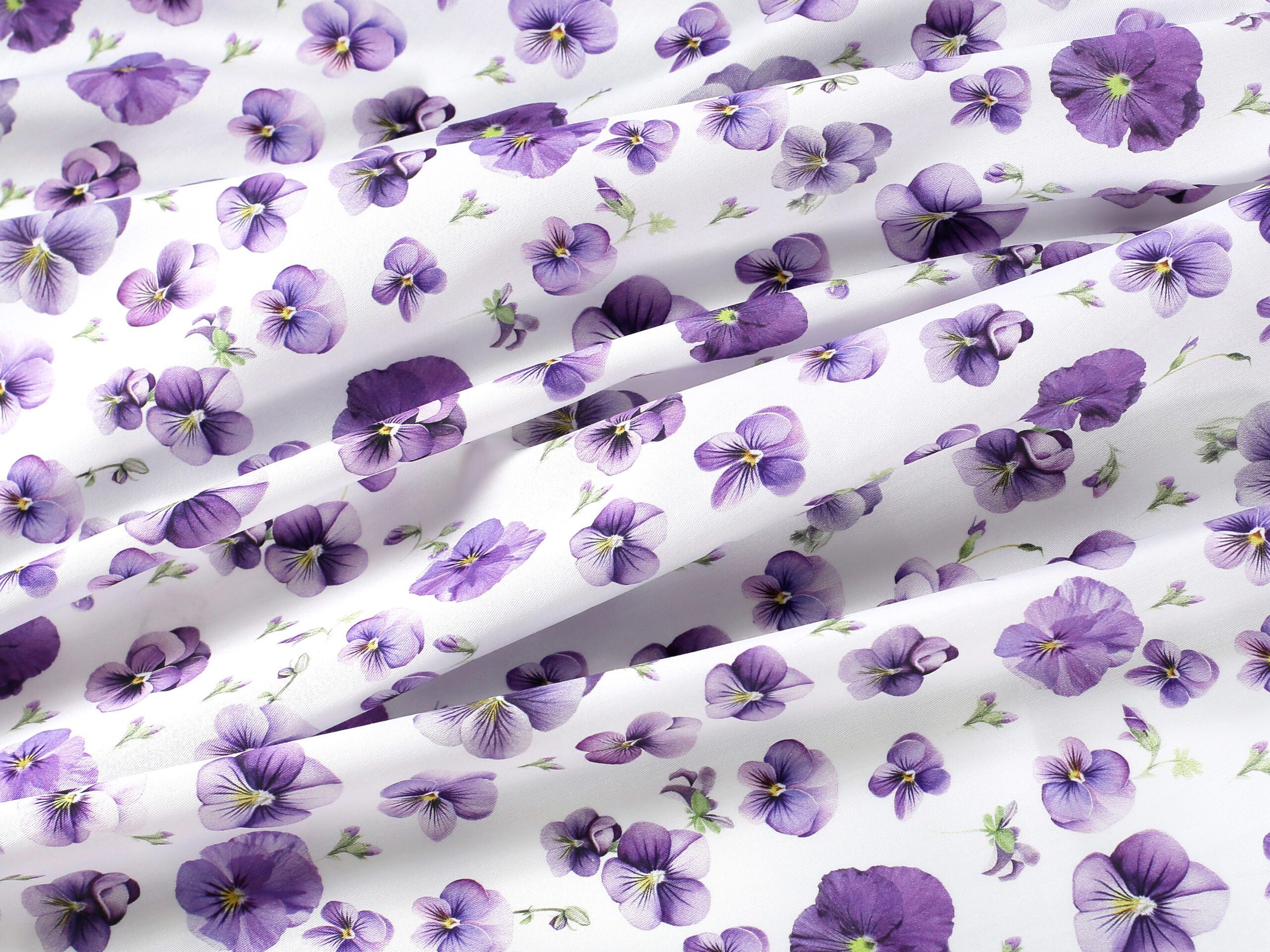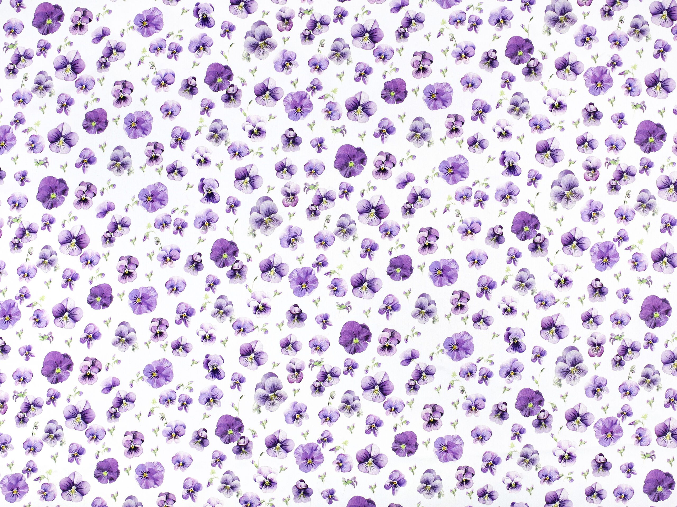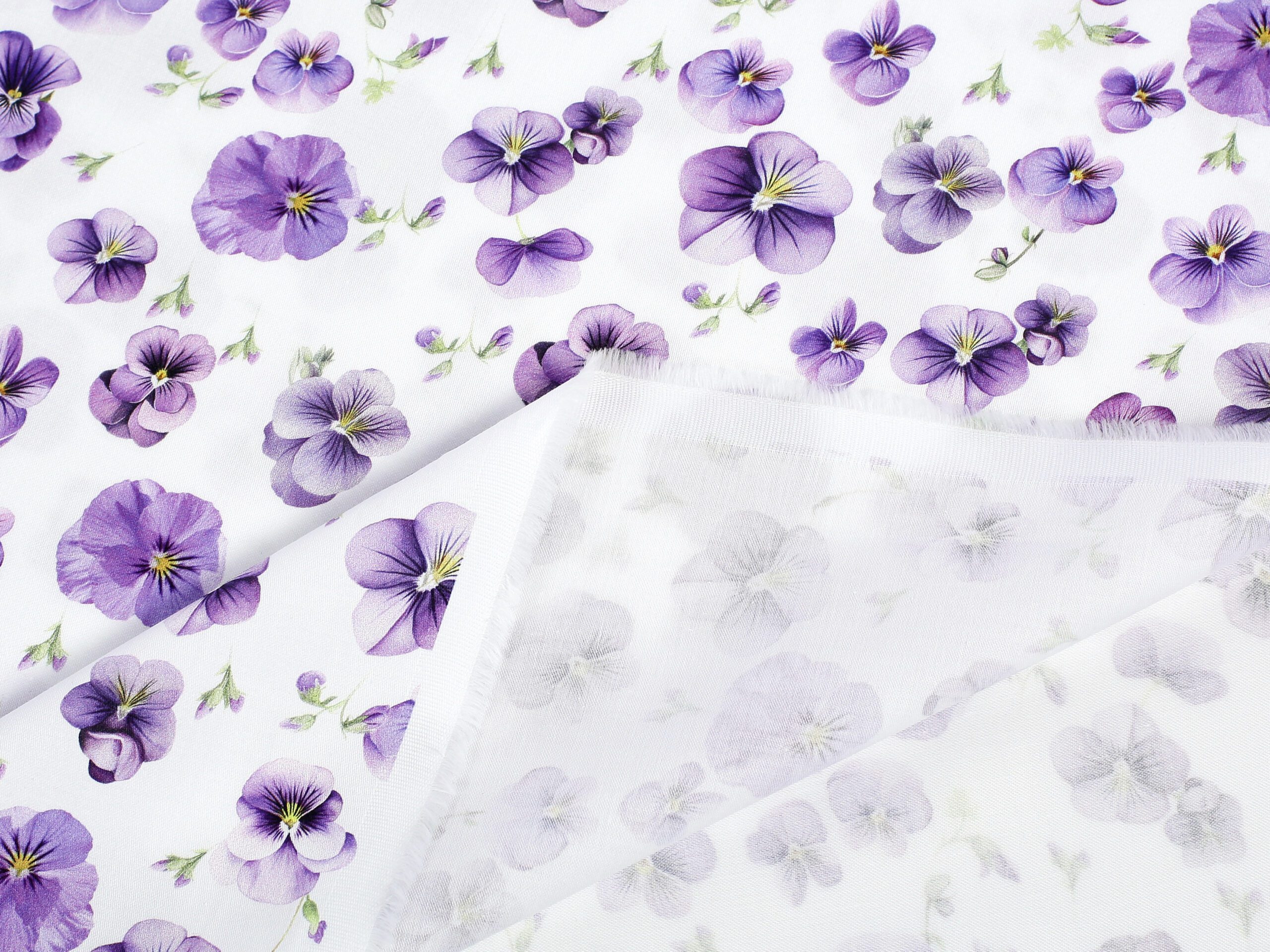 Tato látka je k dispozici v krásném vzoru s fialkovými maceškami na podkladové bílé barvě.