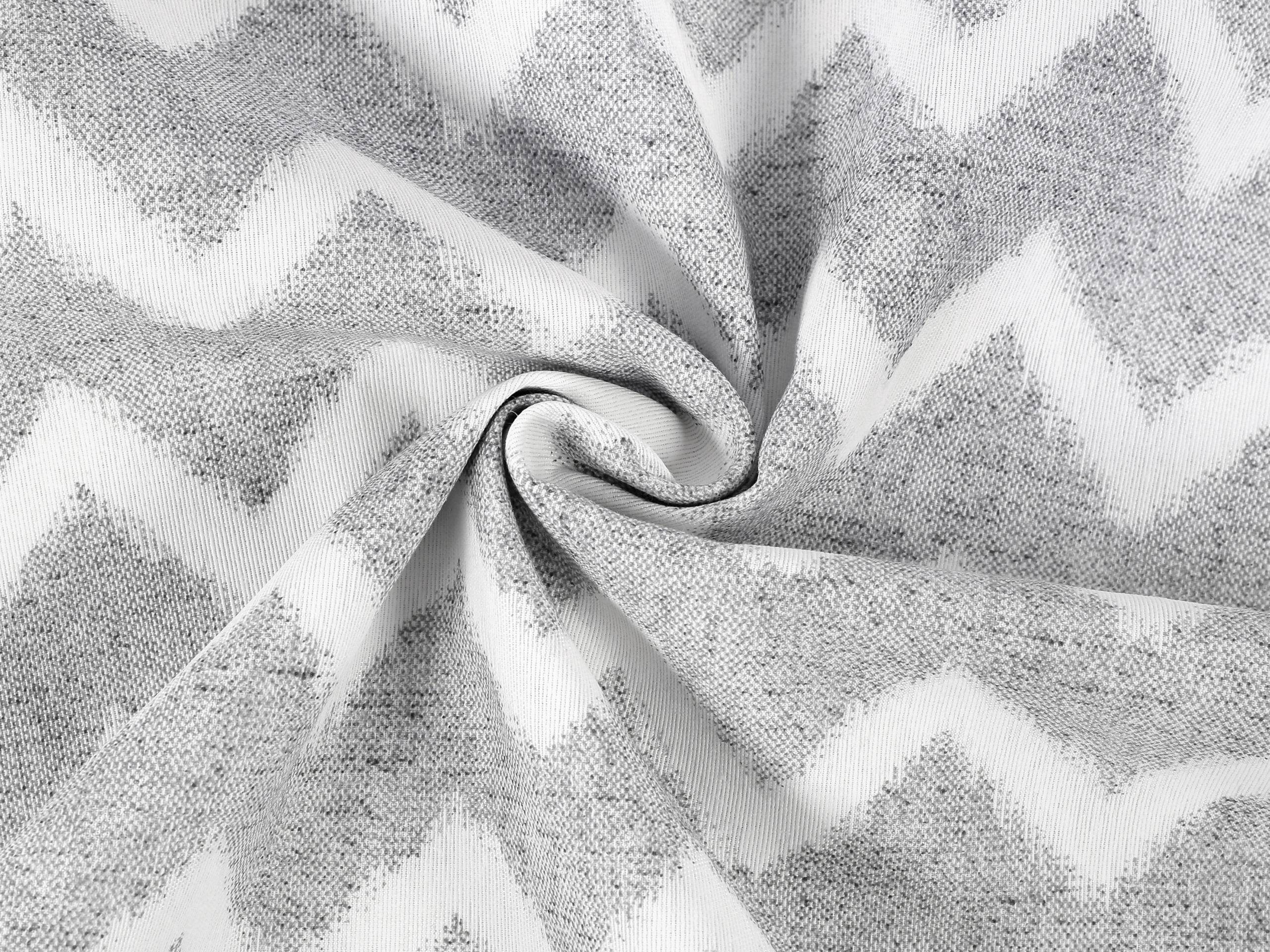 Dekorační látka LONETA cikcak na šedé je vyrobena z pevné směsi bavlny 55% a polyesteru 45%, s gramáží 190 g/m2.