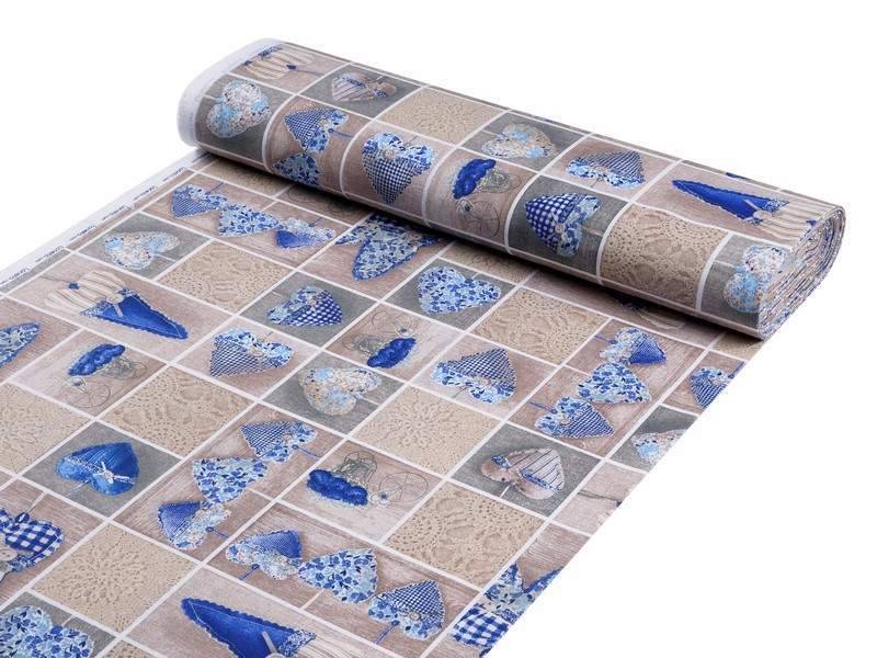 Nabízíme ji v šíři 140 cm a je k dispozici v krásném vzoru modrá srdce a podkladové hnědé barvě.