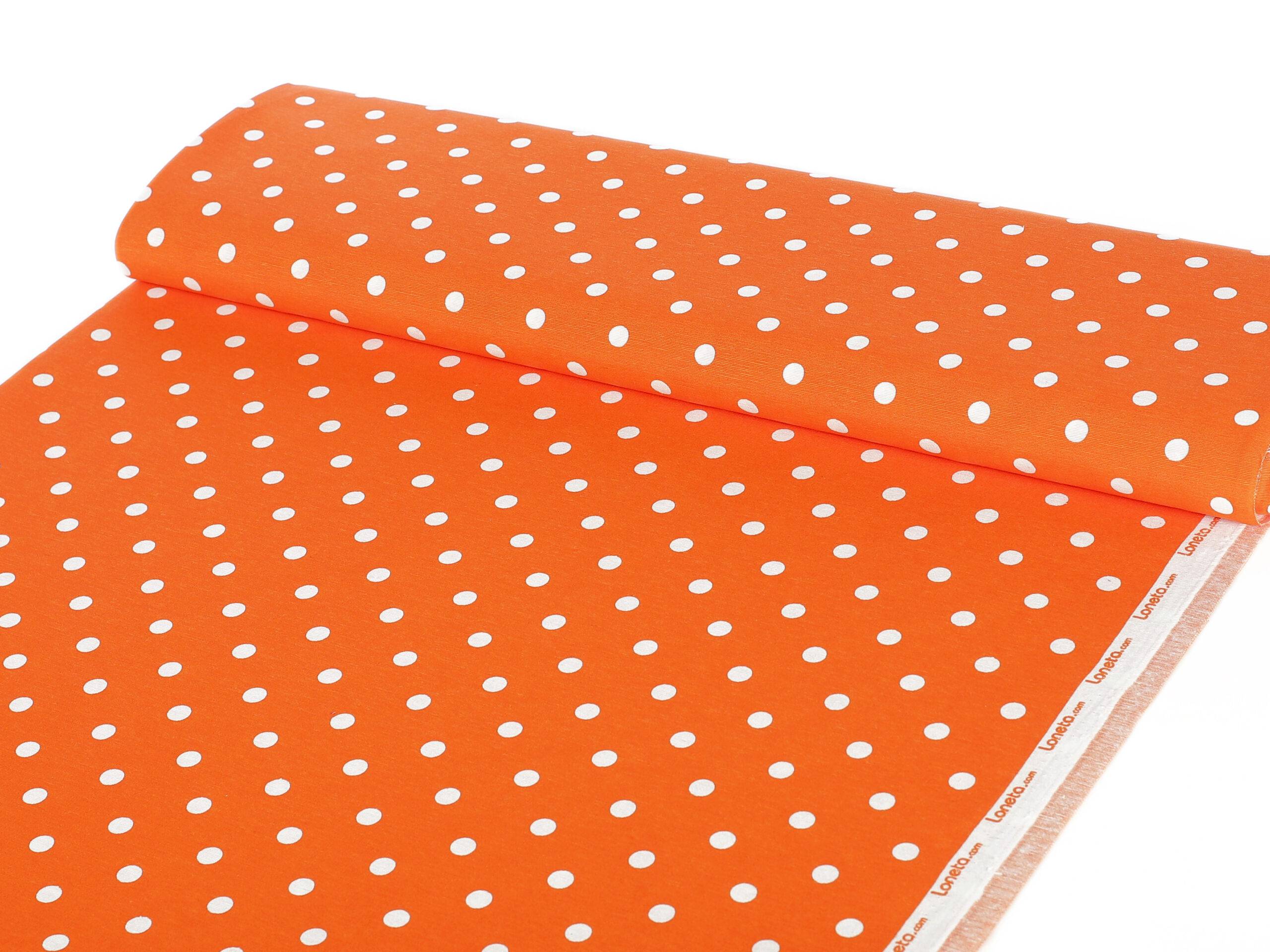 Dekorační látka LONETA puntíky na oranžové je vyrobena z pevné směsi bavlny 55% a polyesteru 45%, s gramáží 190 g/m2.