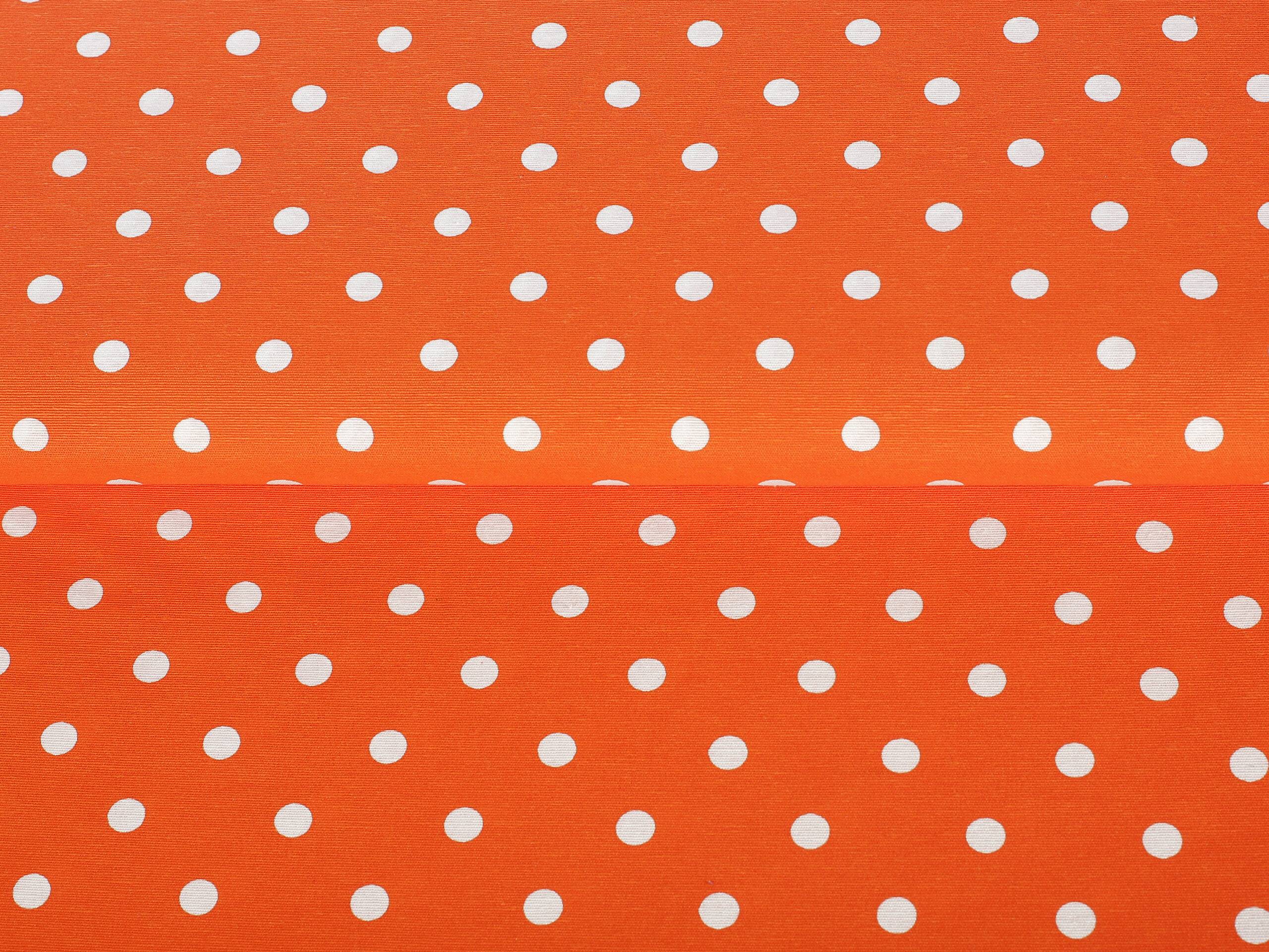 Nabízíme ji v šíři 140 cm a je k dispozici v krásném vzoru bílé puntíky a podkladové oranžové barvě.