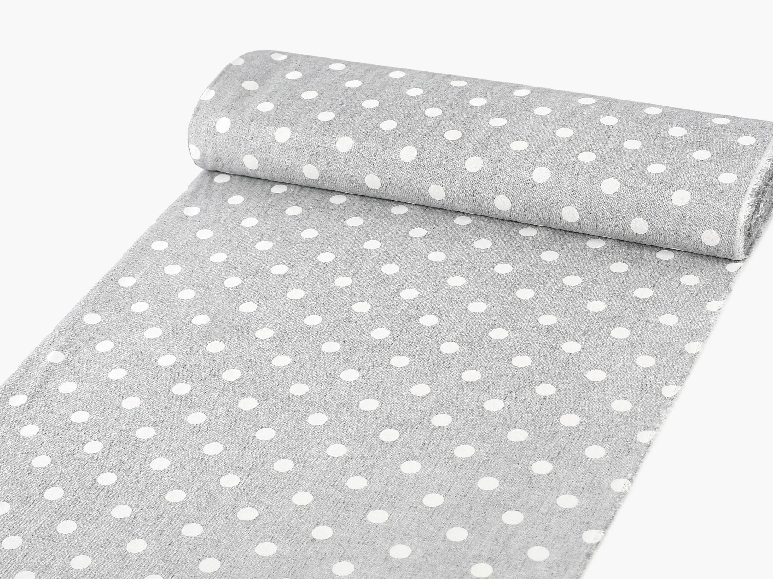 Dekorační látka LONETA puntíky na šedé je vyrobena z pevné směsi bavlny 55% a polyesteru 45%, s gramáží 190 g/m2.