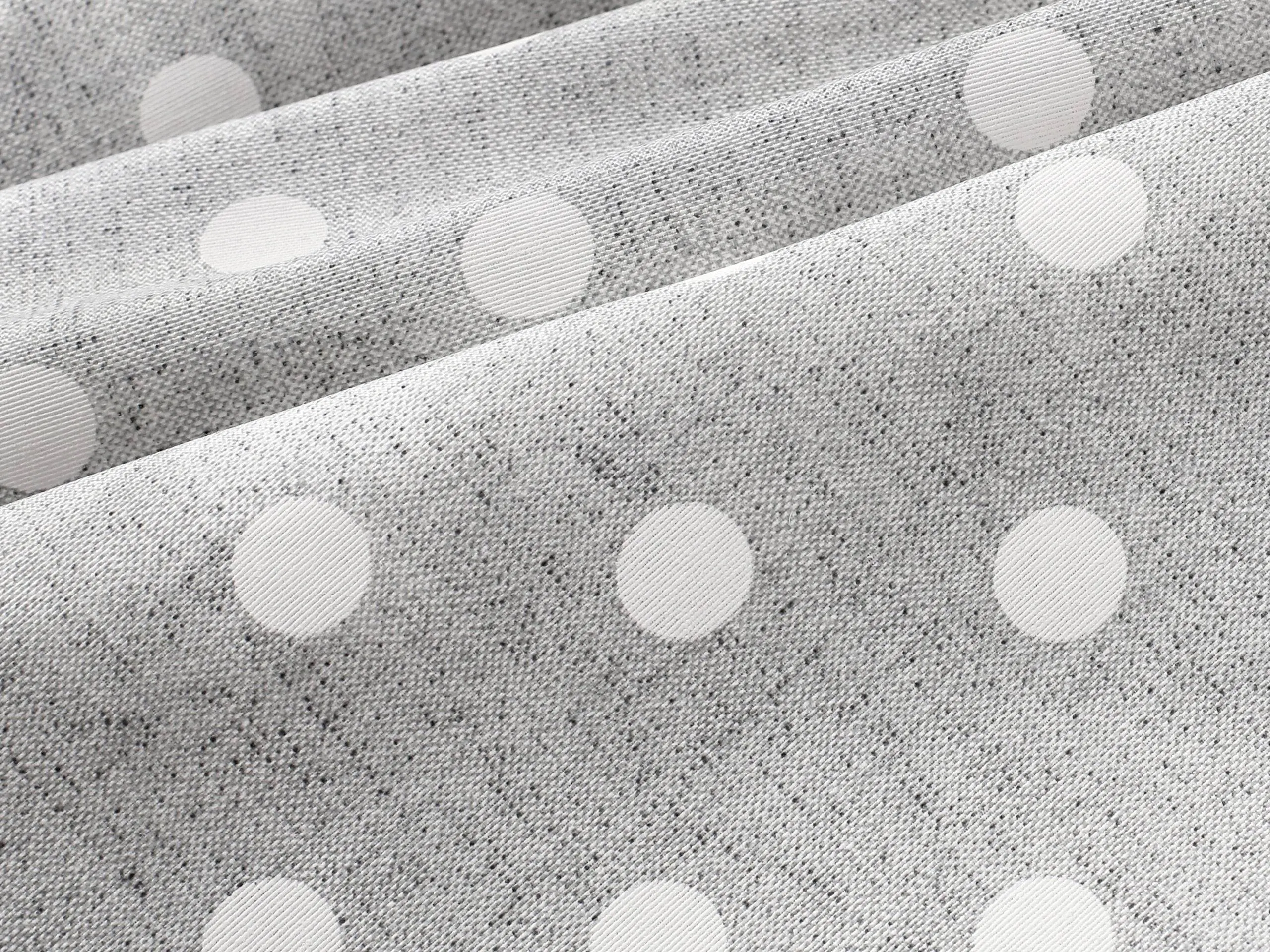 Nabízíme ji v šíři 140 cm a je k dispozici v krásném vzoru bílé puntíky a podkladové šedé barvě.