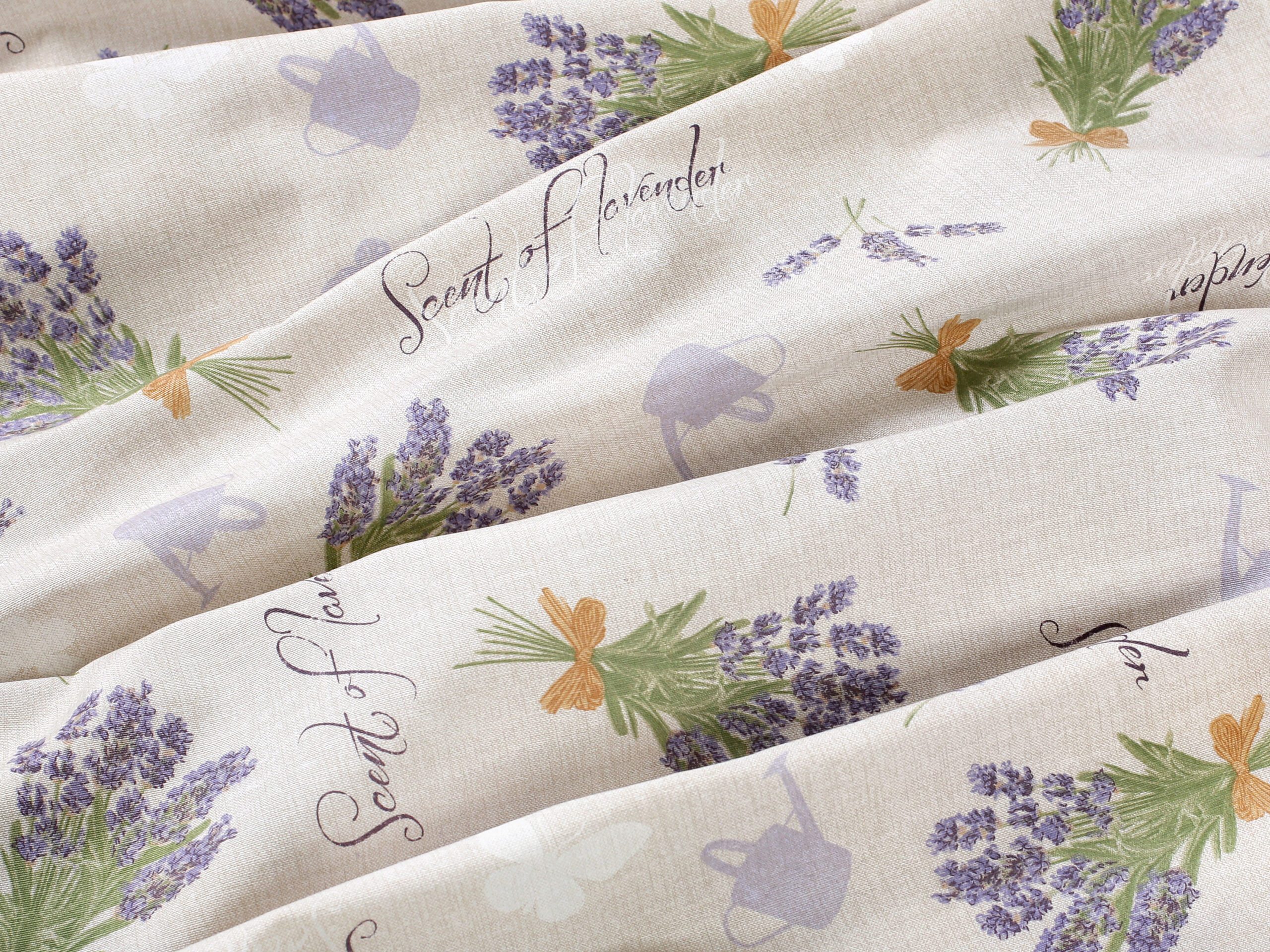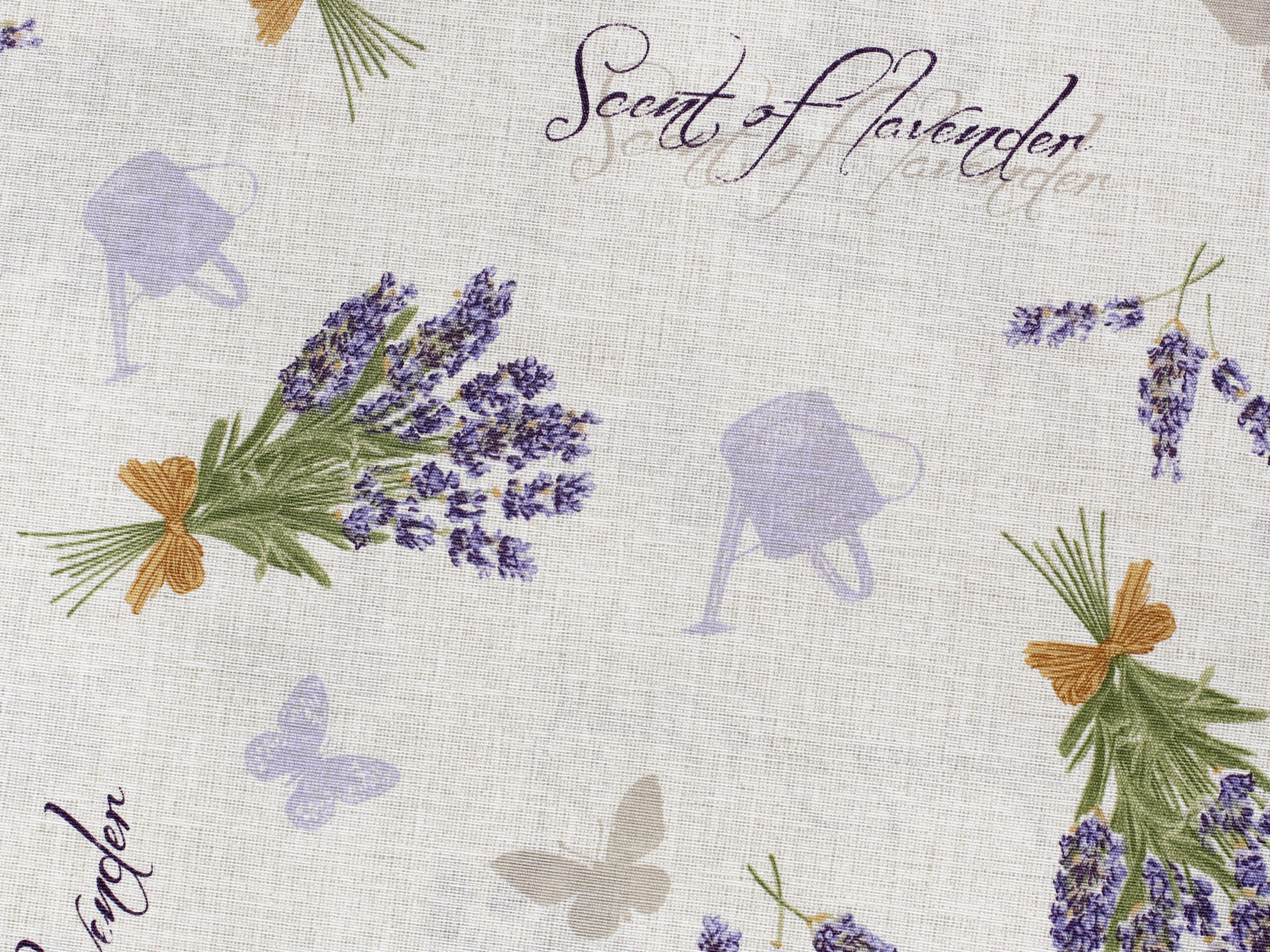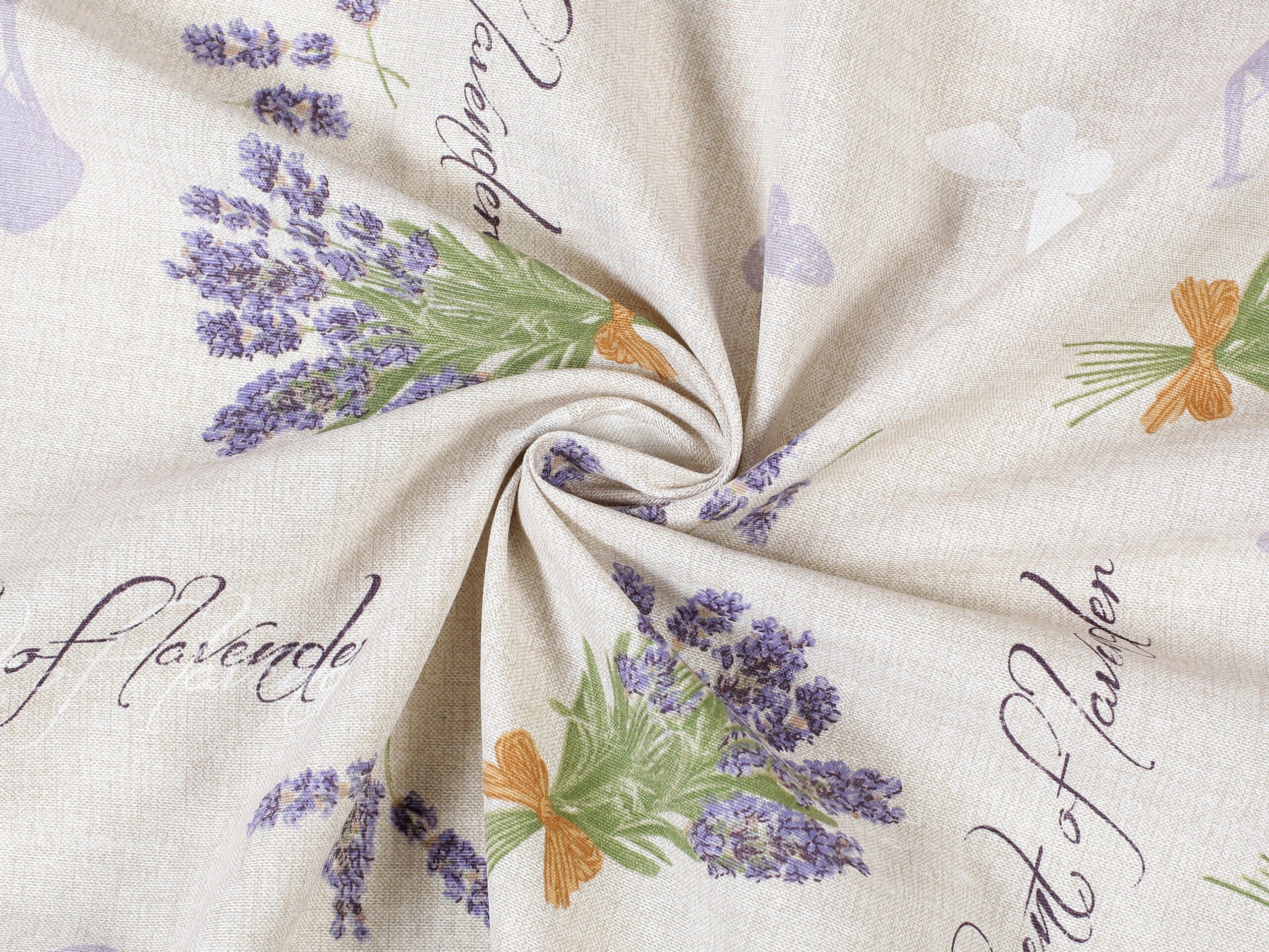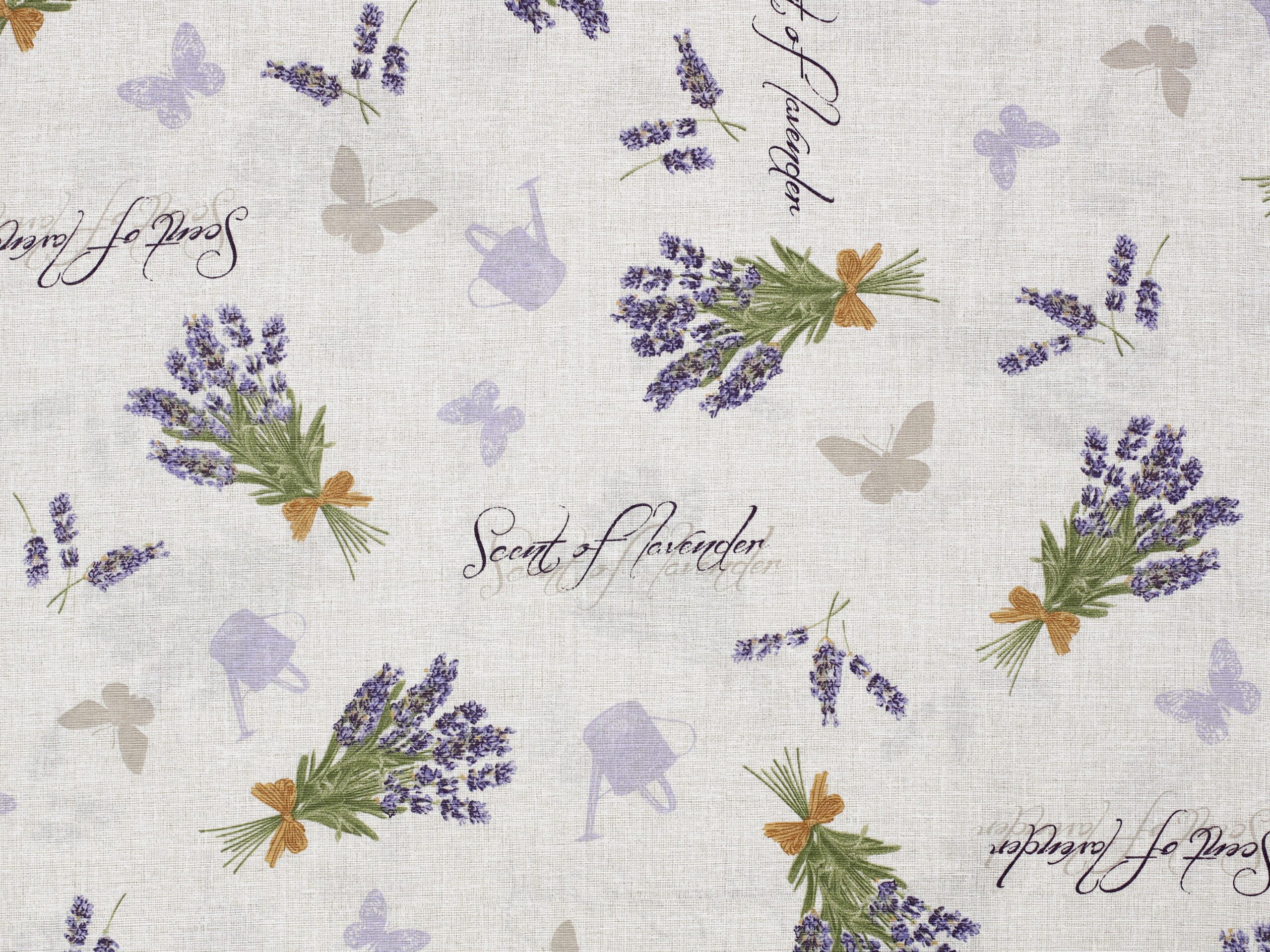 Nabízíme ji v šíři 140 cm a je k dispozici v krásném vzoru s trsy levandule na režném podkladu.