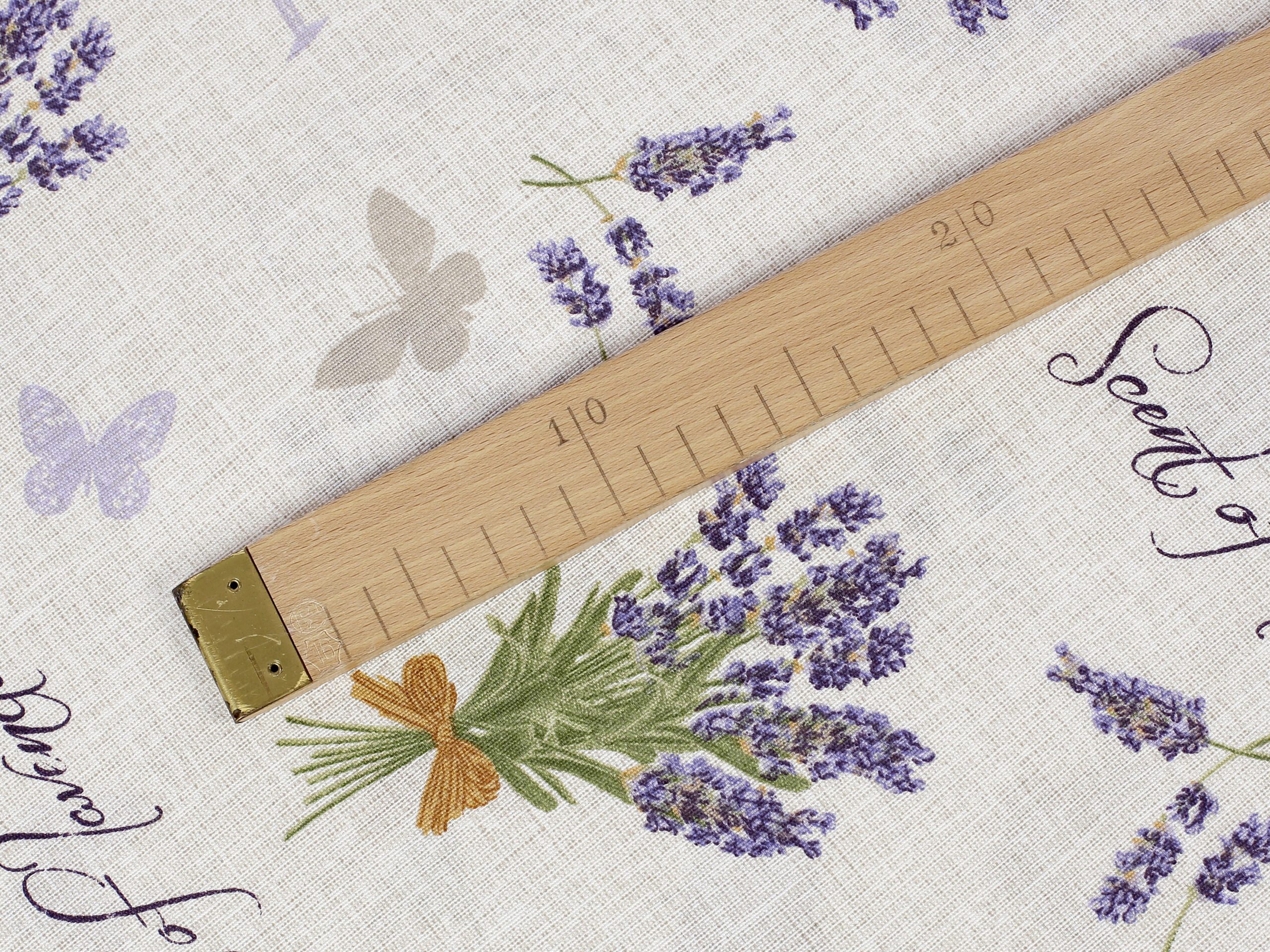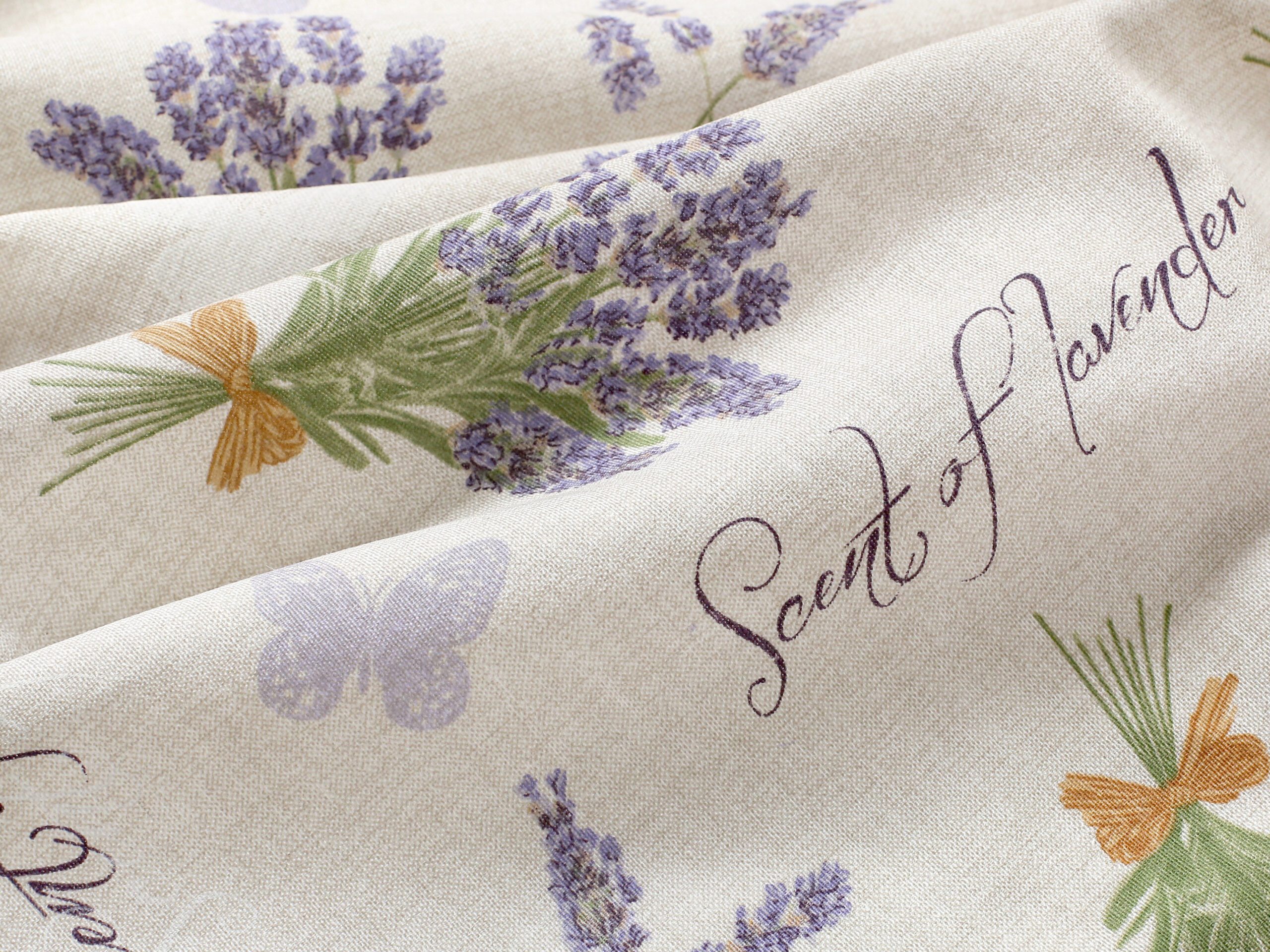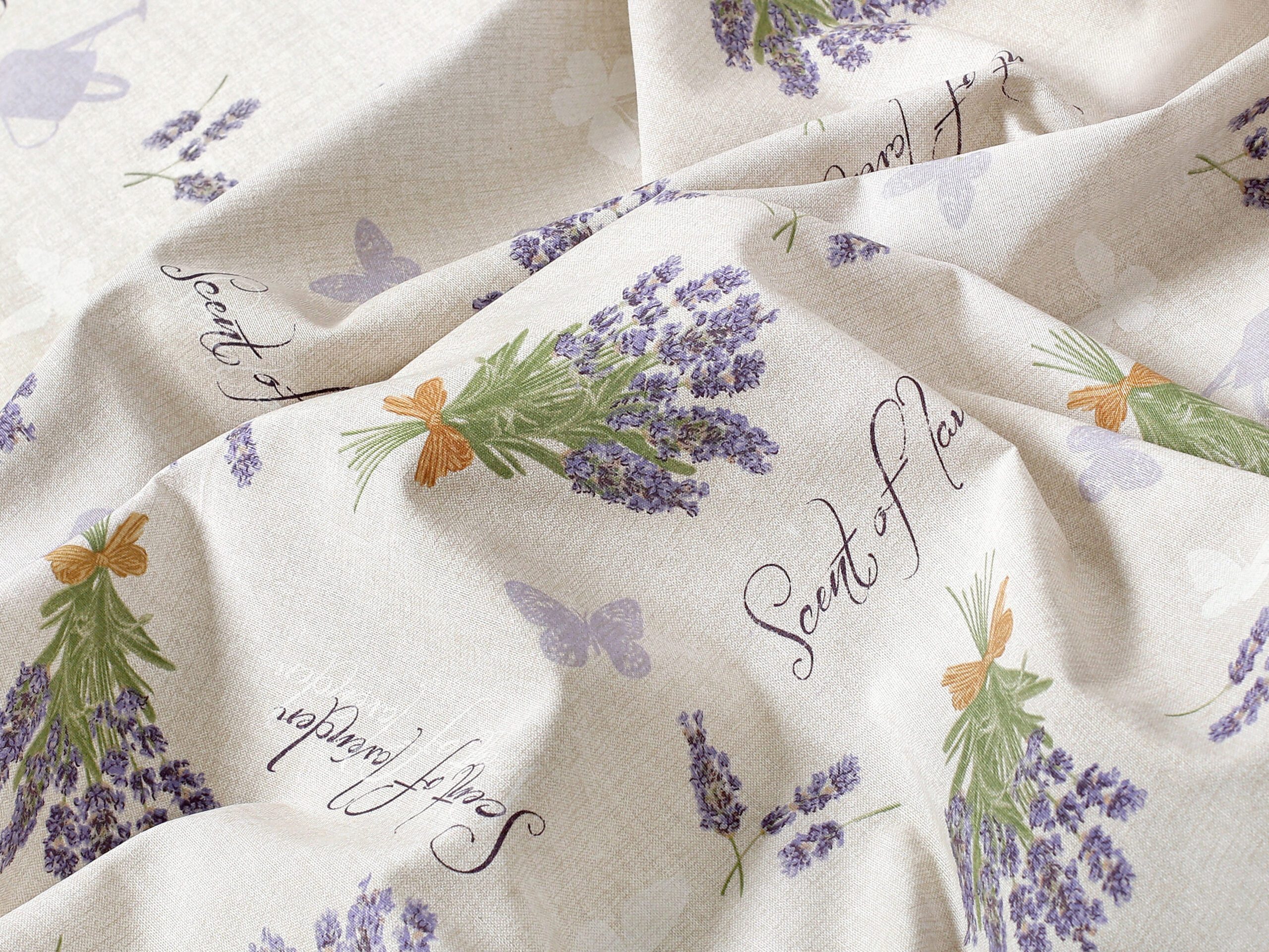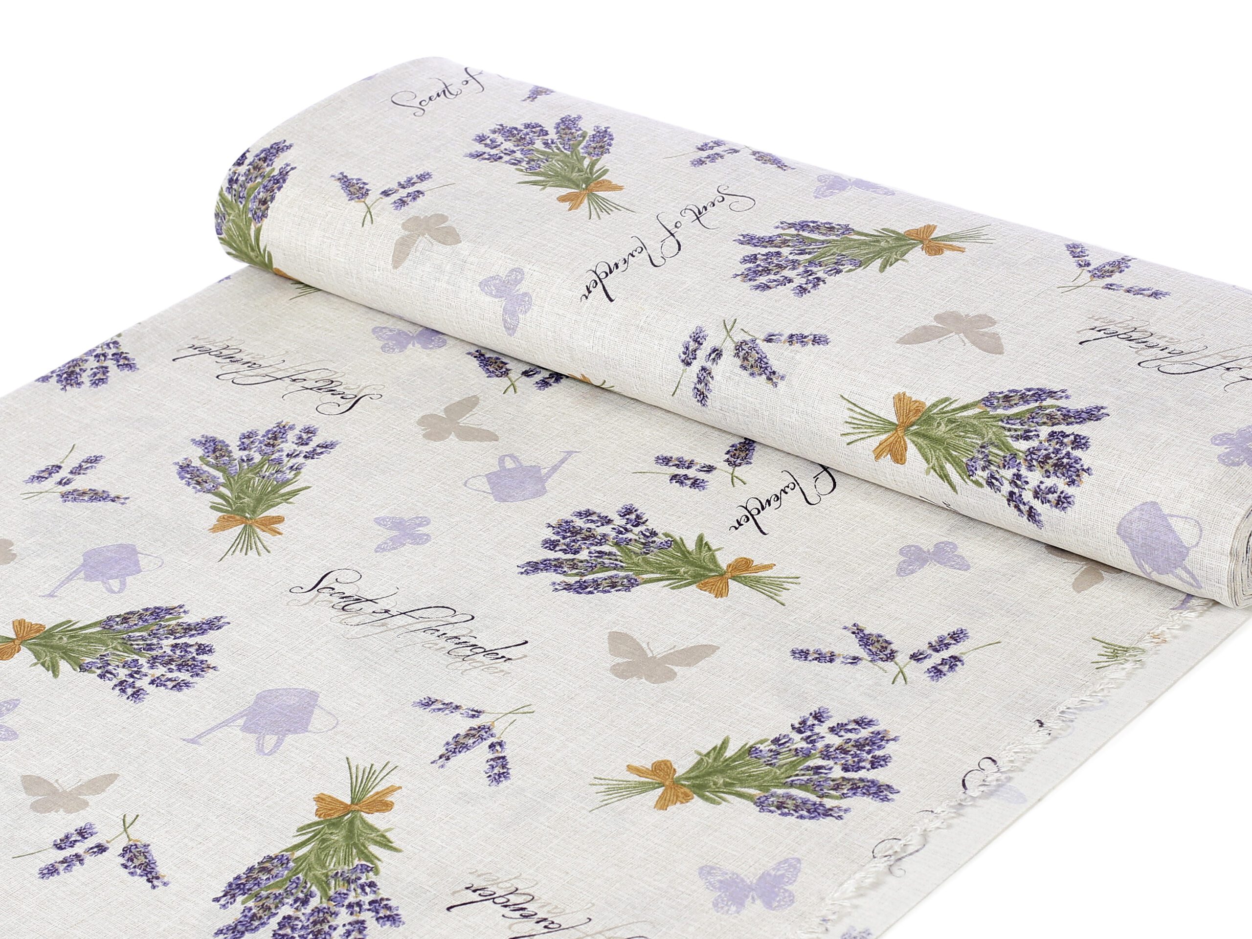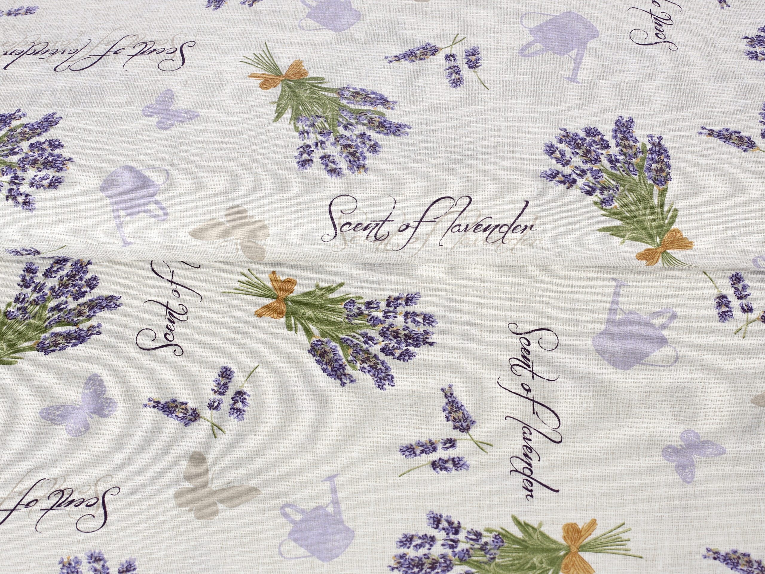 Nabízíme ji v šíři 140 cm a je k dispozici v krásném vzoru s trsy levandule na režném podkladu.