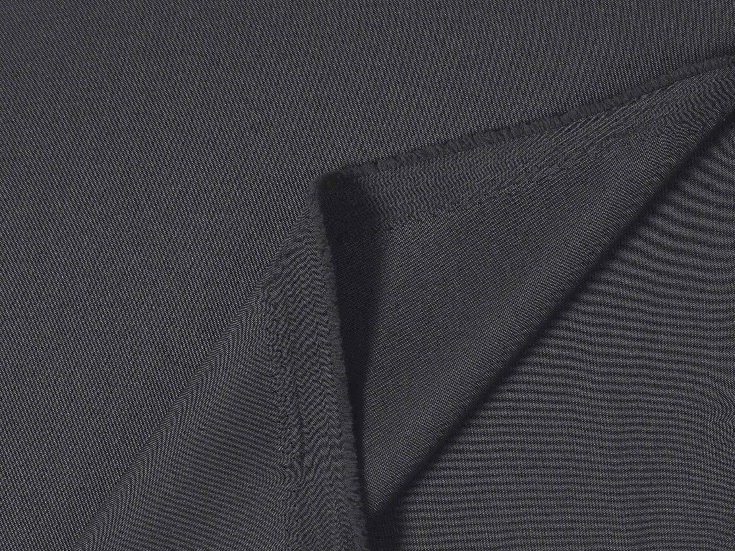 Tmavě šedá metráž rongo má plátnovou vazbu. Díky jejímu složení je hladká, nemačkavá a barevně stálá.