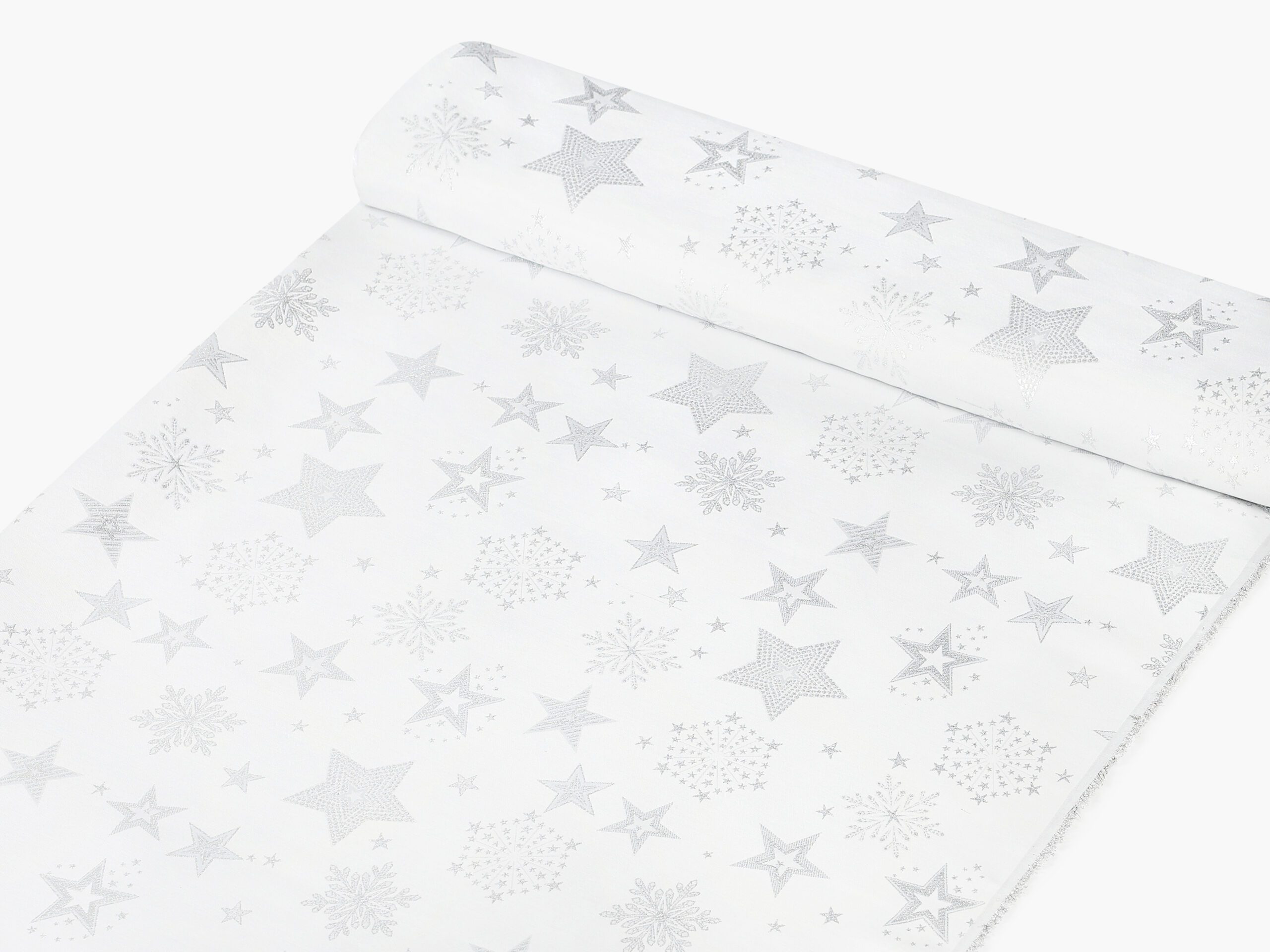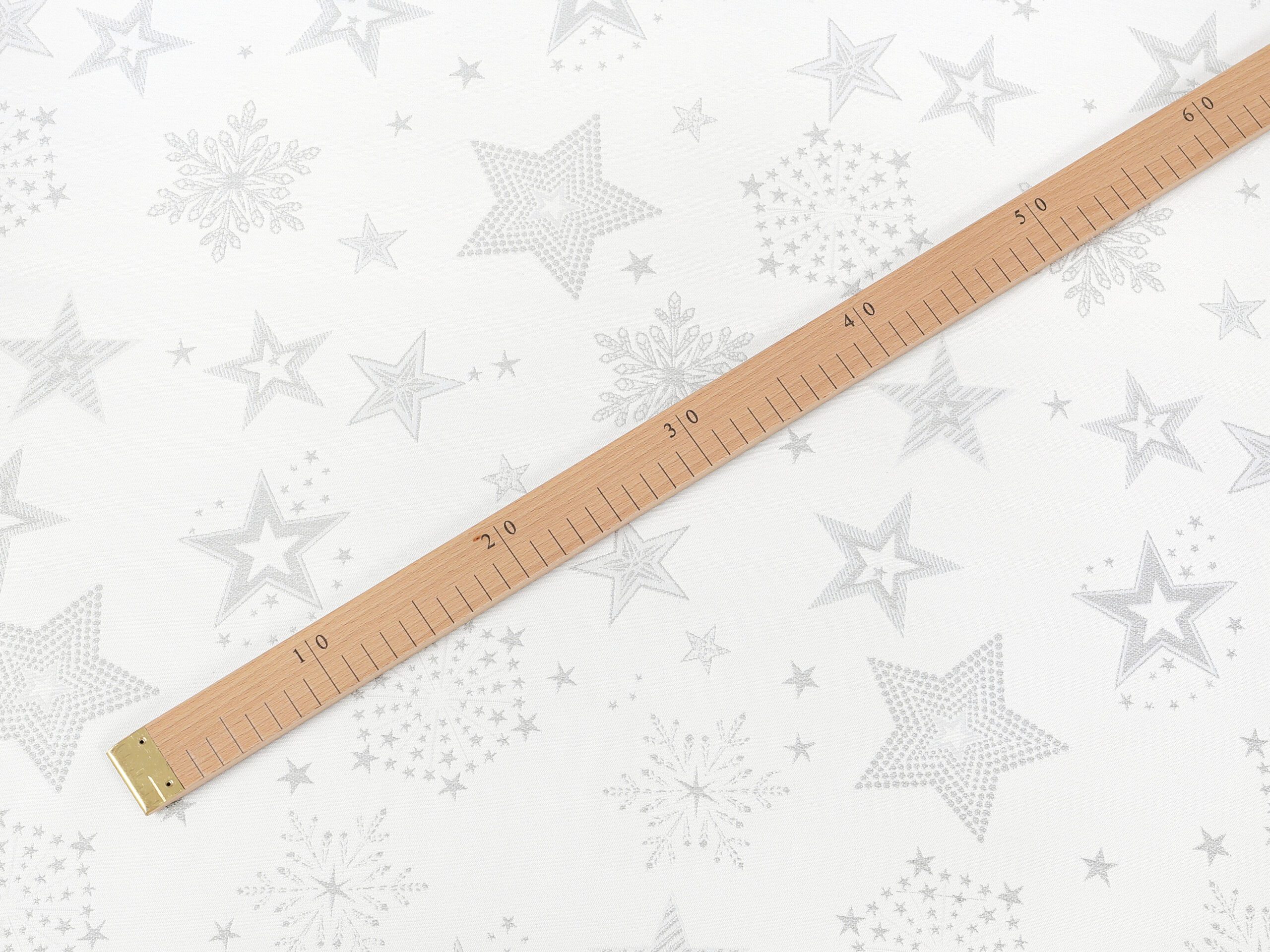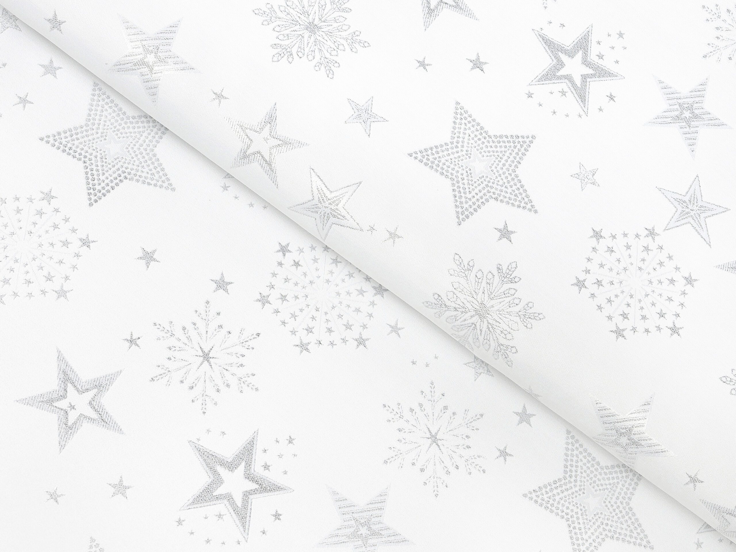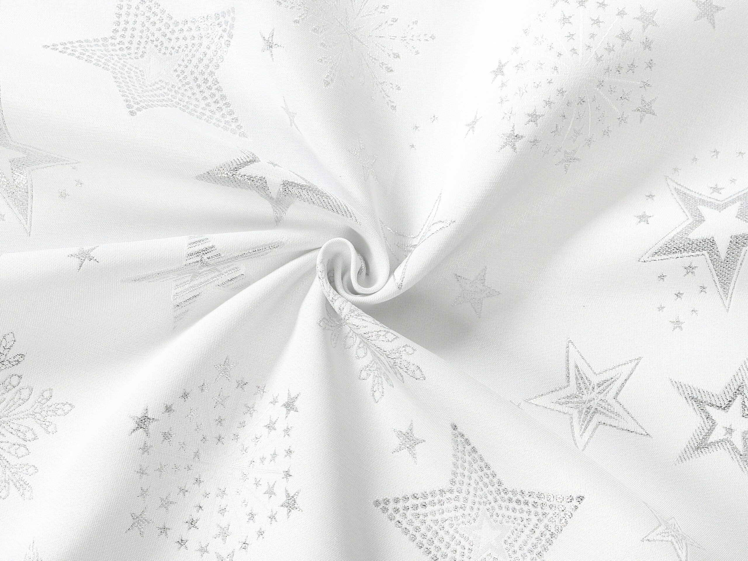 Dekorační látka stříbrné hvězdy na bílé vnese do vašeho domova kouzelnou vánoční atmosféru. Je vyrobena ze 100% polyesteru. Praktická, odolná a zároveň dekorativní. Přesně taková je tato látka české výroby.
