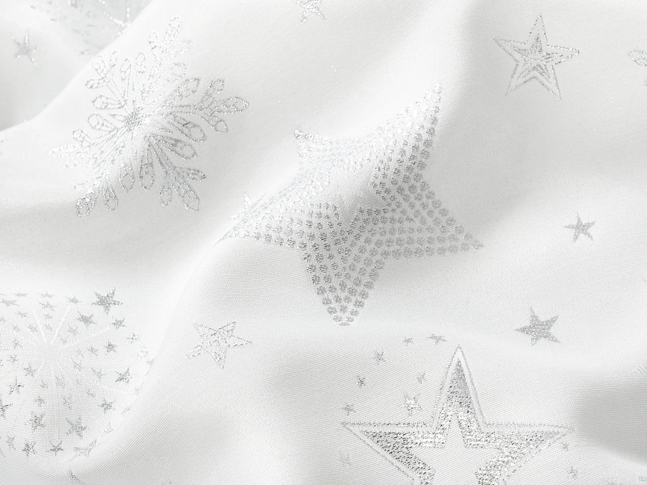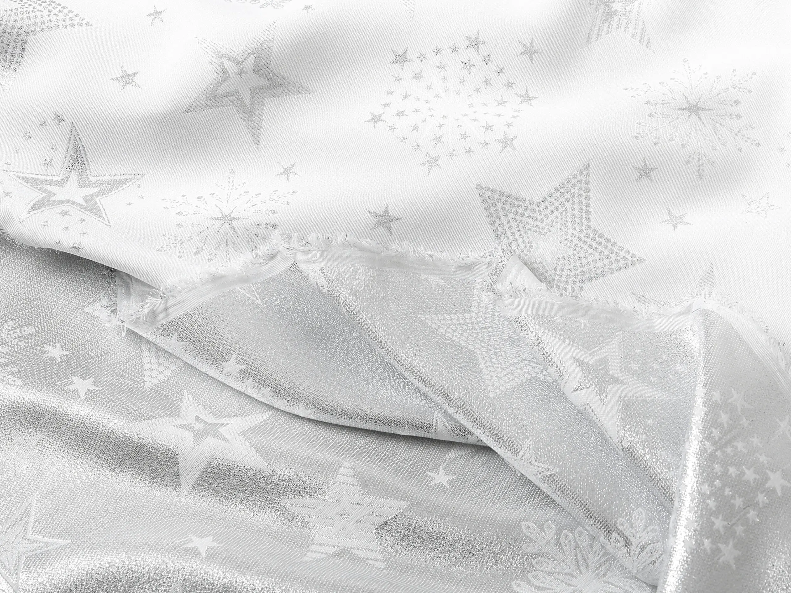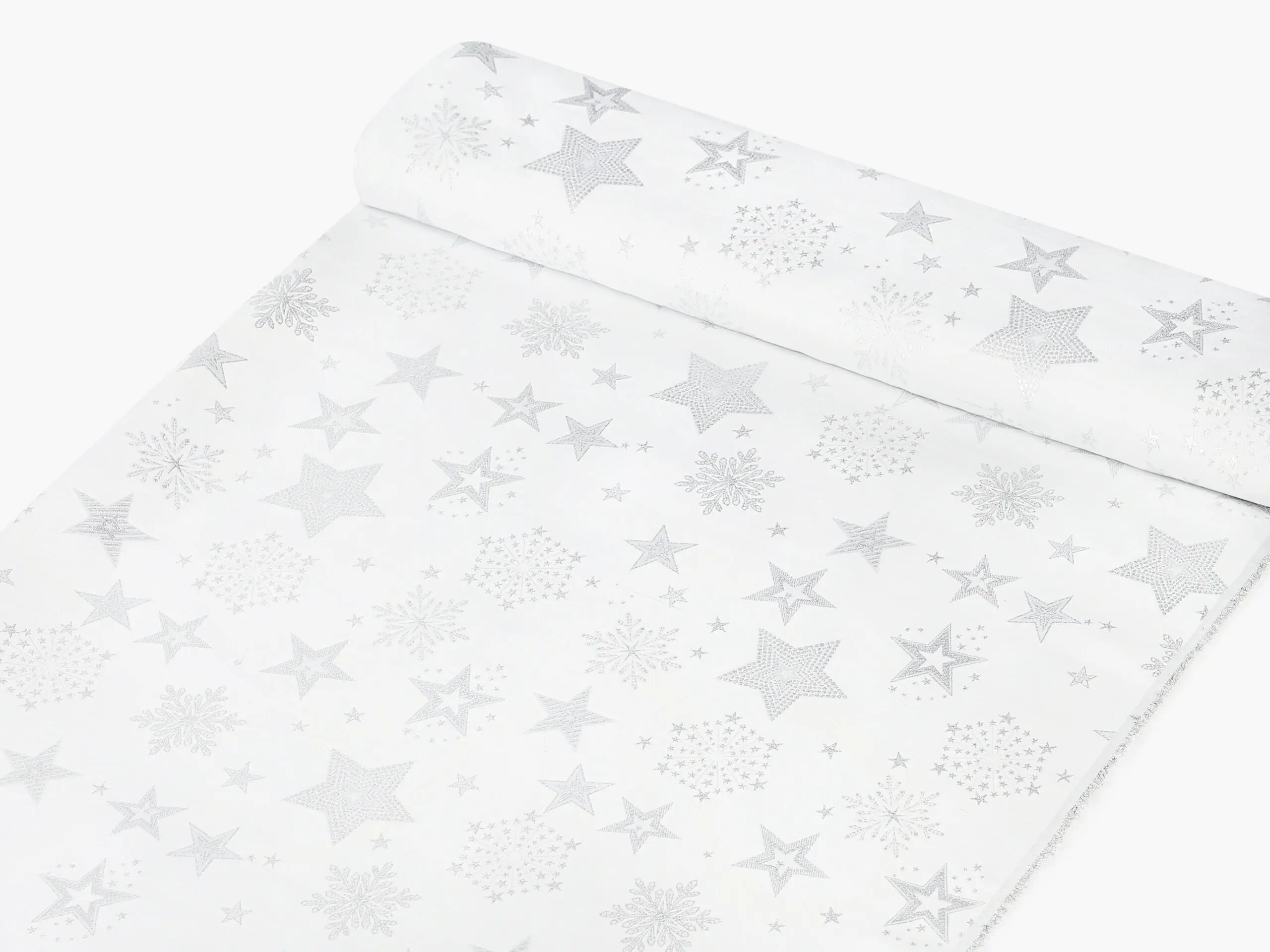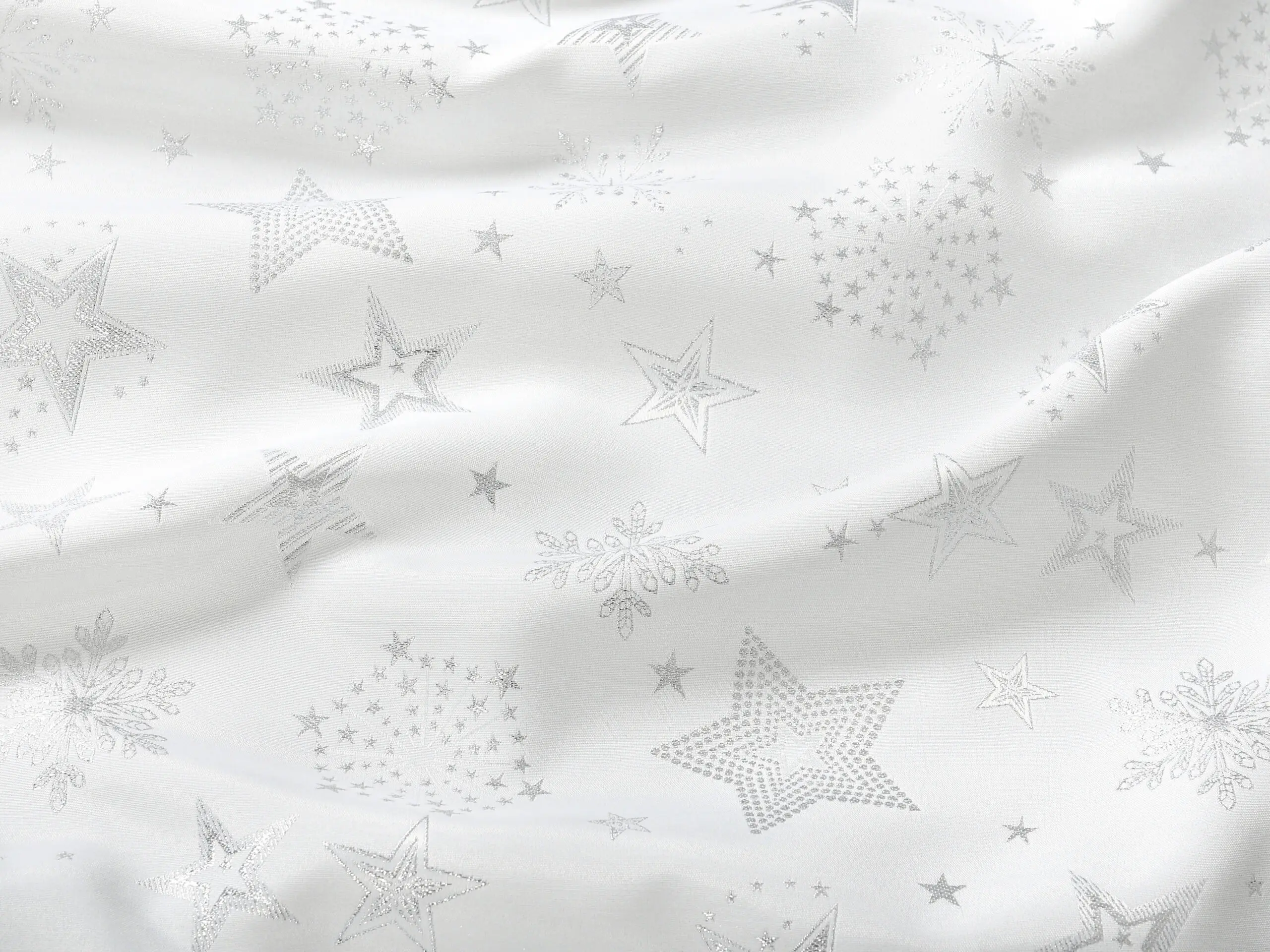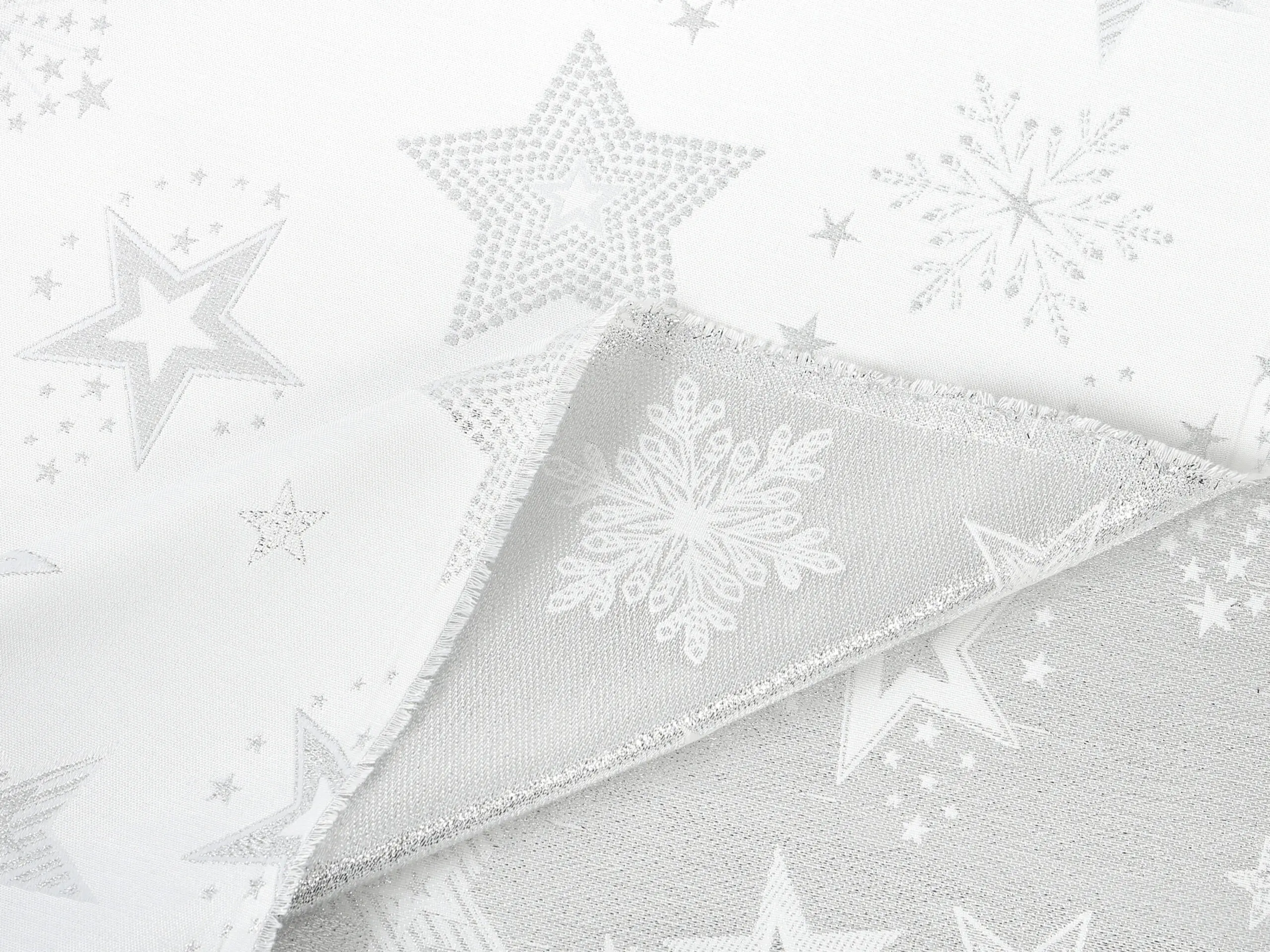 Dekorační látka stříbrné hvězdy na bílé vnese do vašeho domova kouzelnou vánoční atmosféru. Je vyrobena ze 100% polyesteru. Praktická, odolná a zároveň dekorativní. Přesně taková je tato látka české výroby.