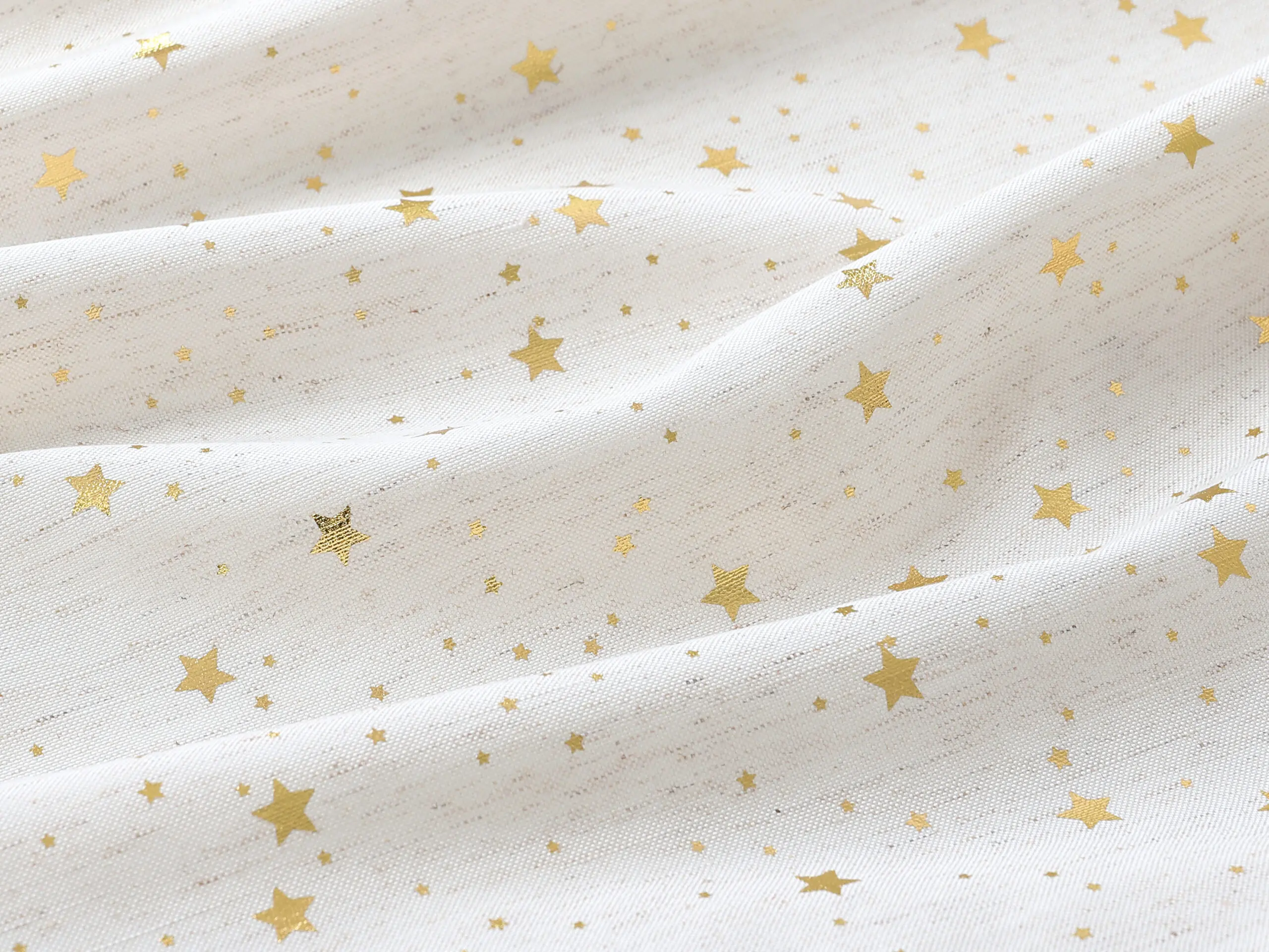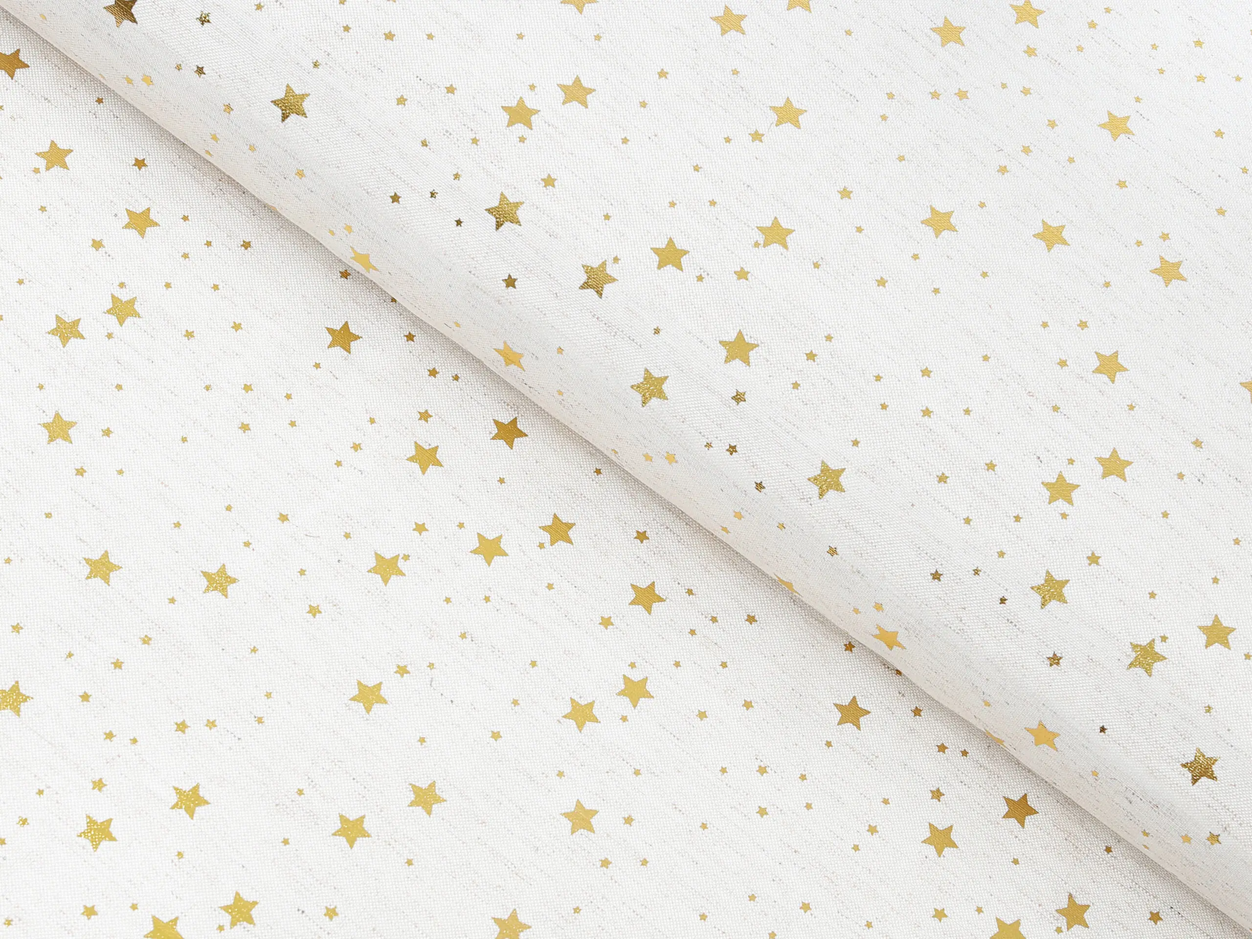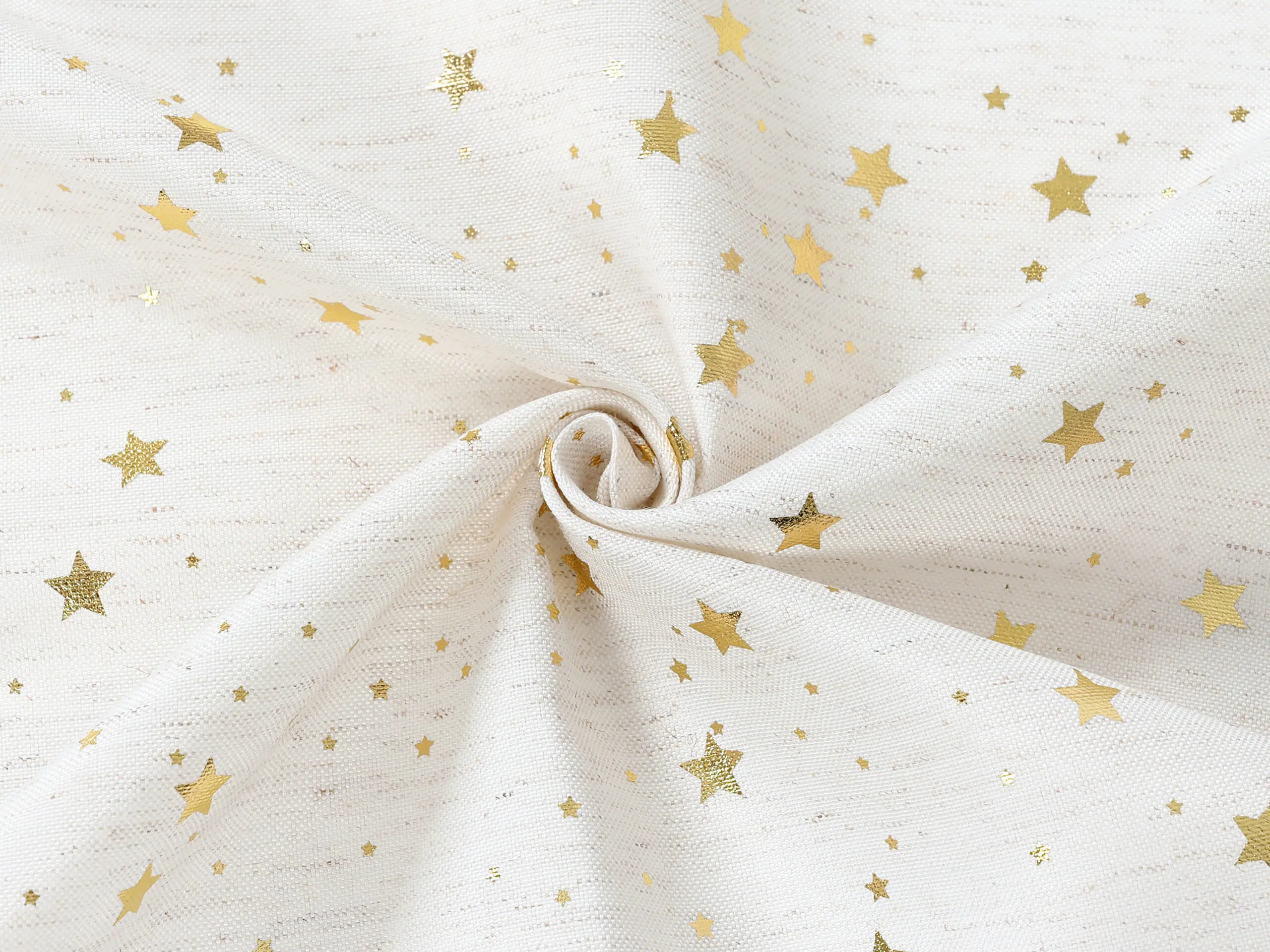 Dekorační látka zlaté hvězdy na režné vnese do vašeho domova kouzelnou vánoční atmosféru. Je vyrobena ze 100% polyesteru. Praktická, odolná a zároveň dekorativní. Přesně taková je tato látka české výroby.
