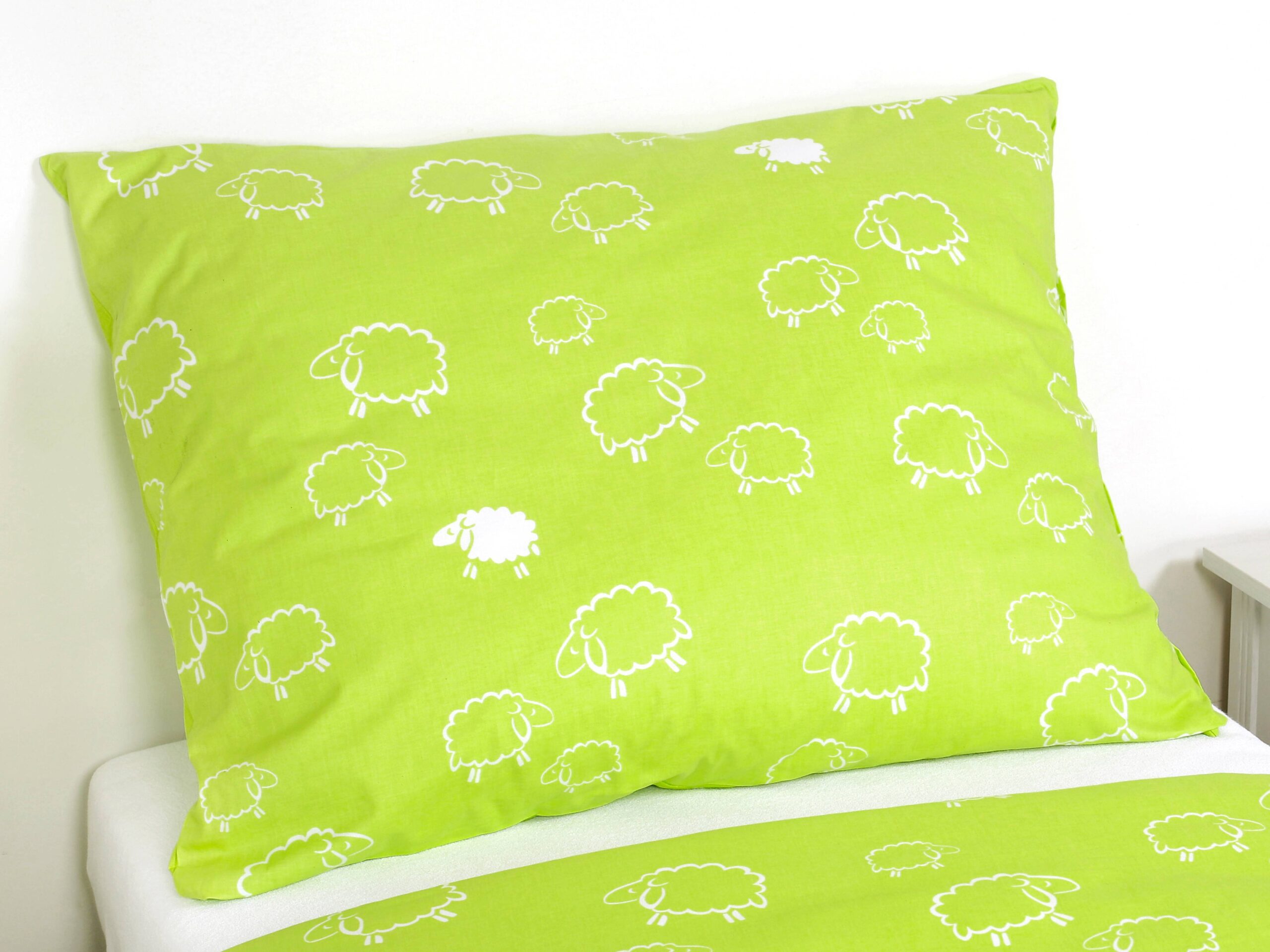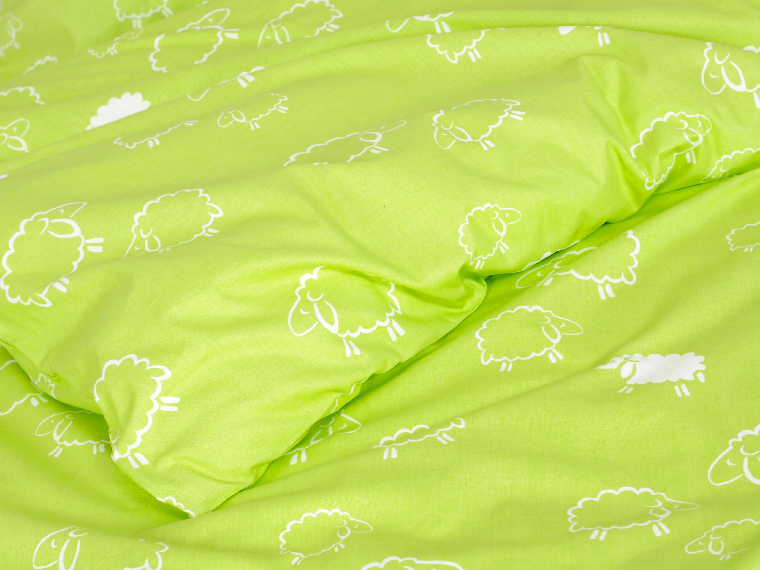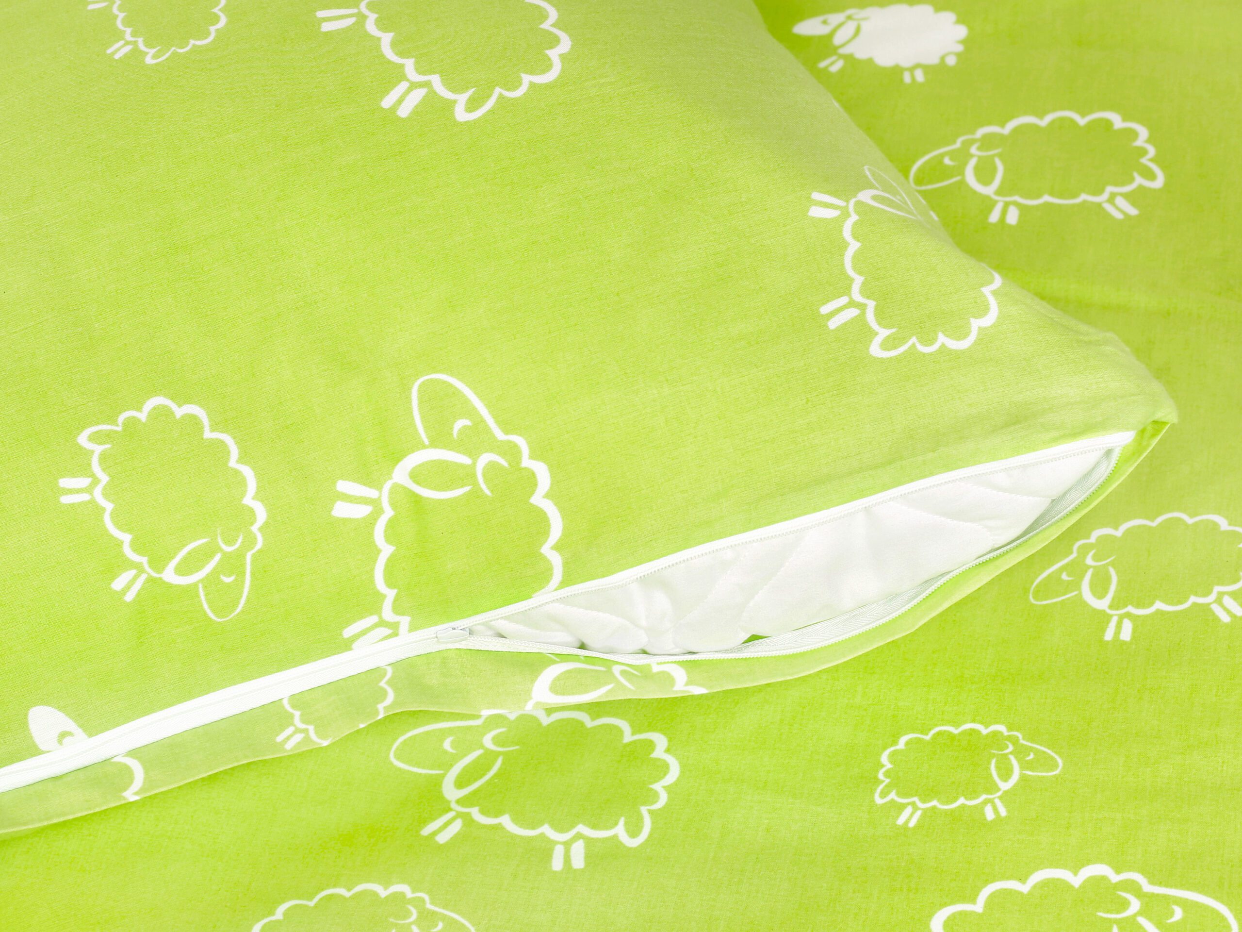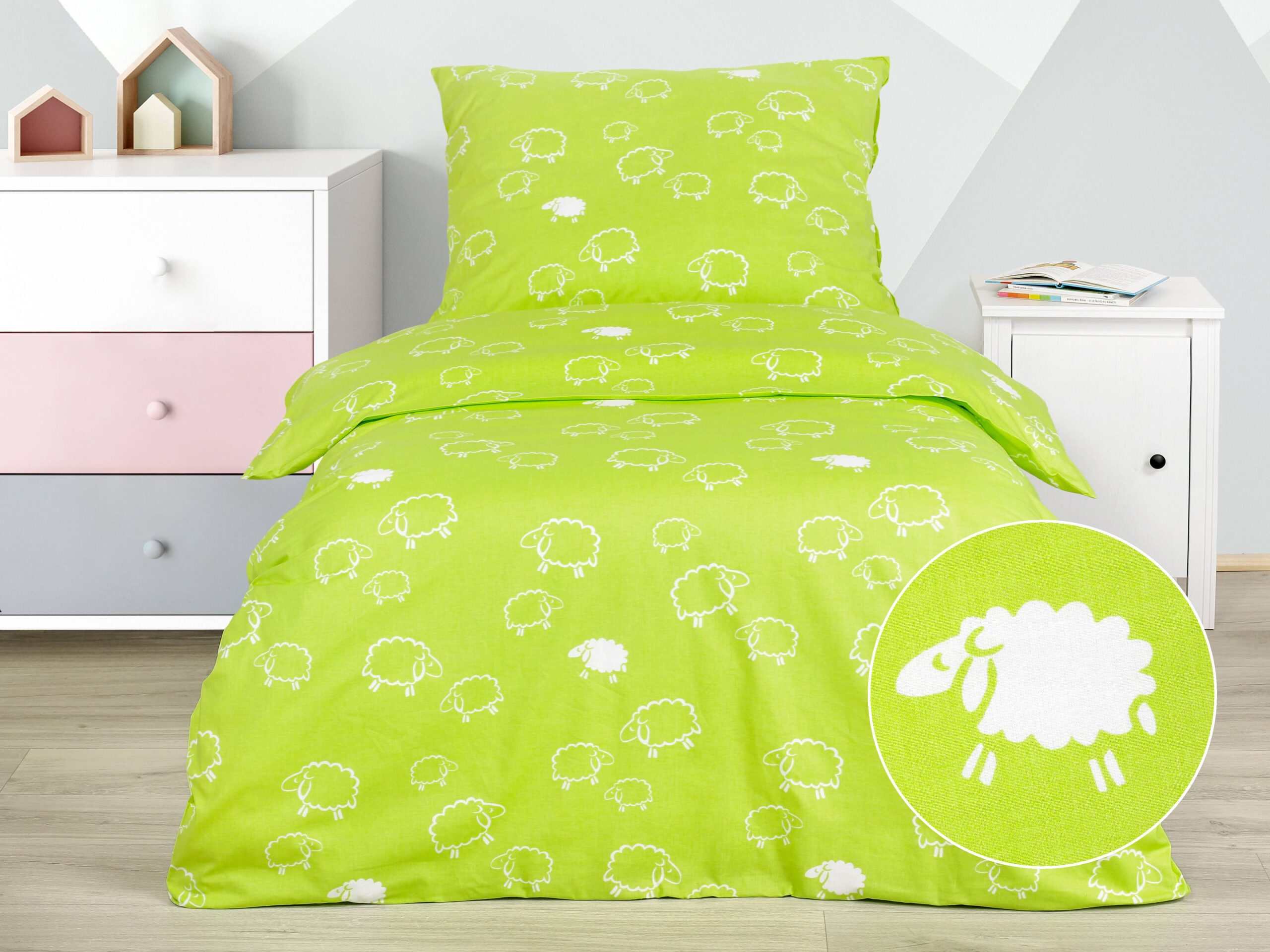 Motiv bílé ovečky na pistáciovém pozadí přidává dětskému povlečení skvělý šarm.