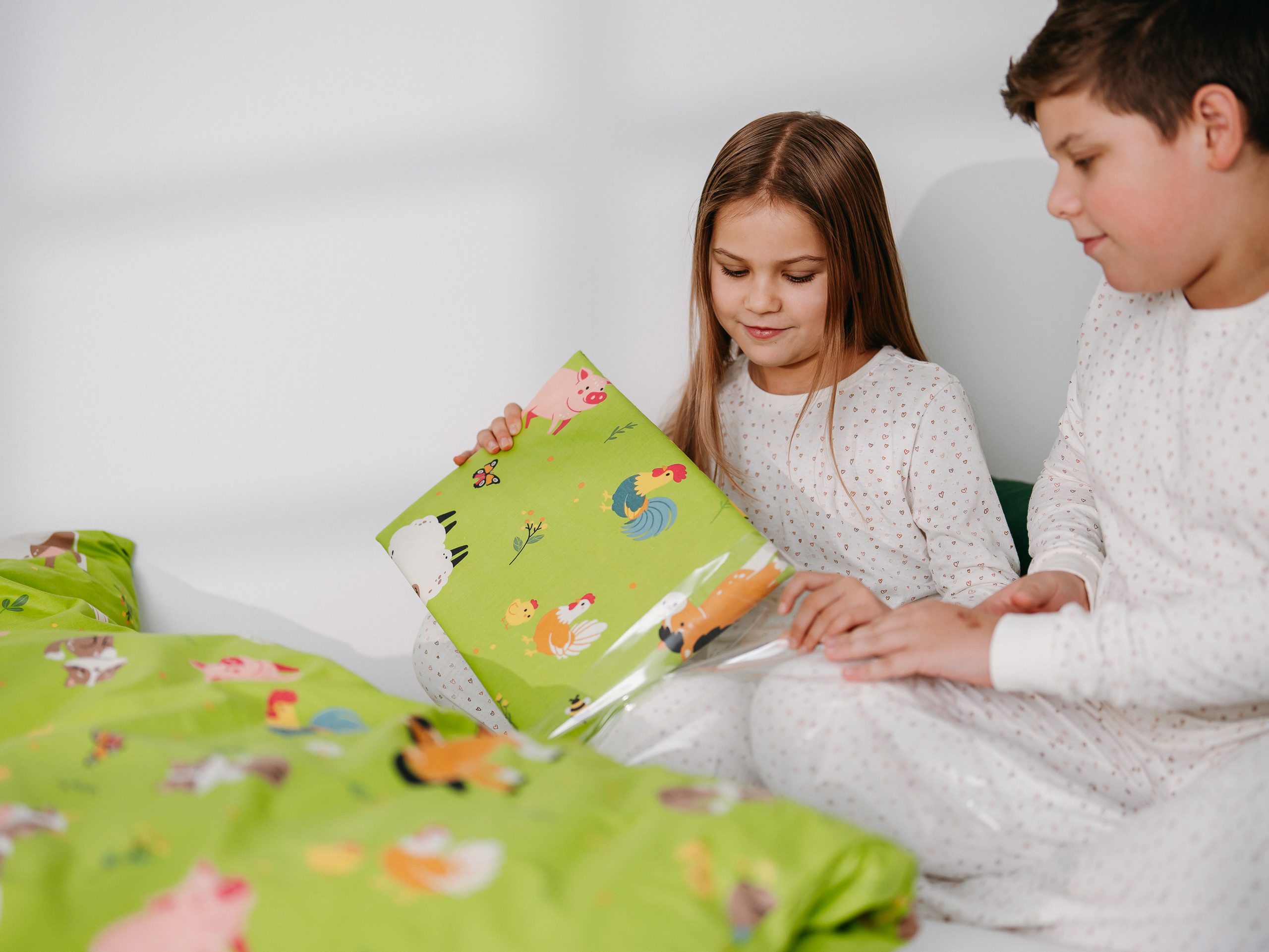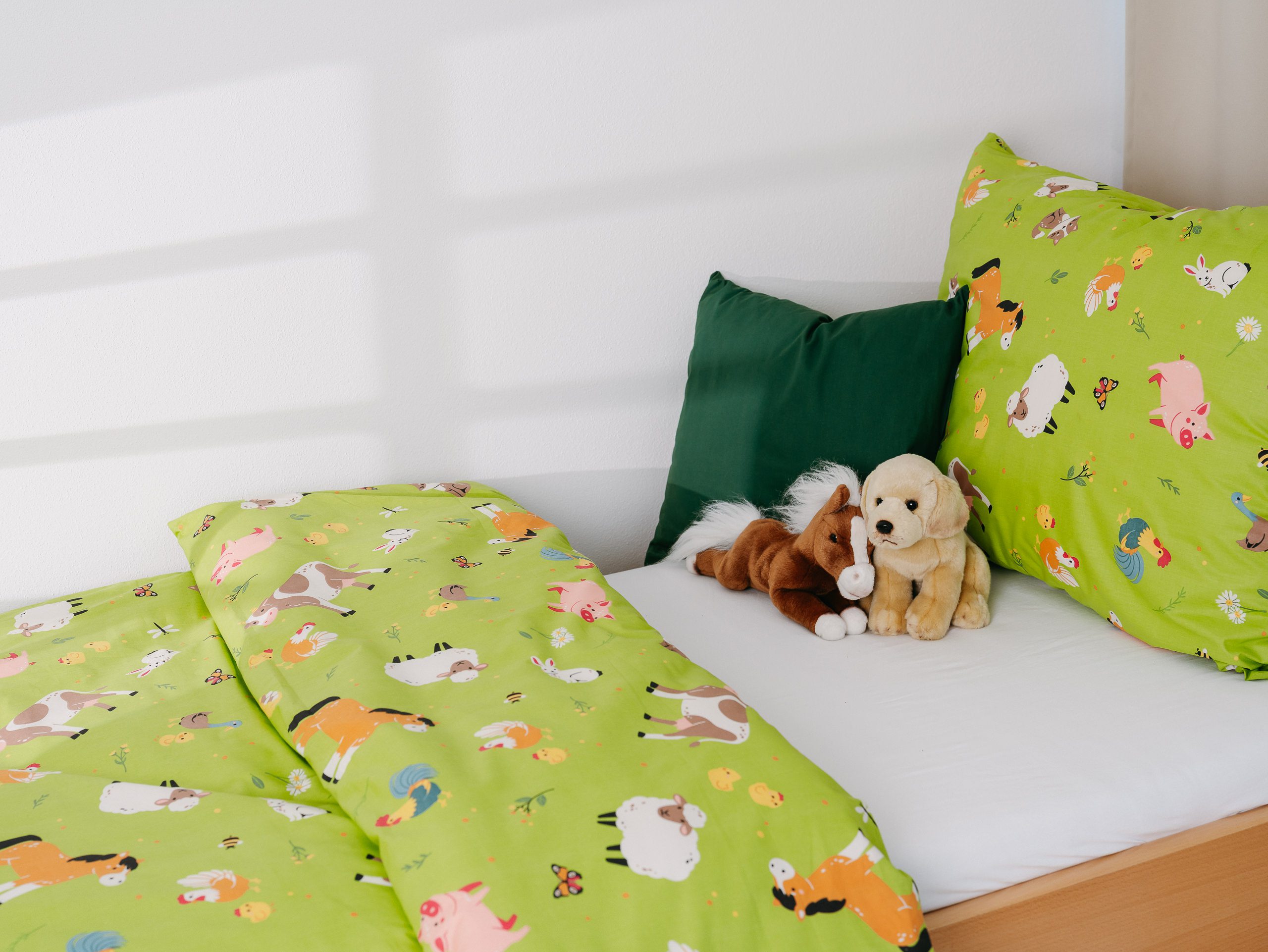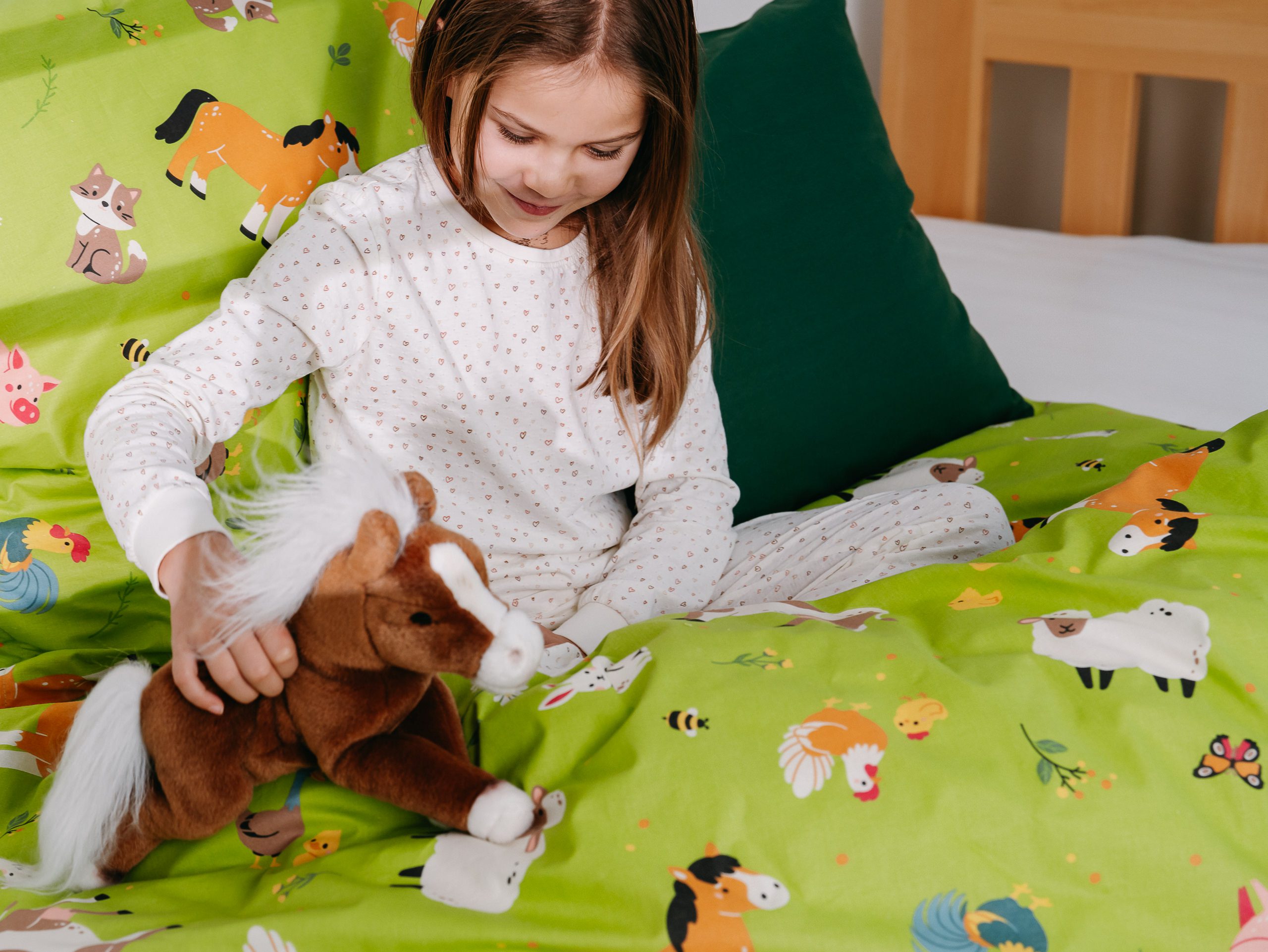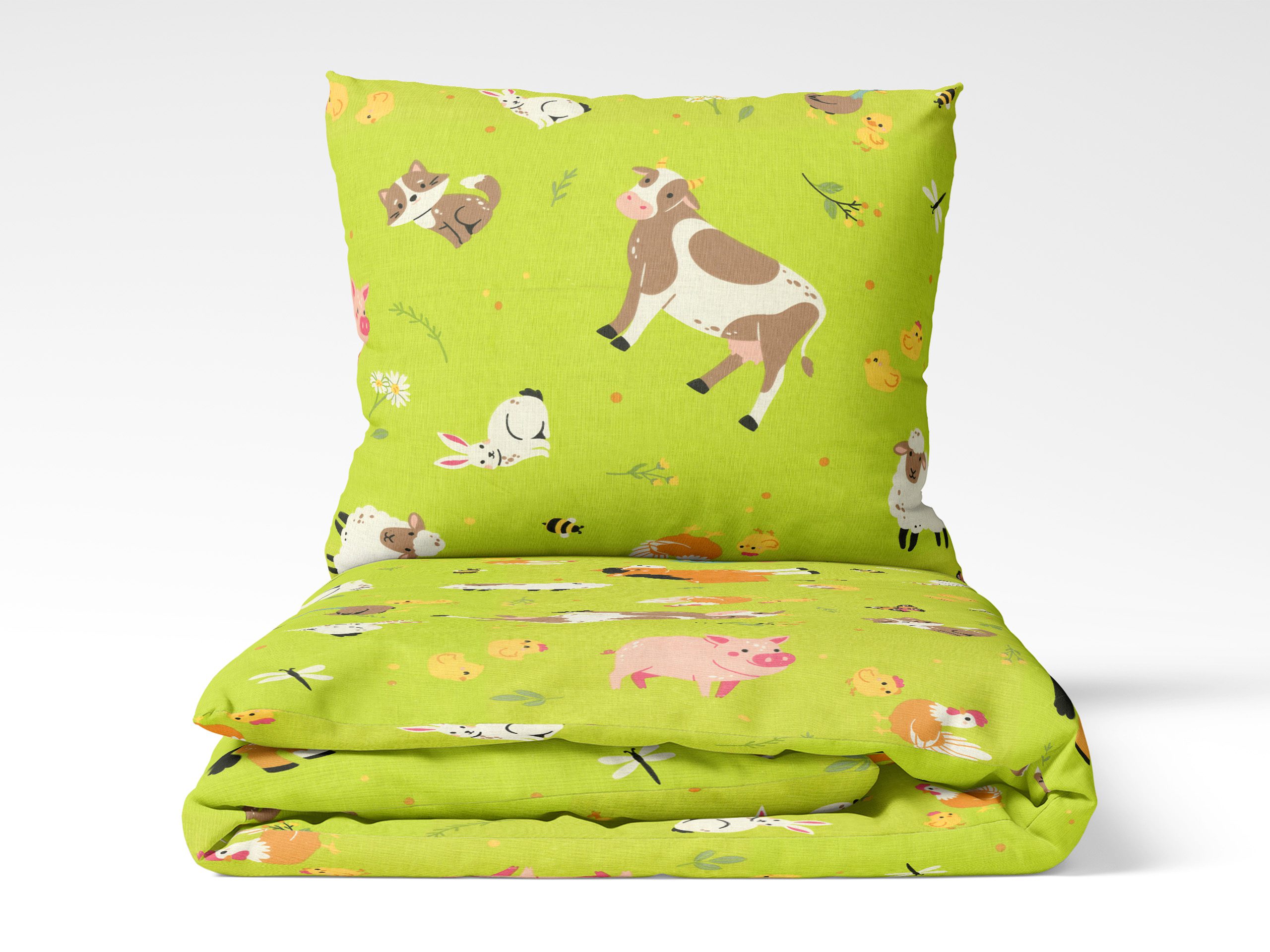 Motiv zvířátek z české farmy na zeleném pozadí přidává dětskému povlečení skvělý šarm.