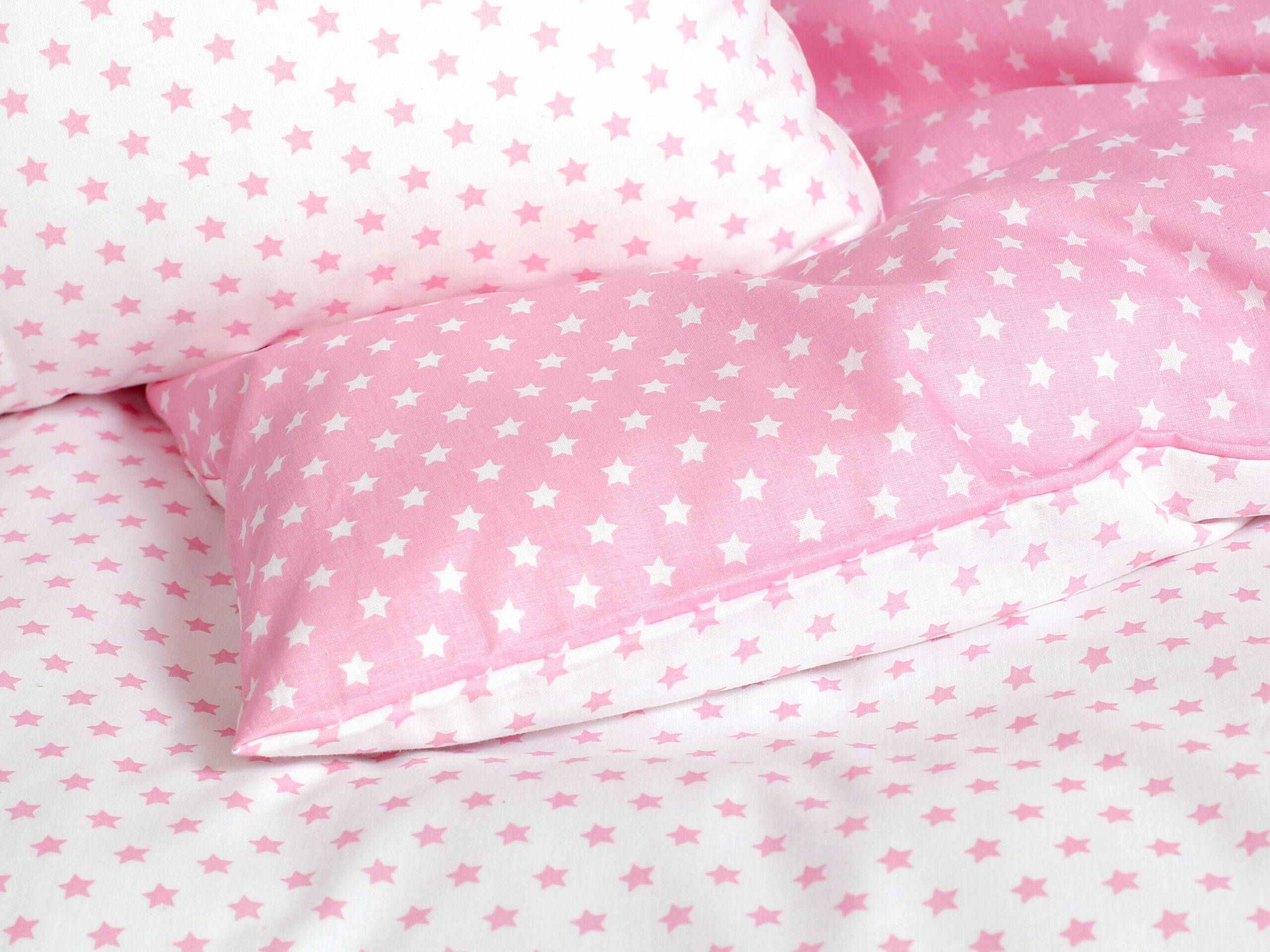Motiv bílých/ růžových hvězdiček na růžovém/ bílém pozadí je variabilní, oboustranně využitelný a přidává dětskému povlečení skvělý šarm.