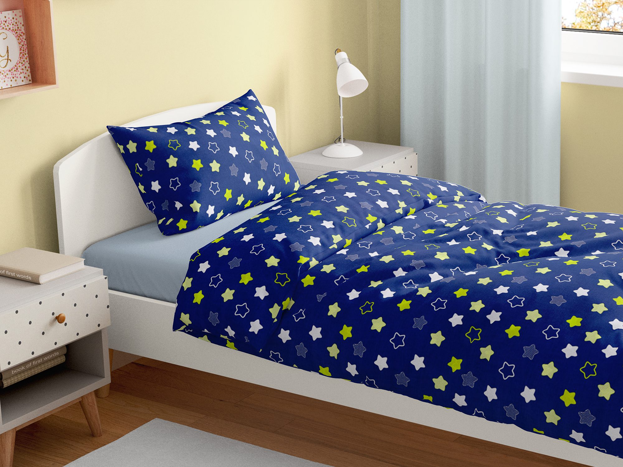 Motiv hvězd na modrém pozadí přidává dětskému povlečení skvělý akcent.