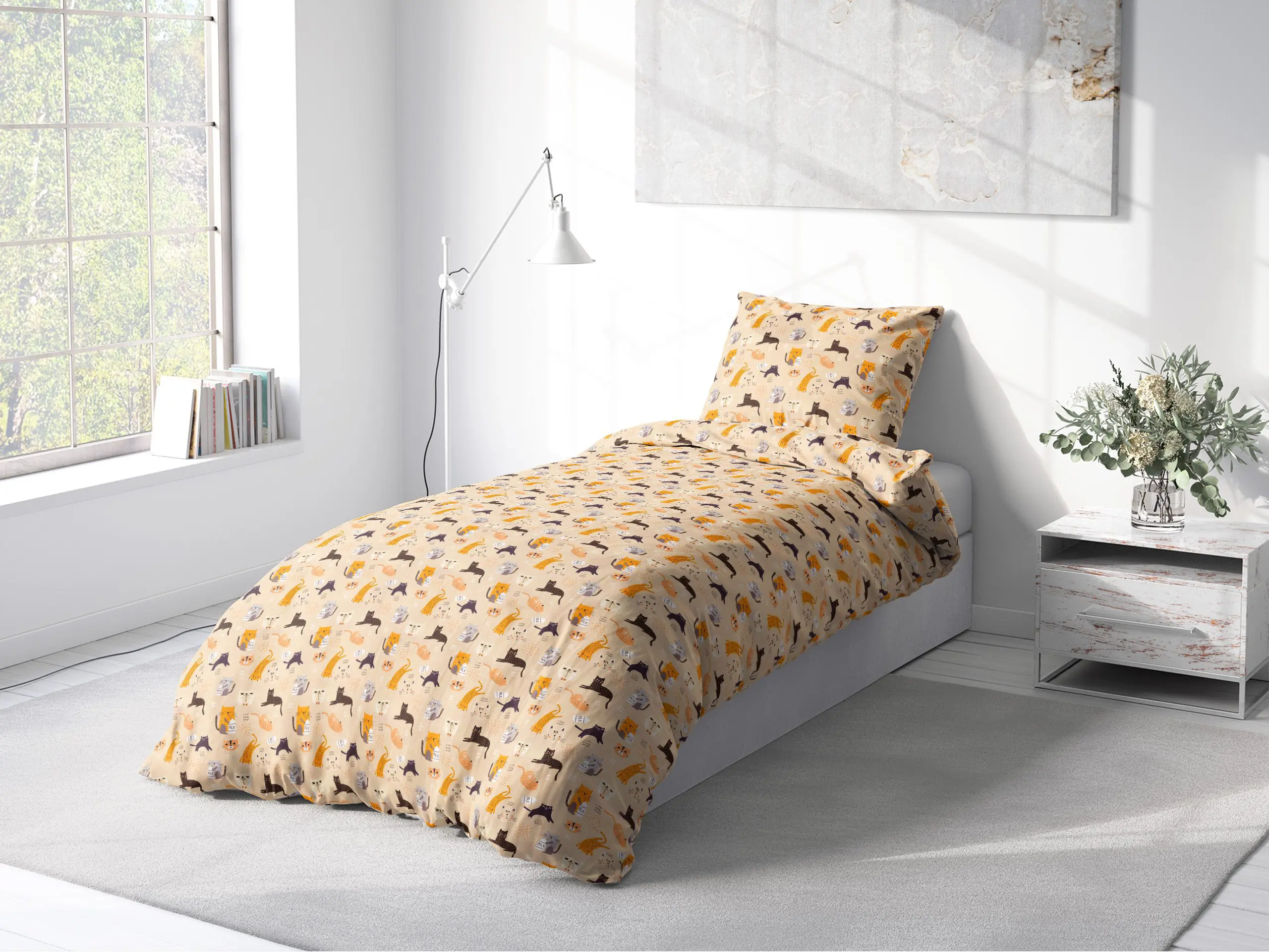 Motiv kočiček na béžovém pozadí přidává dětskému povlečení skvělý šarm.