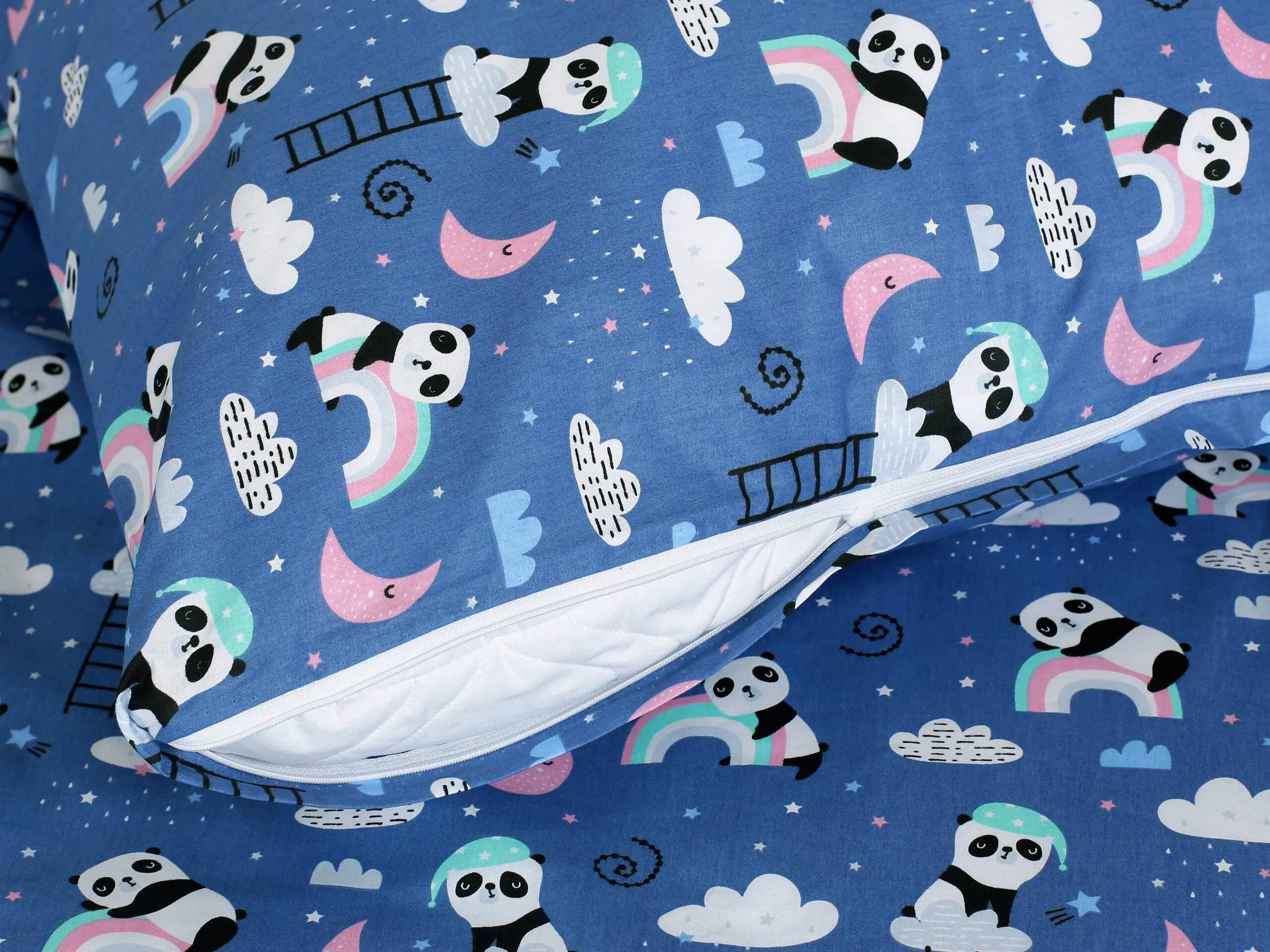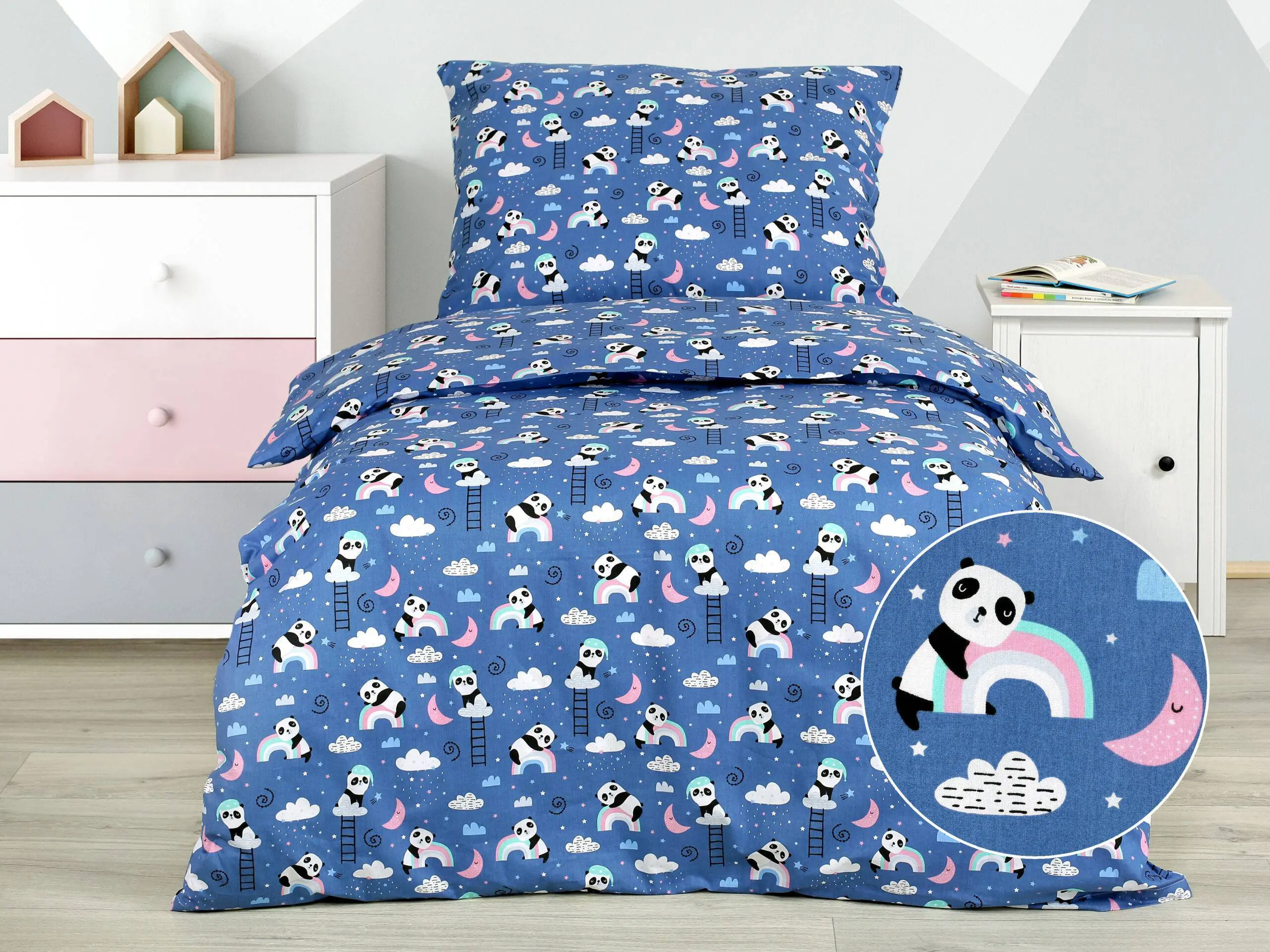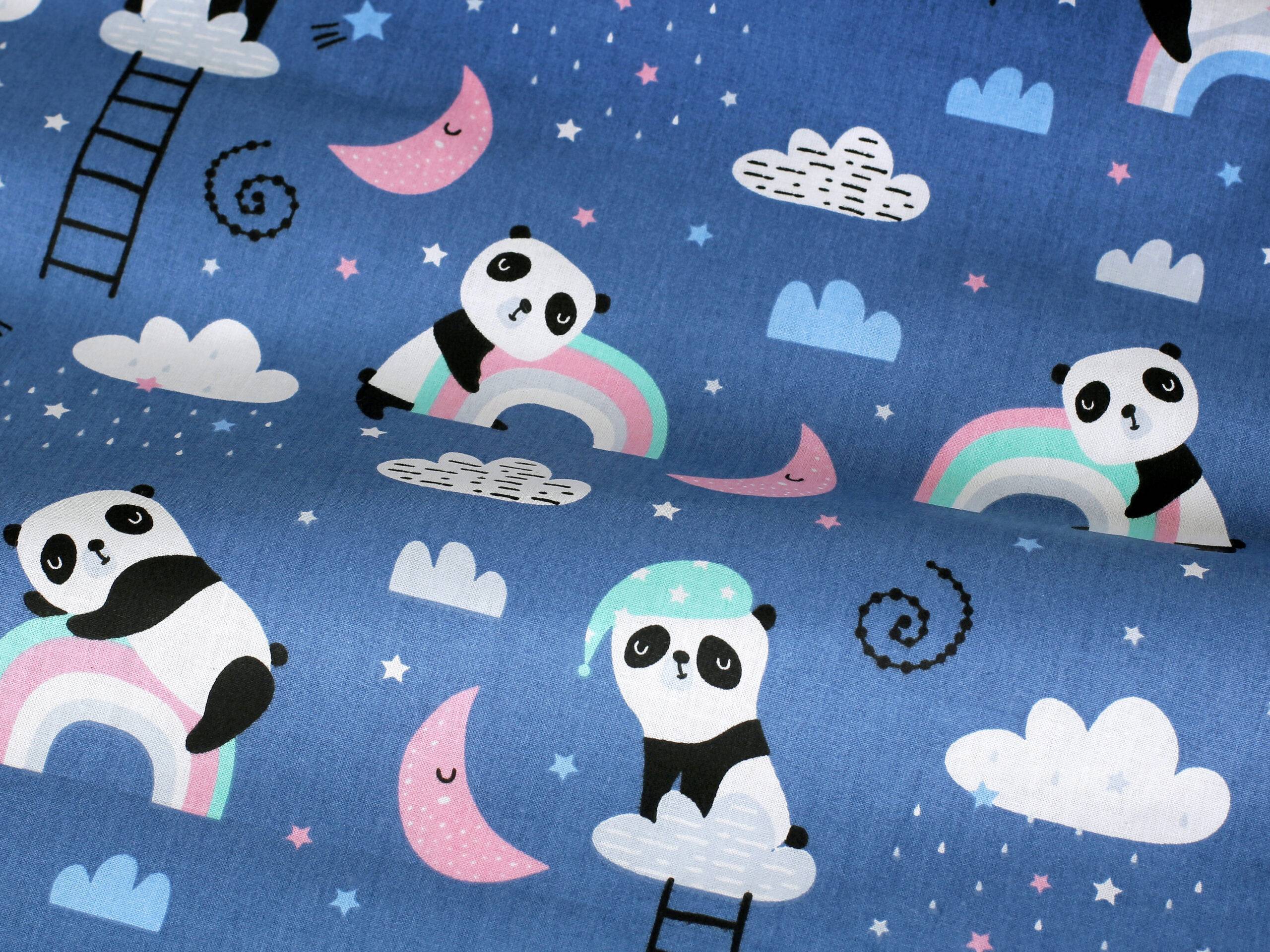 Motiv roztomilých pand na modrém pozadí přidává dětskému povlečení skvělý šarm.