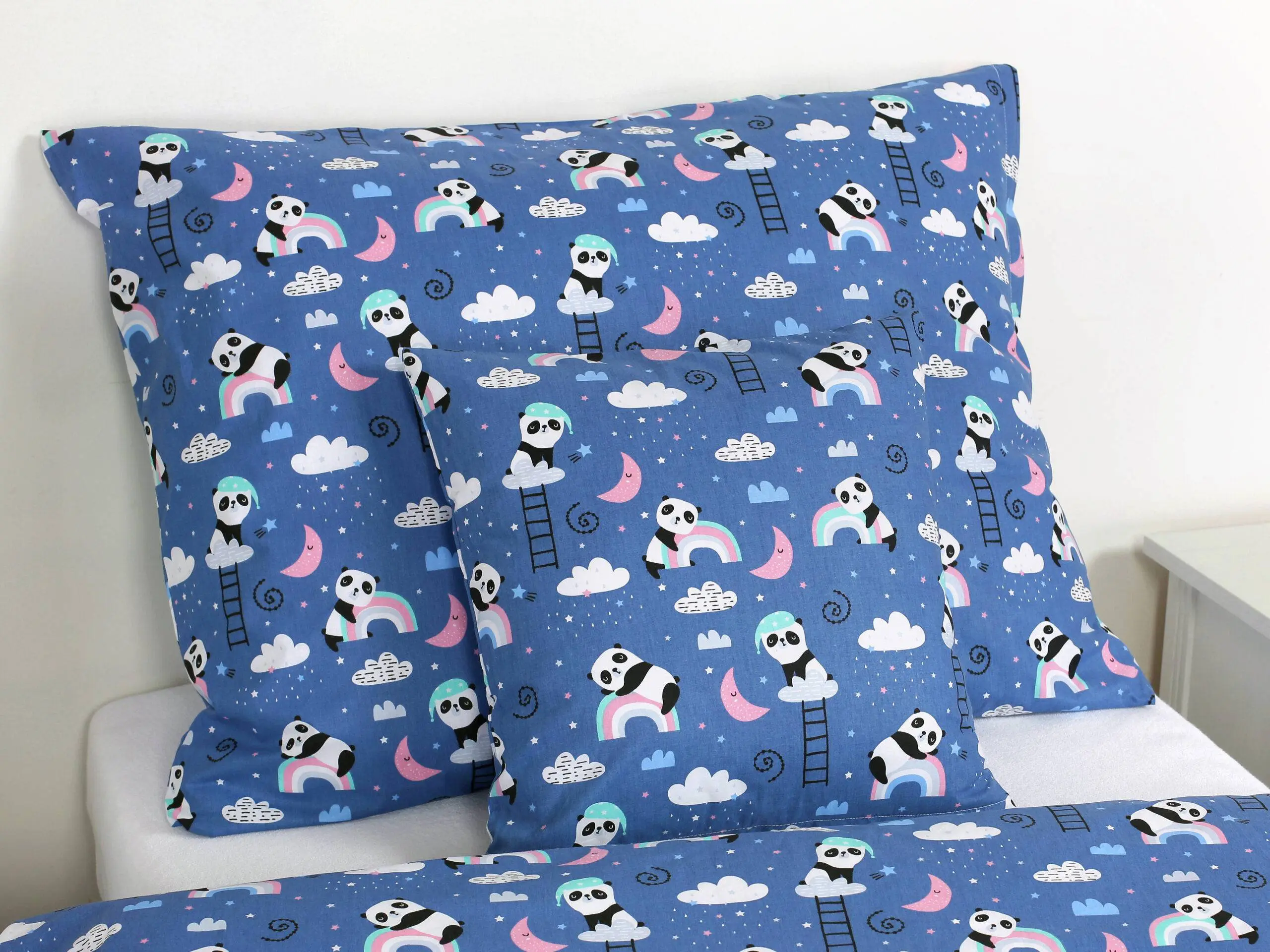 Naše dětské bavlněné povlečení pandy s duhou na modré kombinuje kvalitu a dlouhou životnost. Díky 100% bavlně je povlečení krásně hebké.