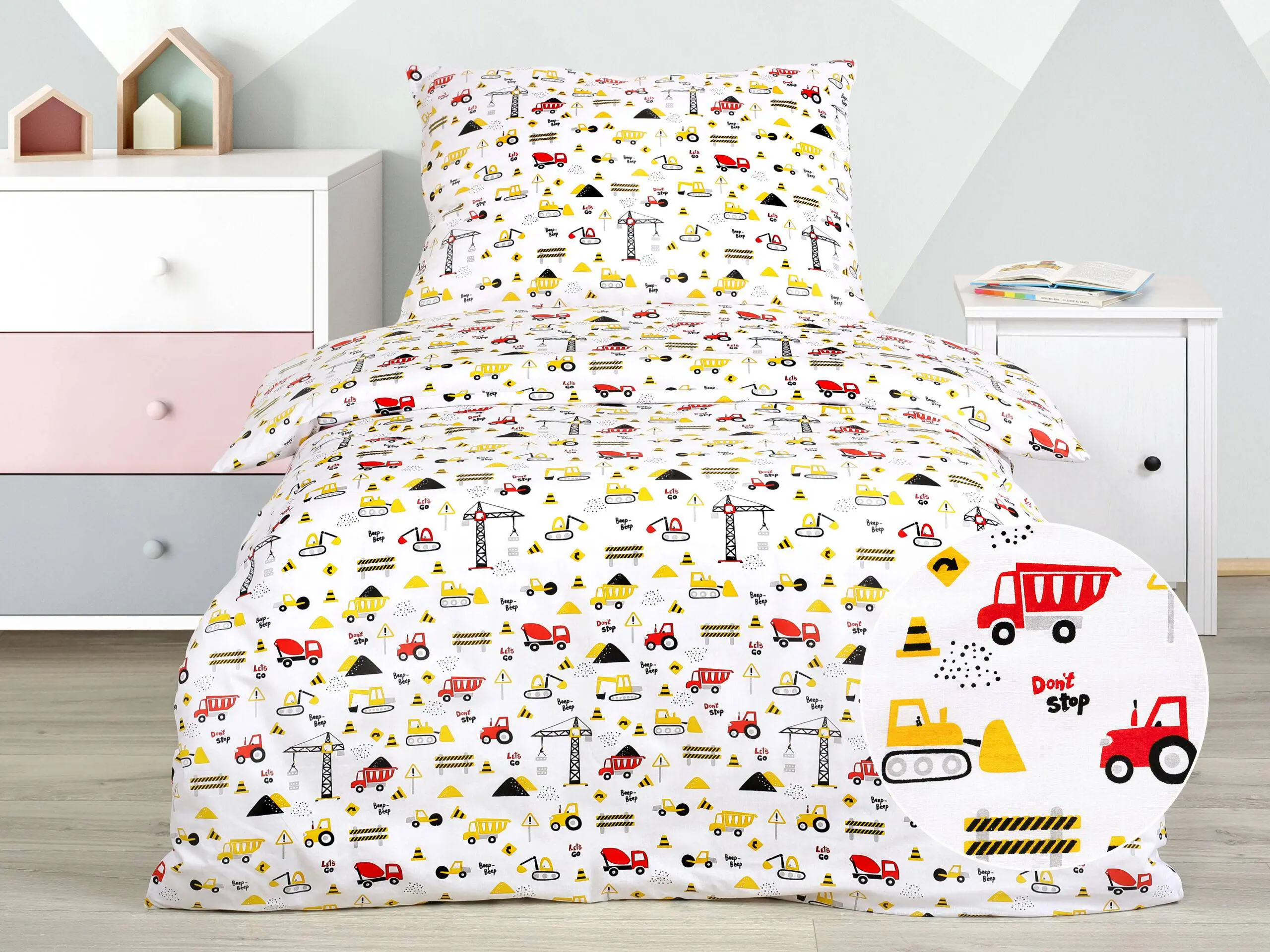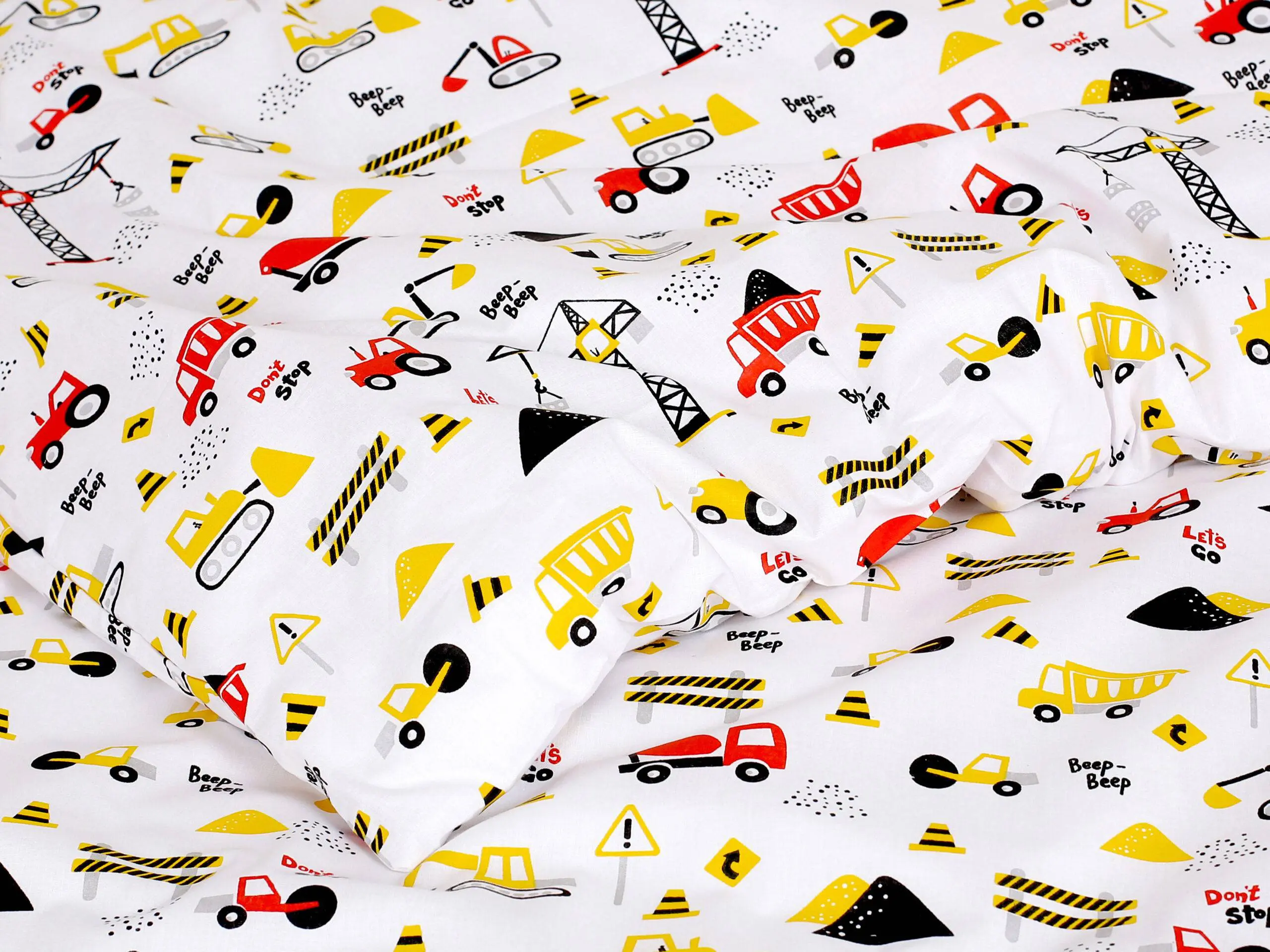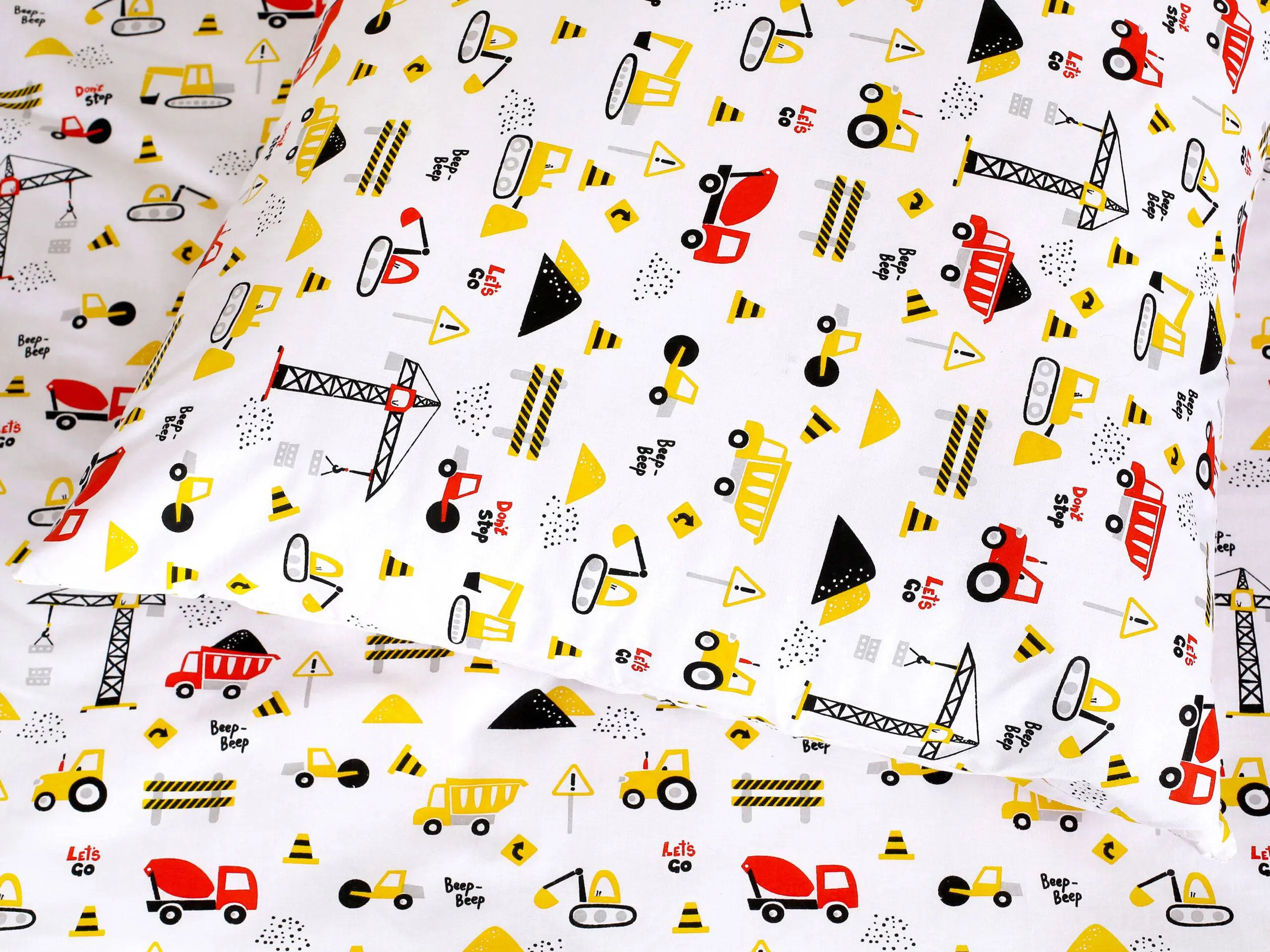 Motiv stavebních strojů na bílém pozadí přidává dětskému povlečení skvělý šarm.
