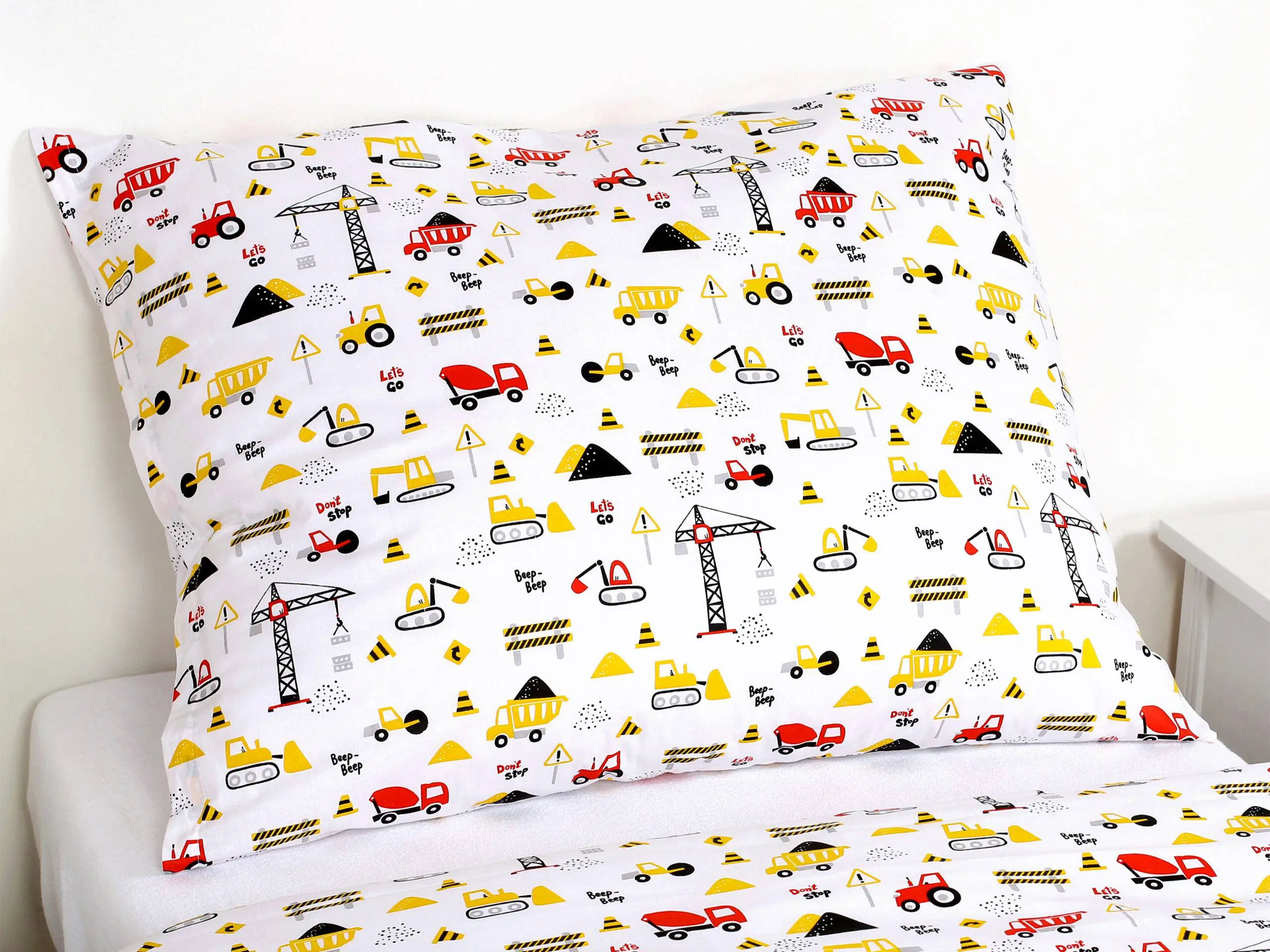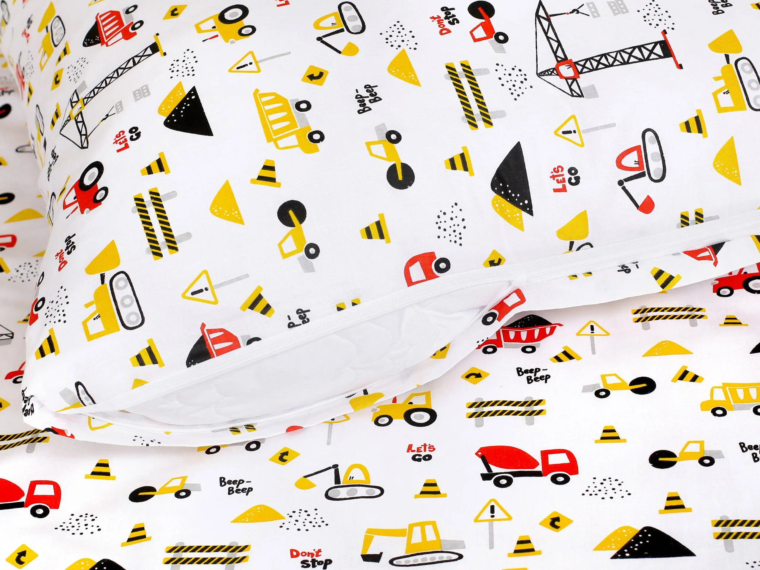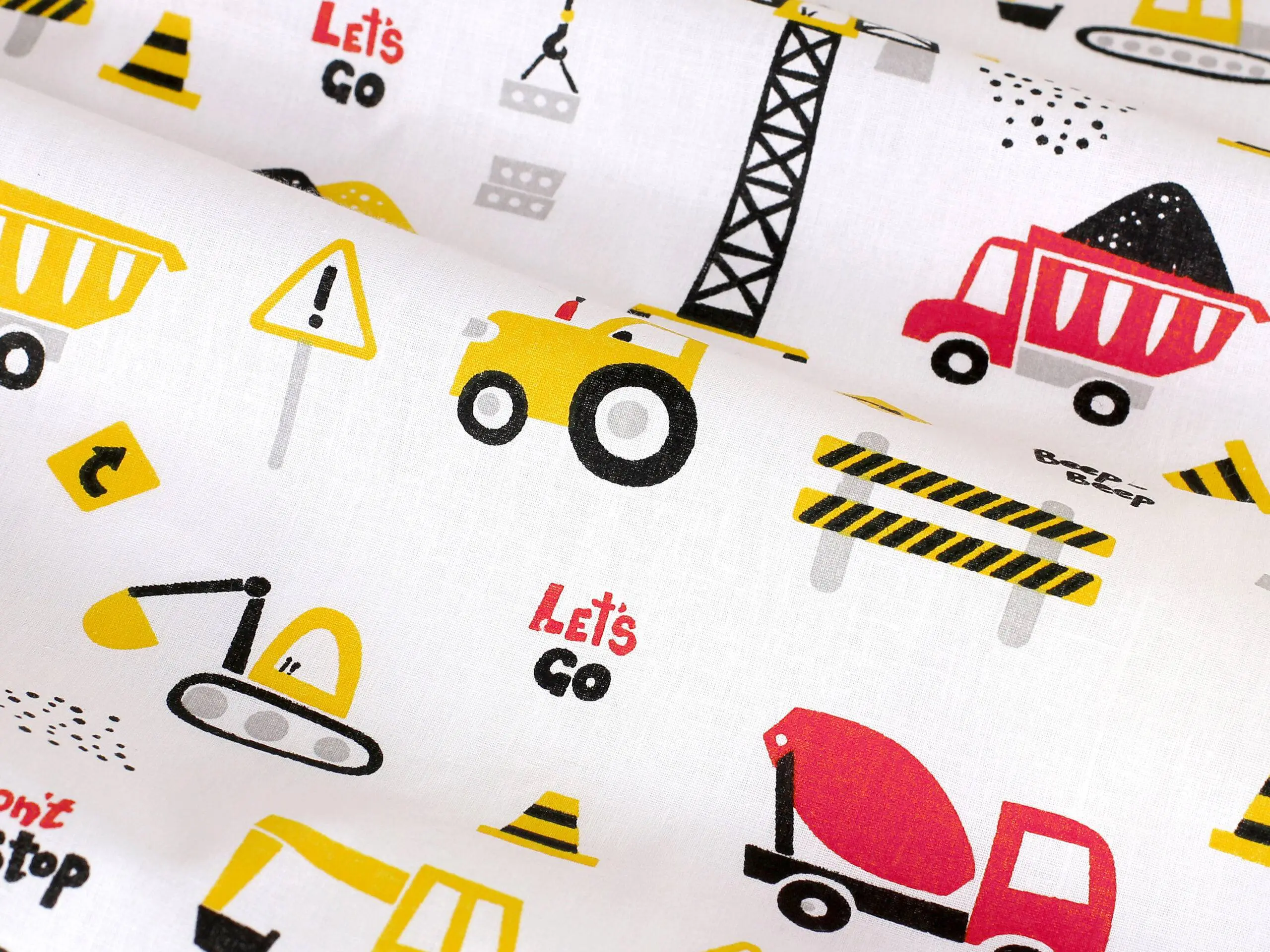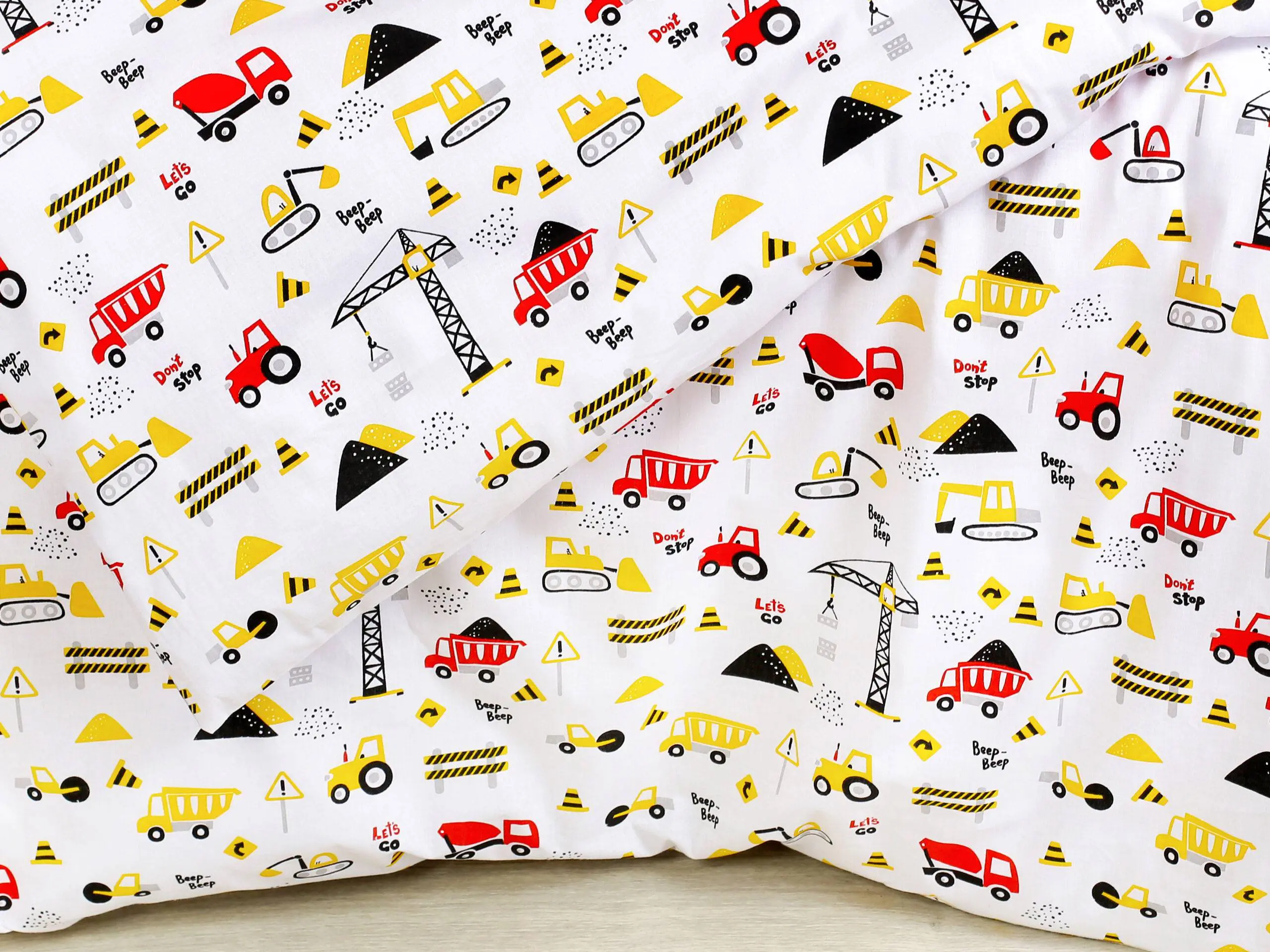 Motiv stavebních strojů na bílém pozadí přidává dětskému povlečení skvělý šarm.