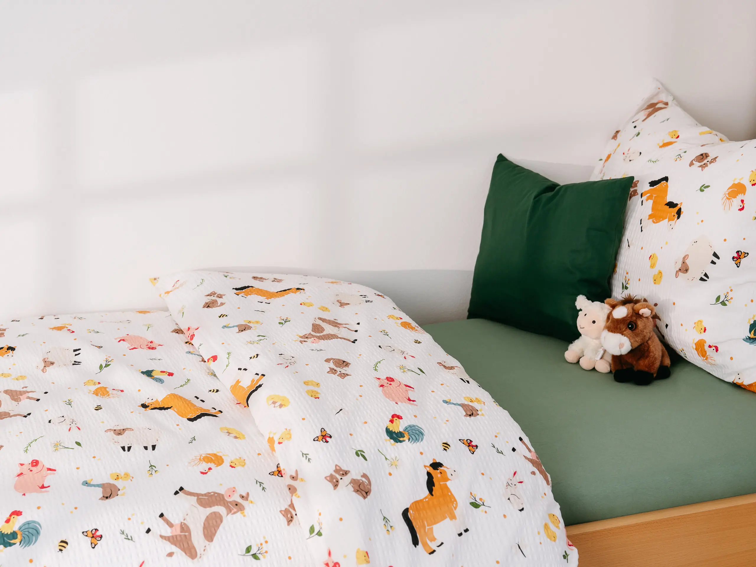Motiv zvířátek z české farmy na smetanovém pozadí přidává dětskému povlečení skvělý šarm.