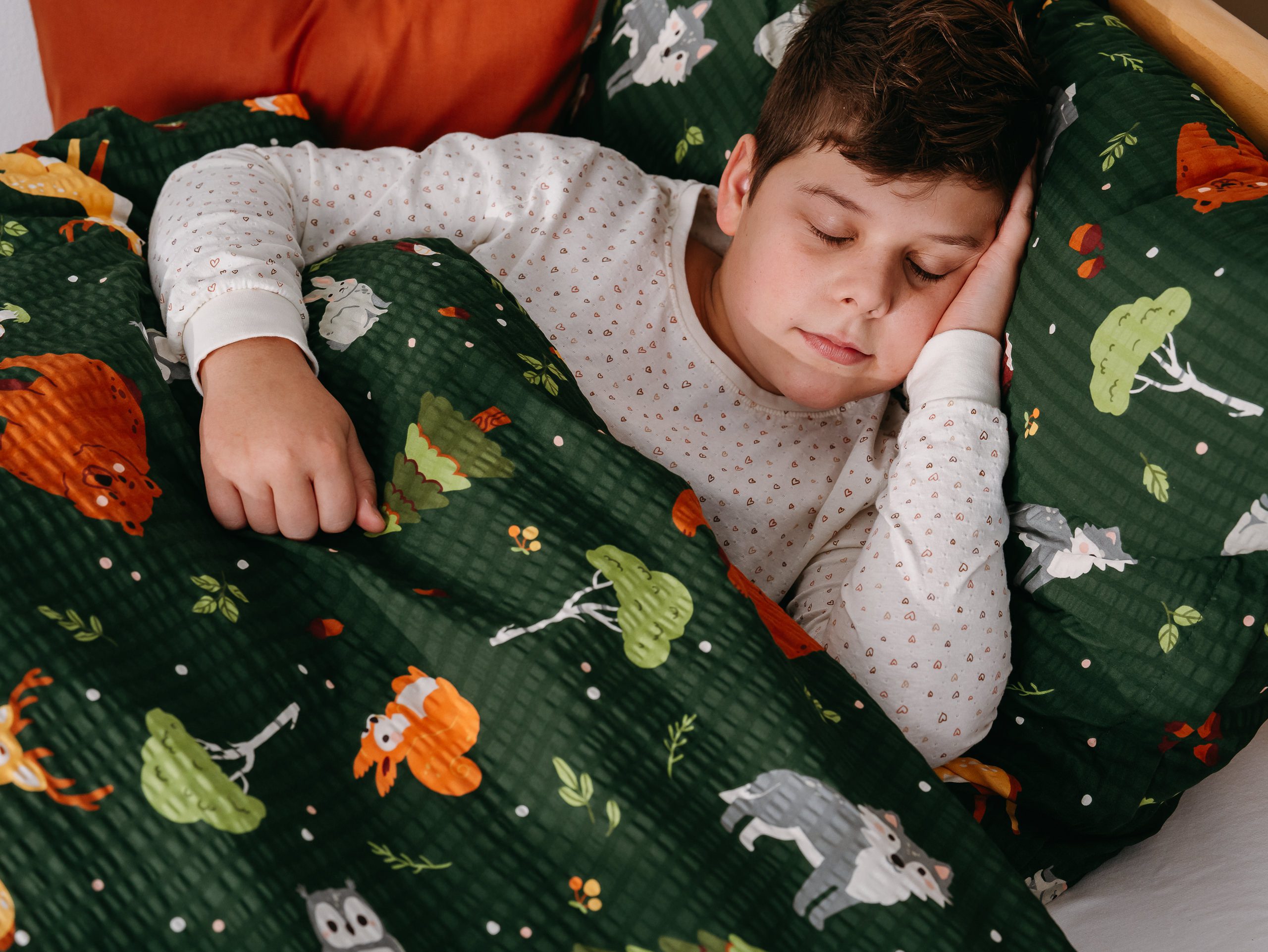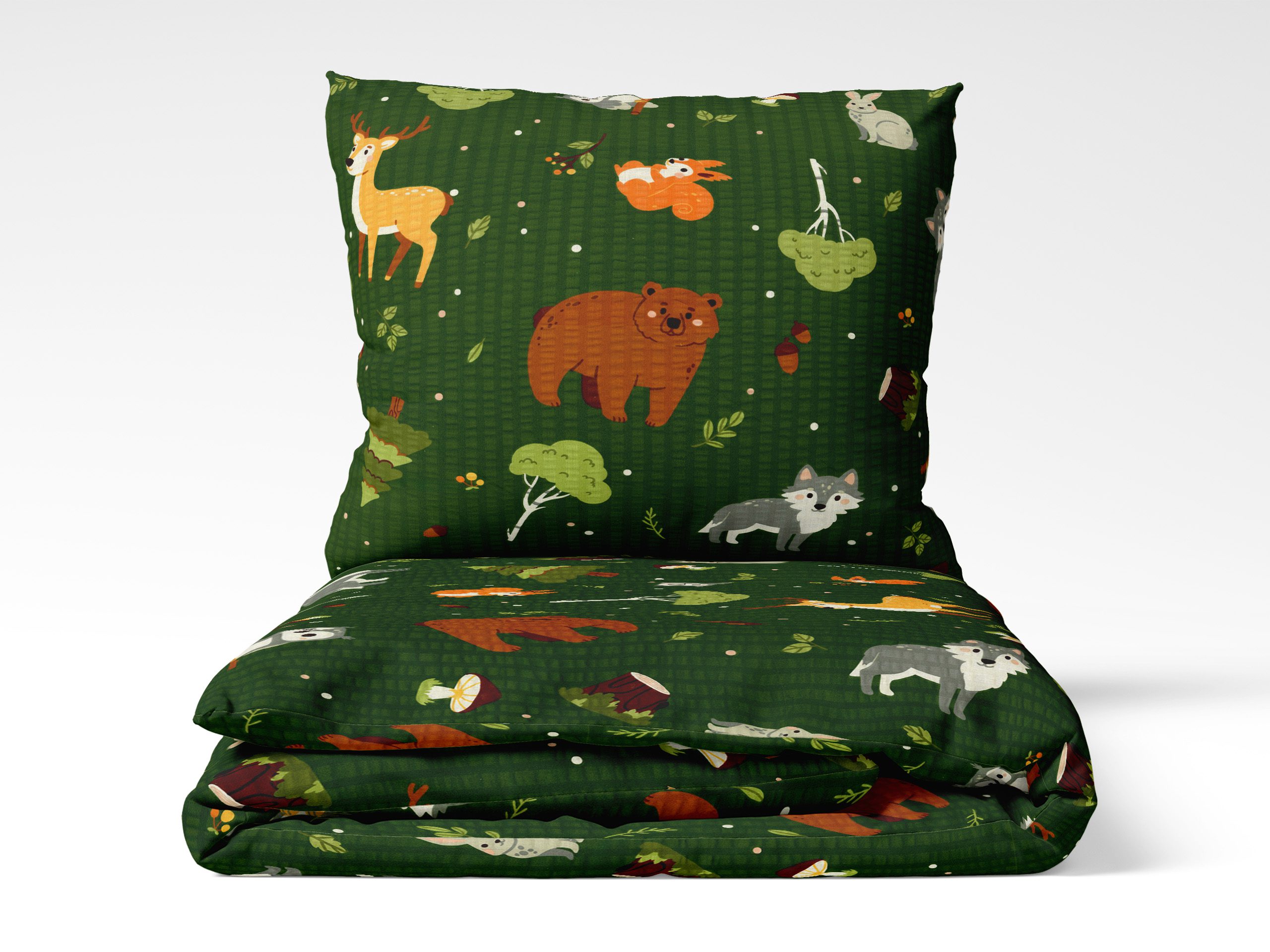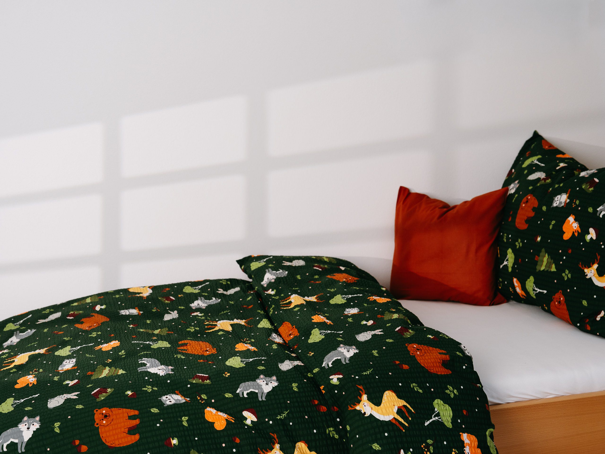 Motiv zvířátek z českého lesa na tmavě zeleném pozadí přidává dětskému povlečení skvělý šarm.