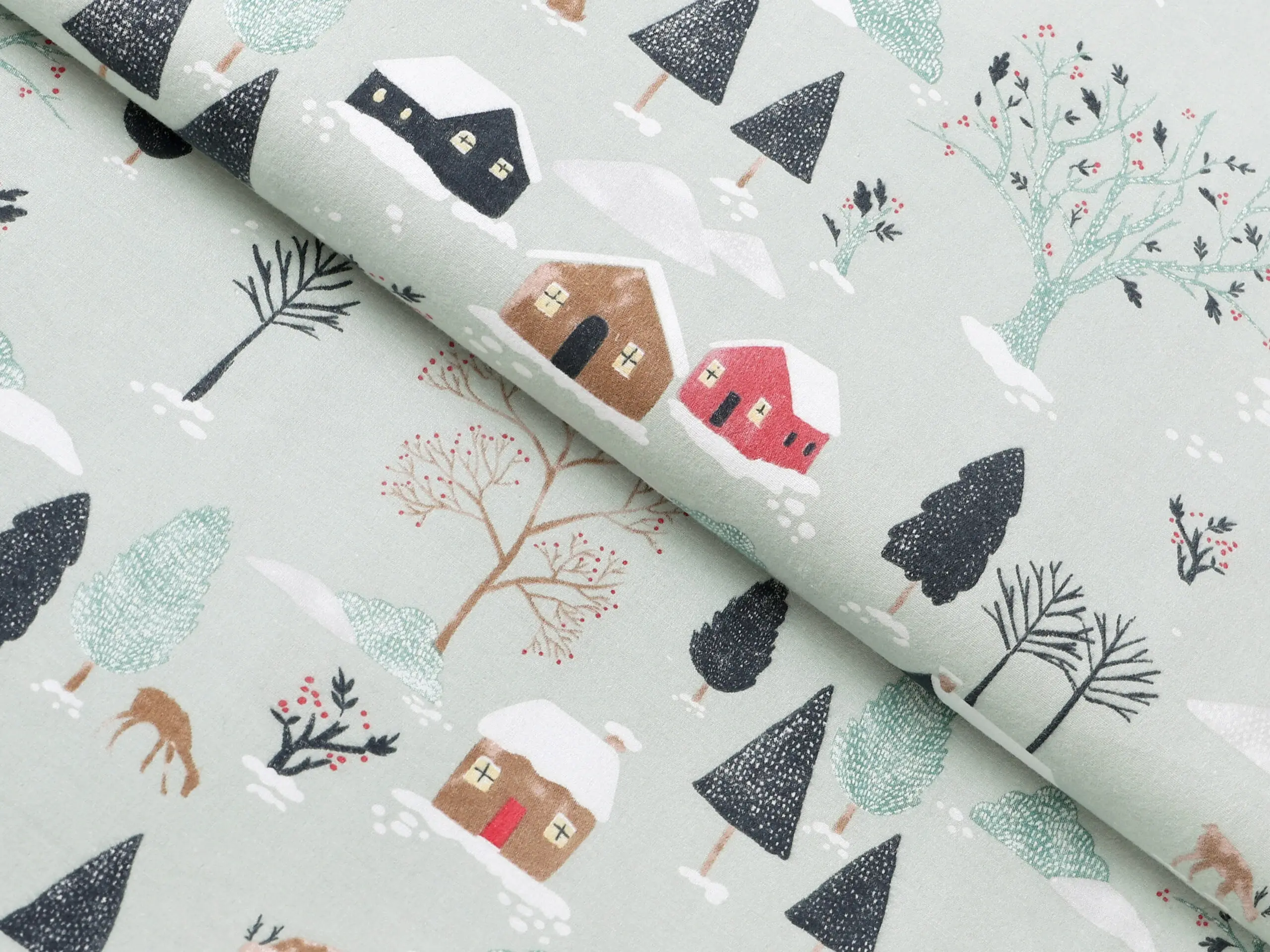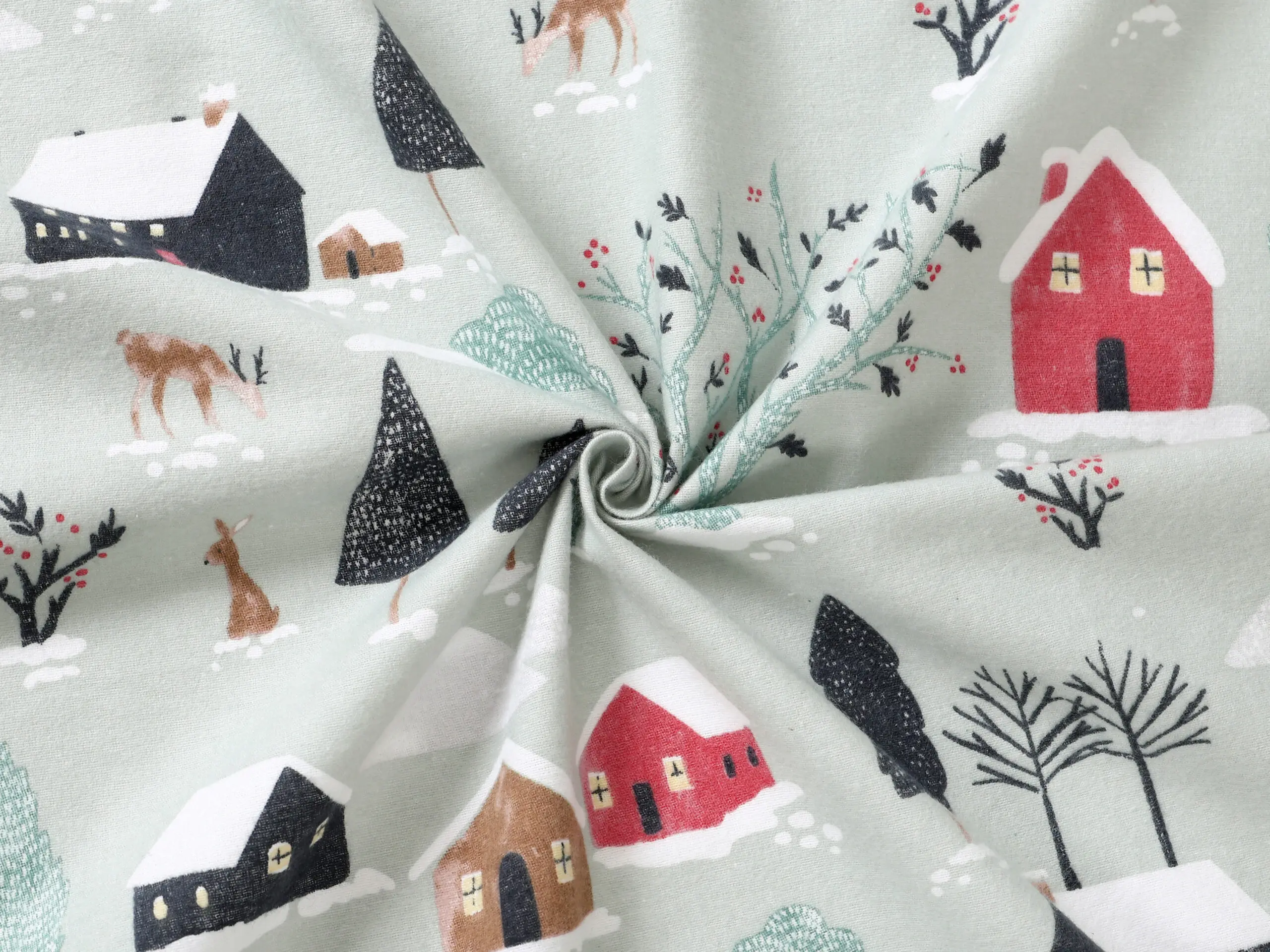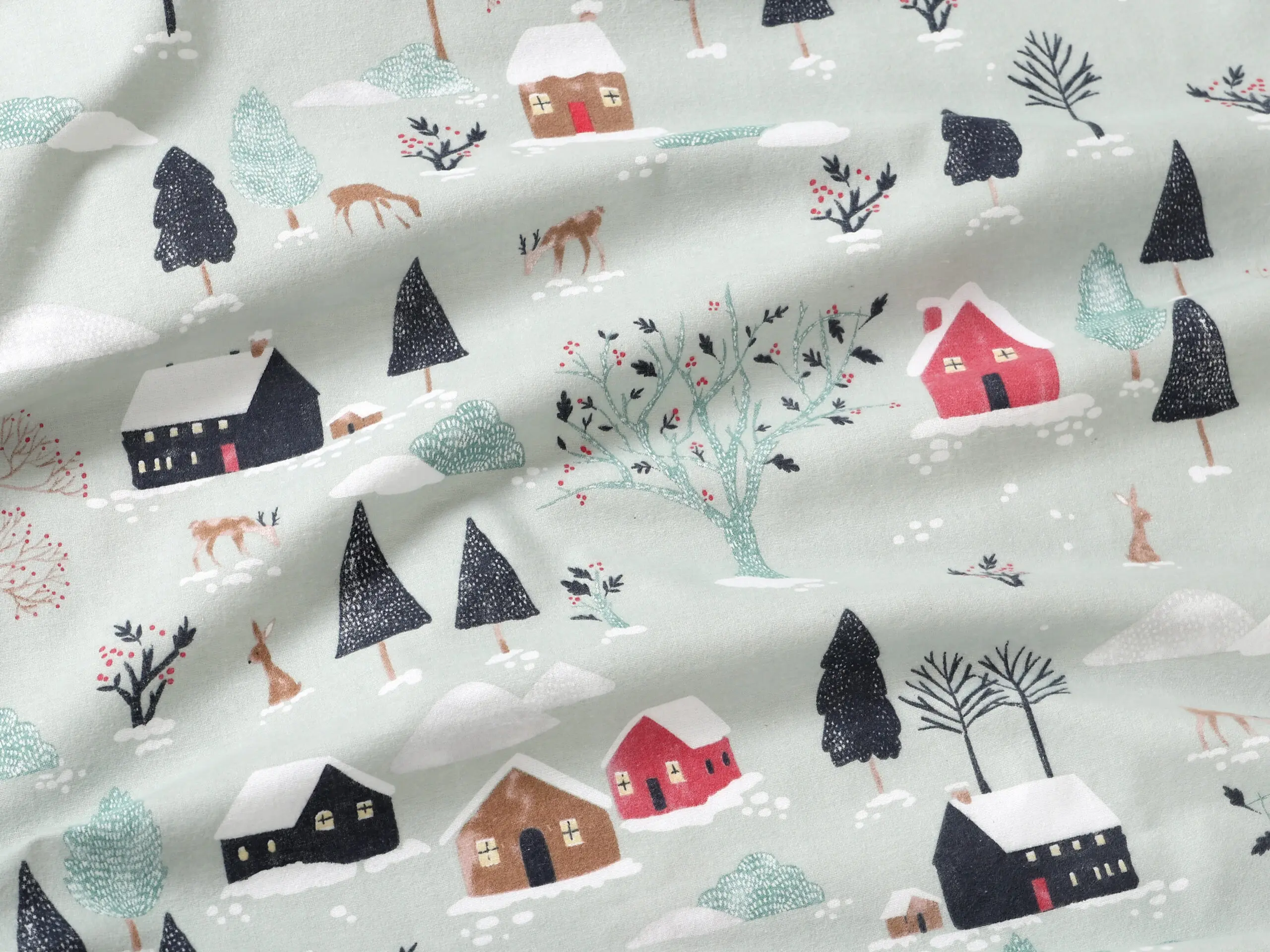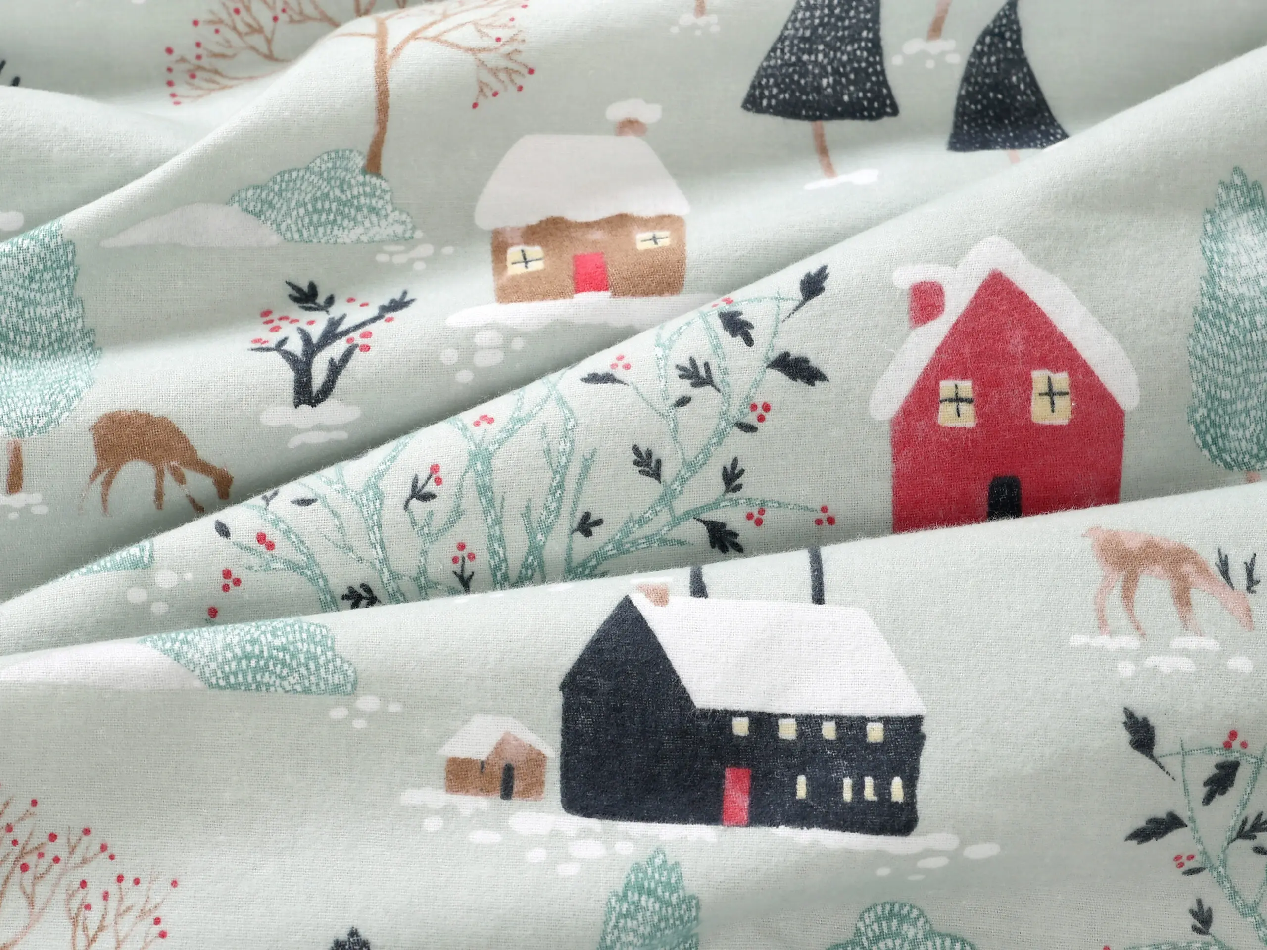 Flanelová látka zasněžený venkov značky Škodák je vyrobená z kvalitní hustě tkané, dvakrát česané 100% bavlny o gramáži 195 g/m².