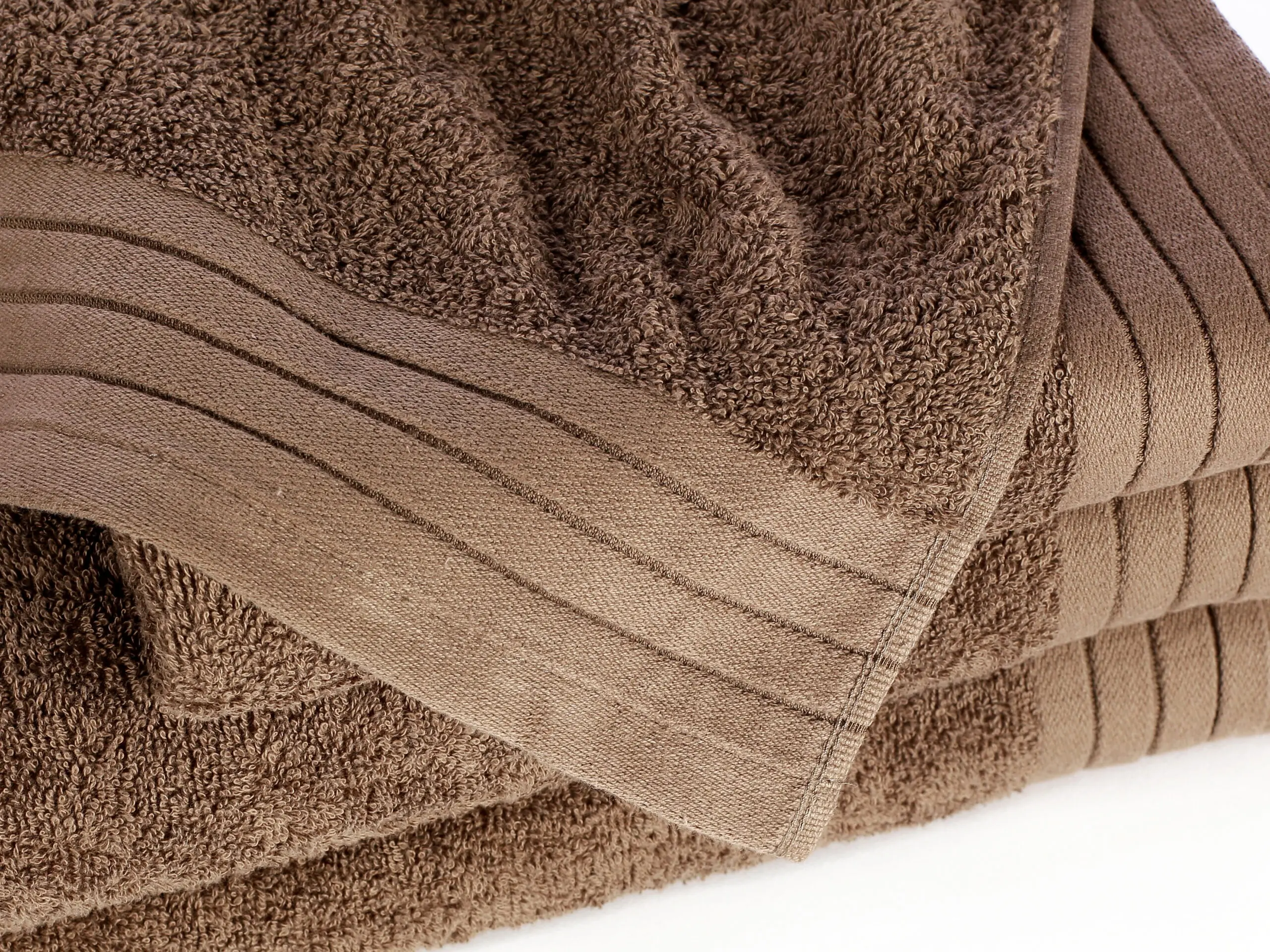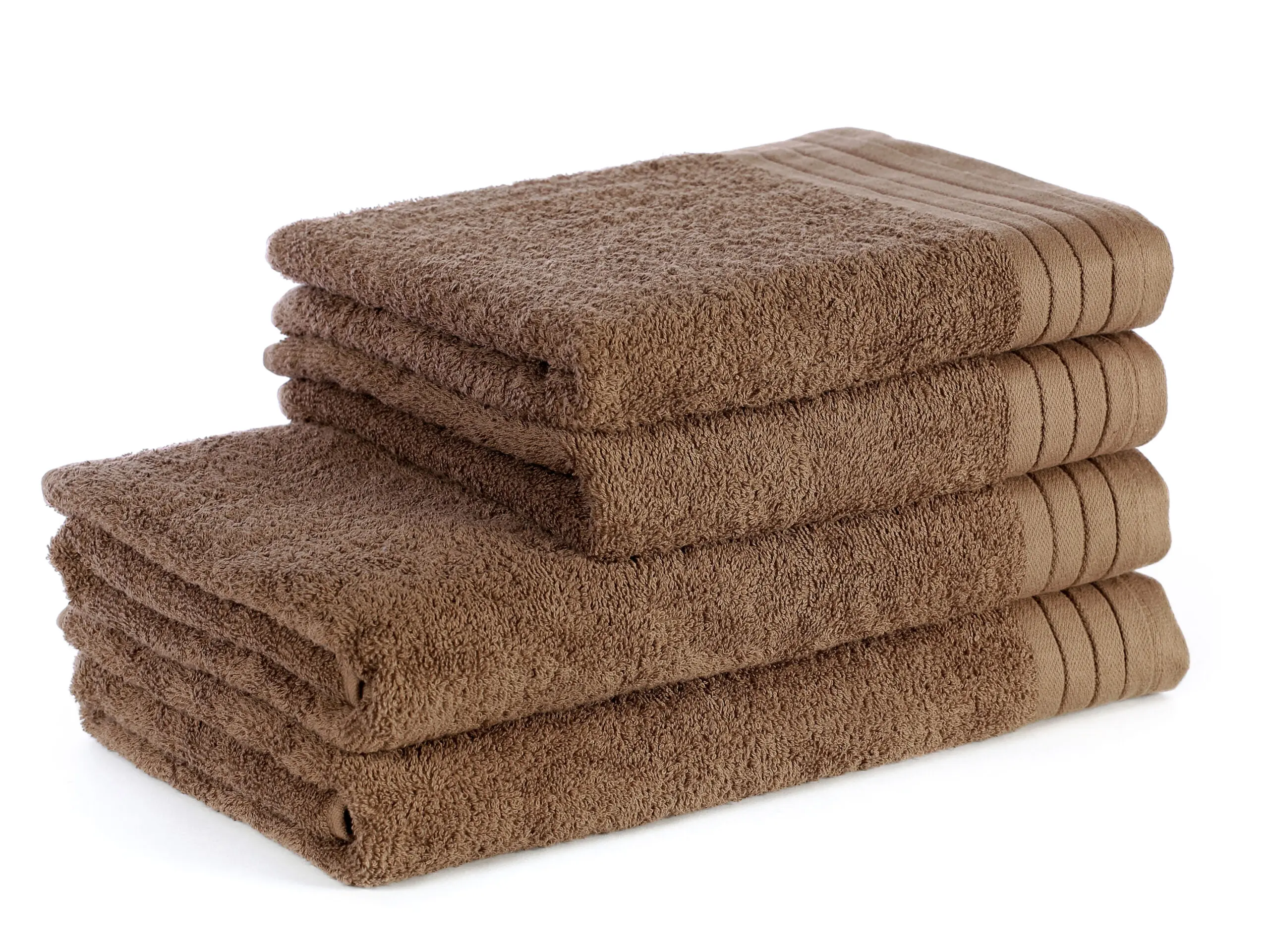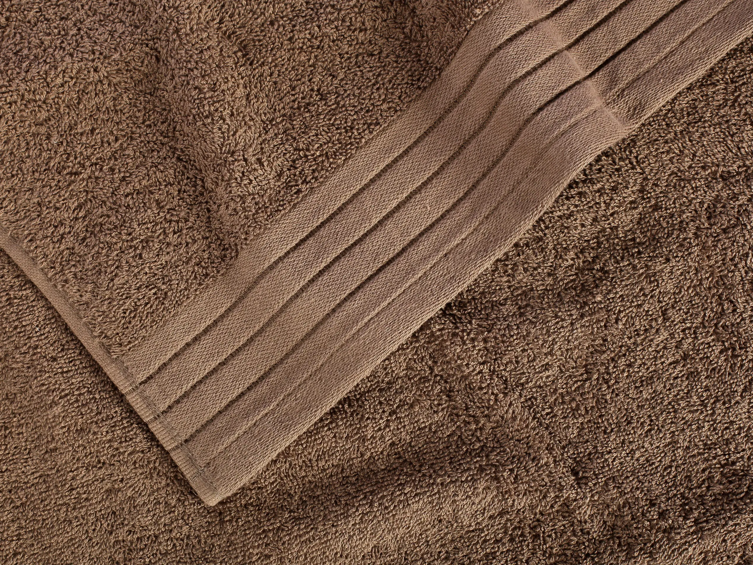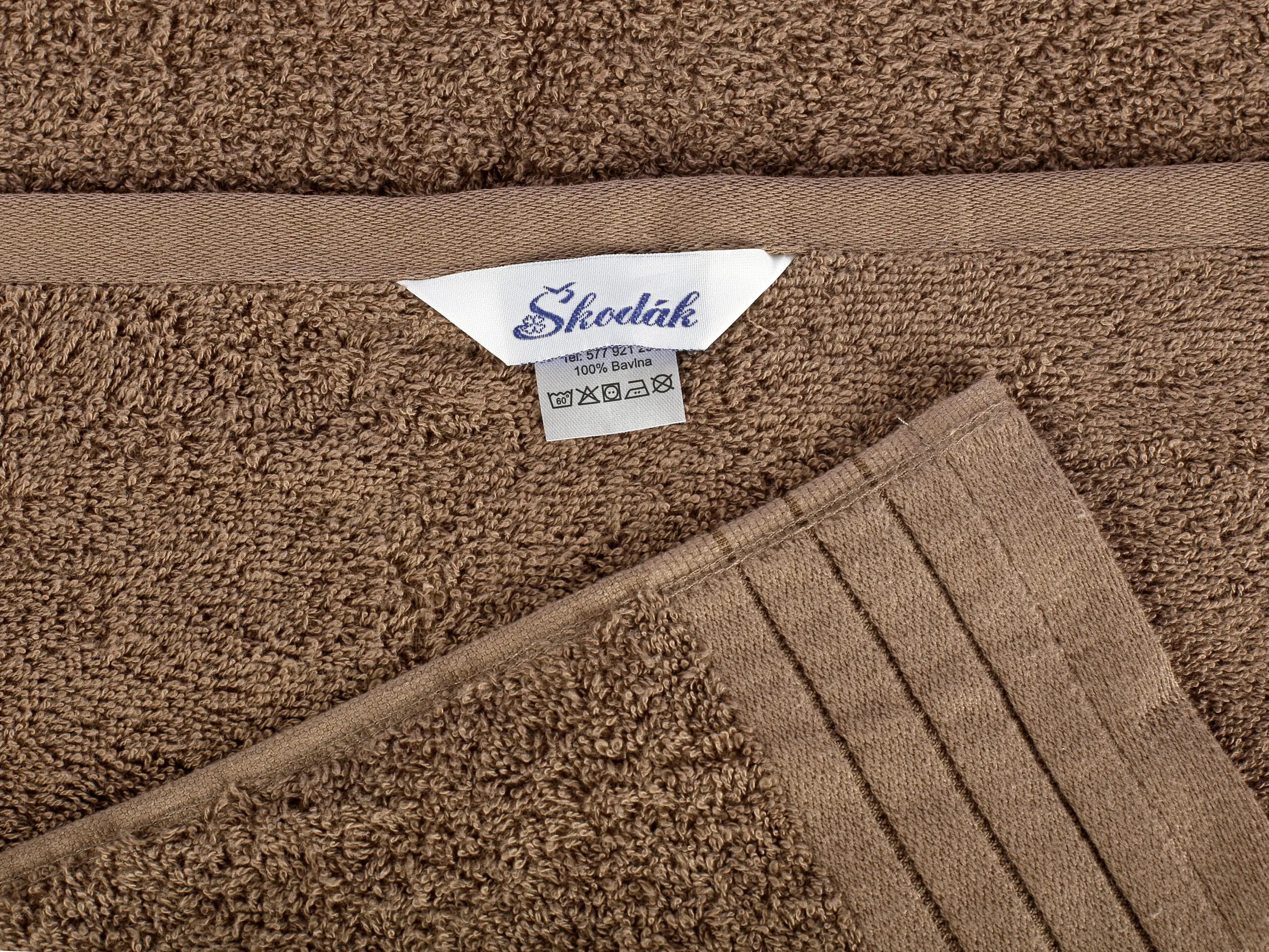 Hnědý froté ručník a osušku nabízíme v populárních rozměrech: 50×100 cm a 70×140 cm.