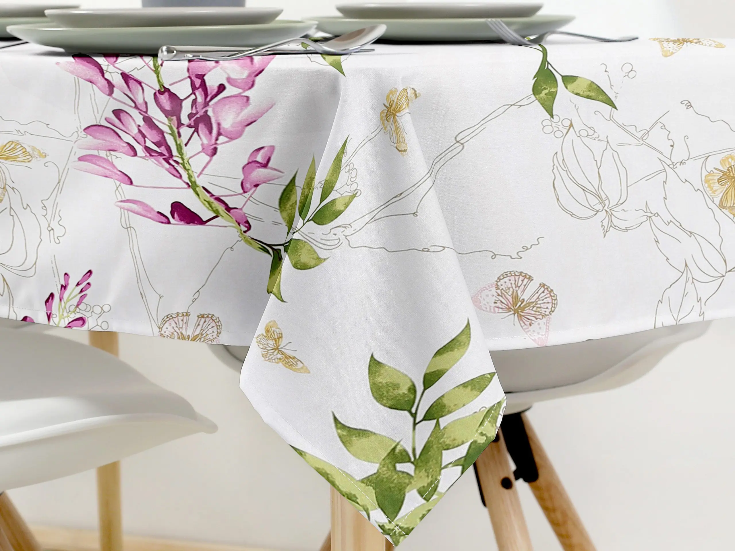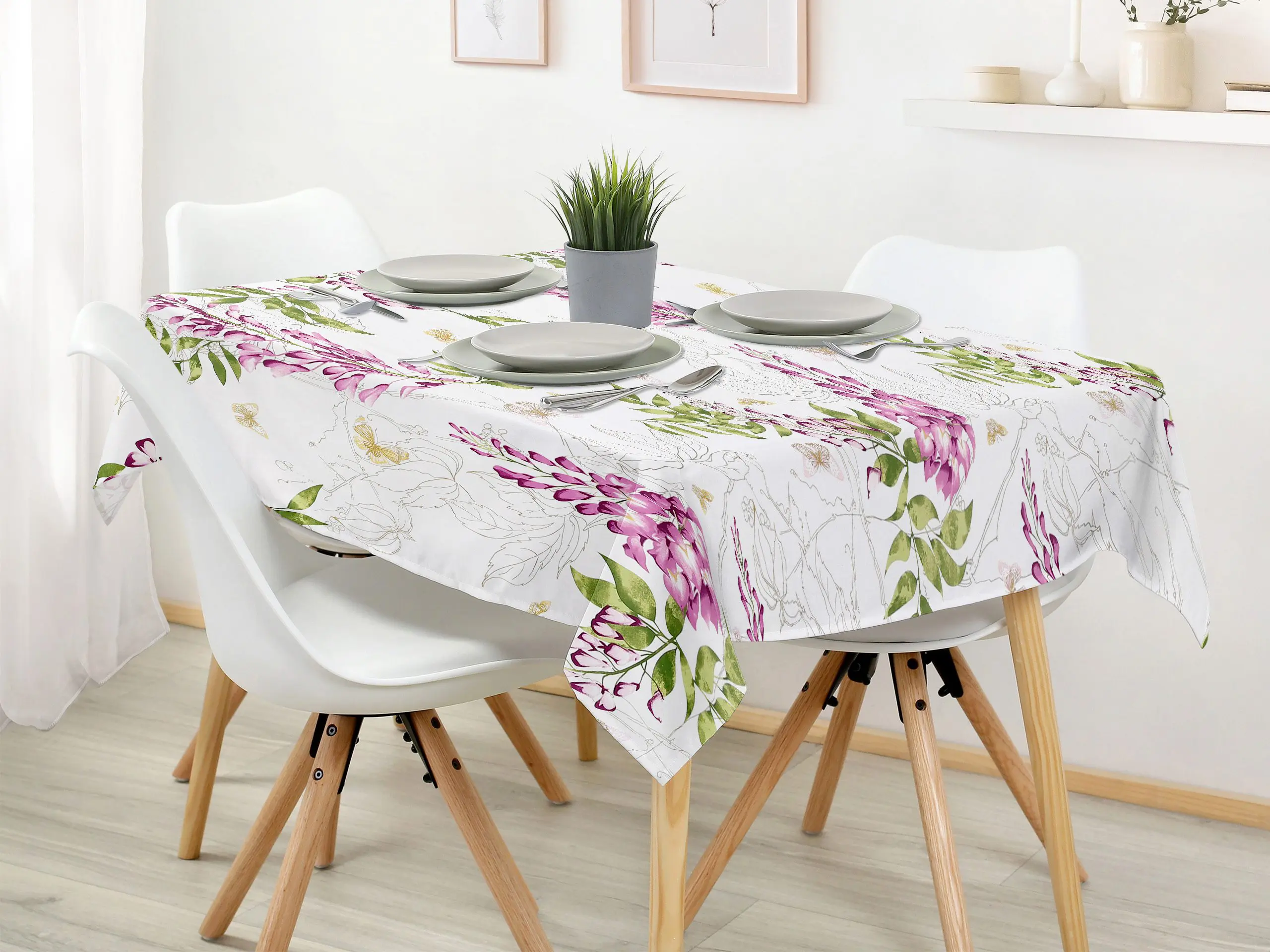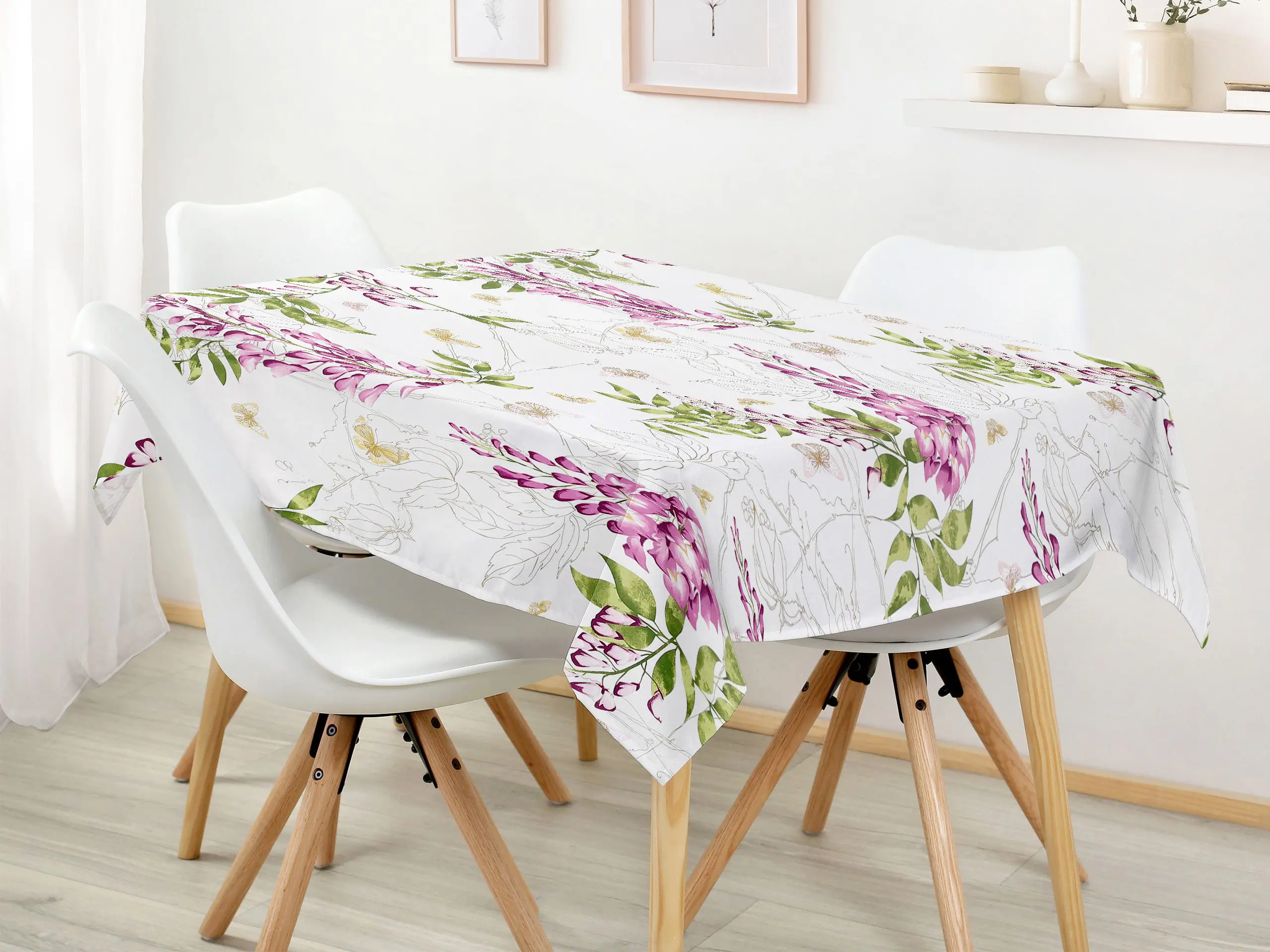 Hranatý bavlněný ubrus se vzorem květů vistárie na bílé je ideální volbou pro ty, kteří hledají kombinaci elegance a funkčnosti. Dejte svému stolu šmrnc s tímto nádherným květinovým ubrusem, který je skvělým doplňkem pro každou příležitost. Skvělá investice pro váš jídelní stůl. Ubrus se skvěle hodí pro každodenní použití.