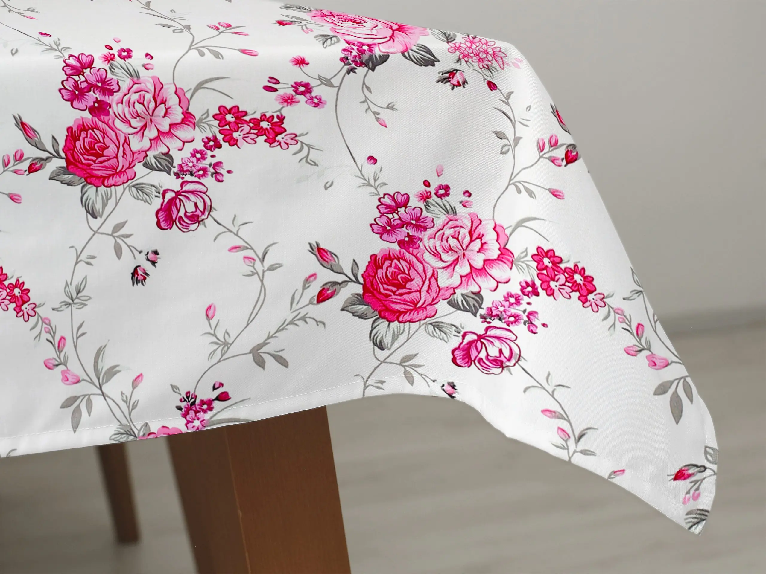 Hranatý bavlněný ubrus růže na bílé je ideální volbou pro ty, kteří hledají kombinaci elegance a funkčnosti. Dejte svému stolu šmrnc s tímto nádherným květinovým ubrusem, který je skvělým doplňkem pro každou příležitost. Skvělá investice pro váš jídelní stůl. Ubrus se skvěle hodí pro každodenní použití.