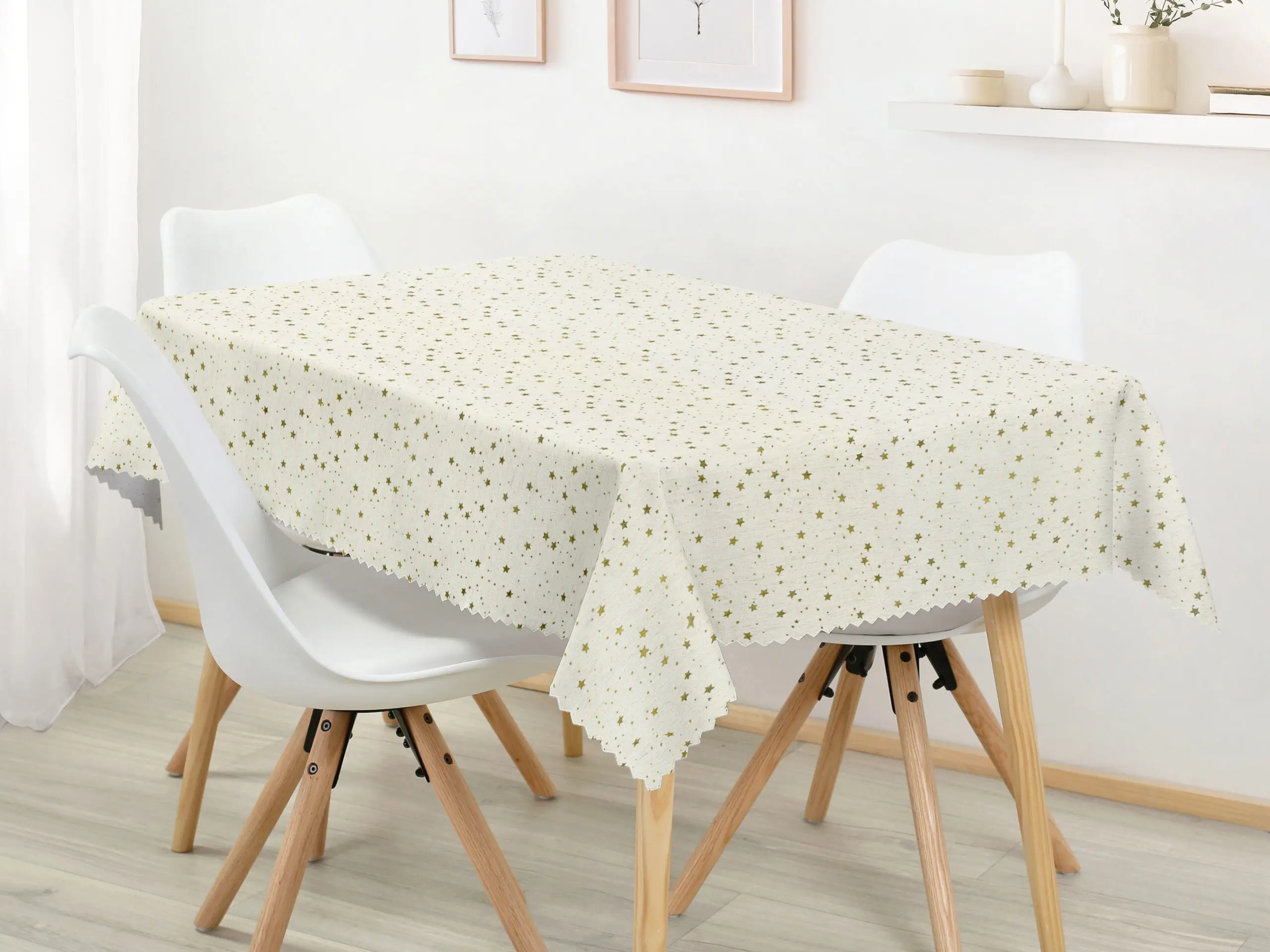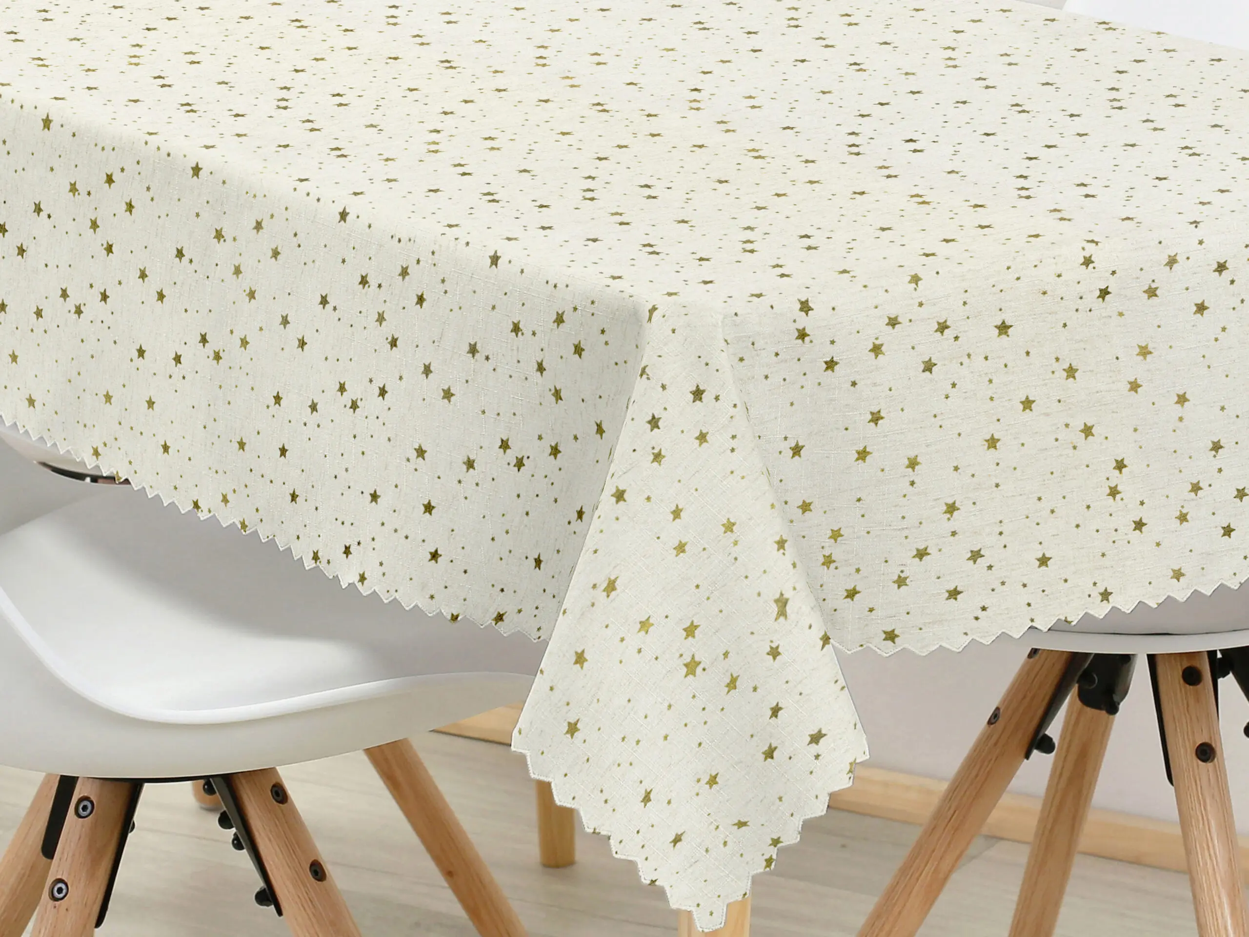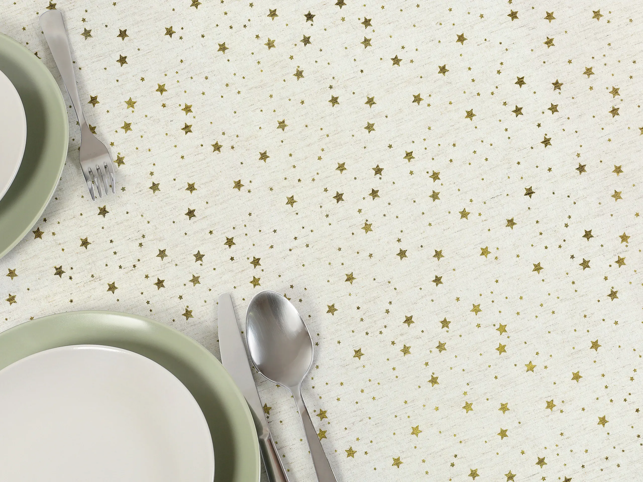 Náš hranatý dekorační ubrus zlaté hvězdy na režné je tím pravým doplňkem, který vnese do vašeho domova vánoční atmosféru a dodá vašemu jídelnímu stolu půvabný šarm. Jeho jemně tkaný motiv vytváří harmonii elegance a útulnosti.