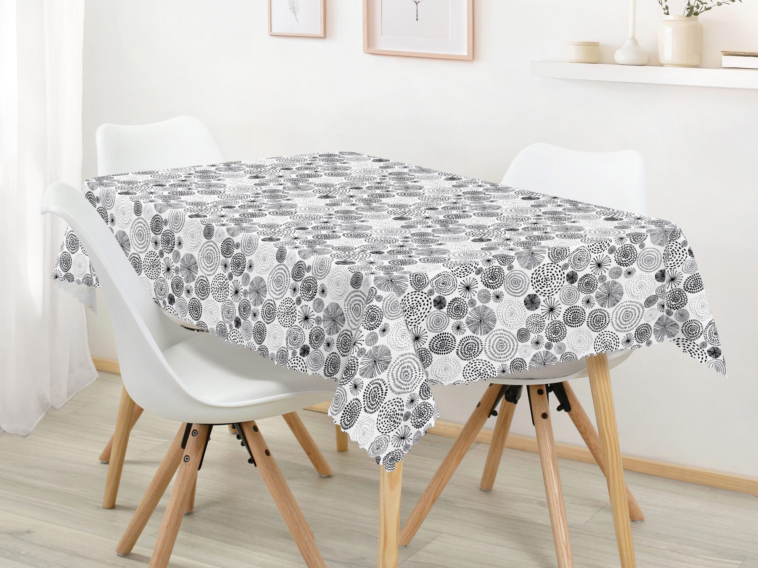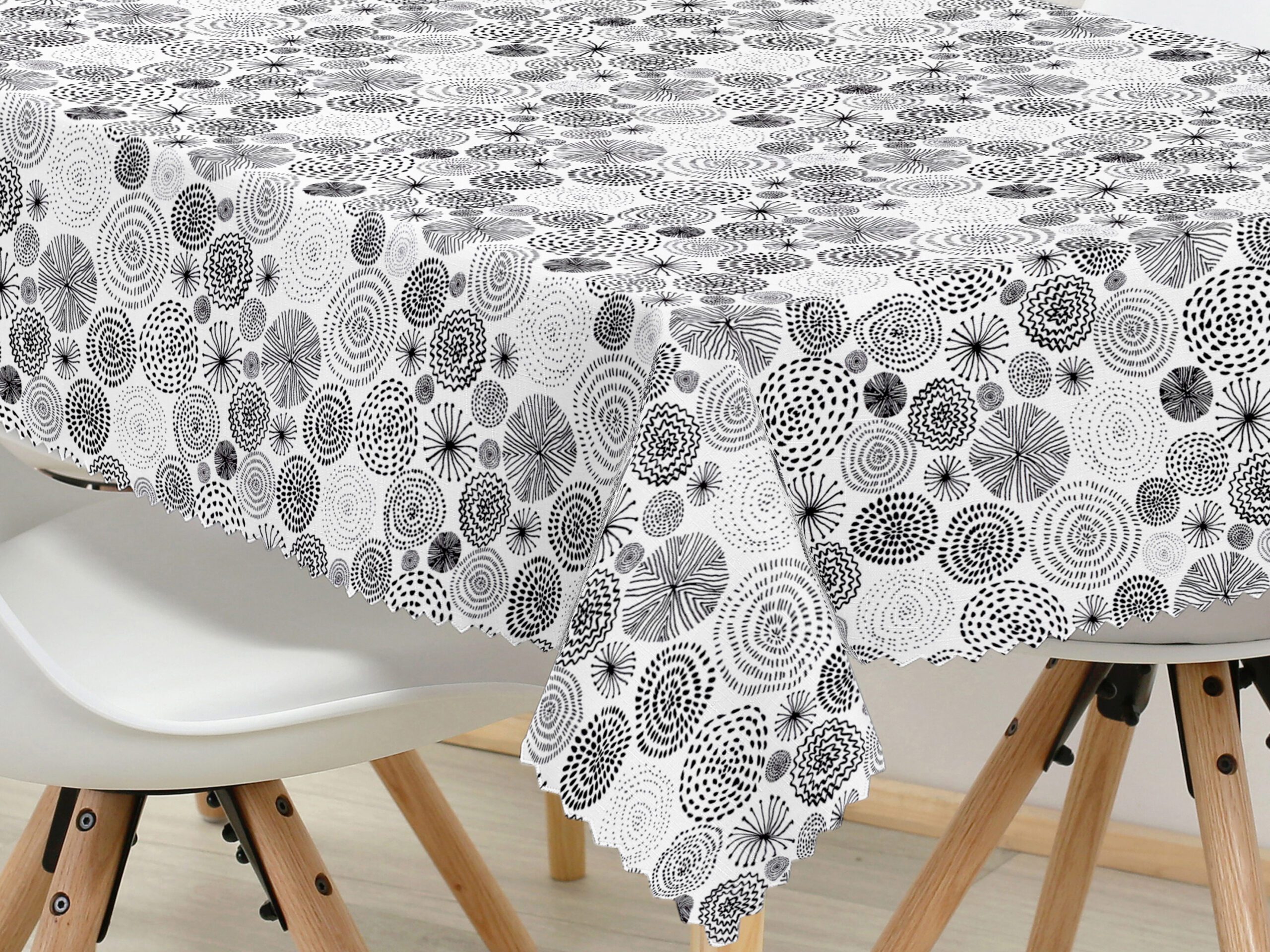 Hranatý teflonový ubrus na stůl – černé kruhy na bílé.