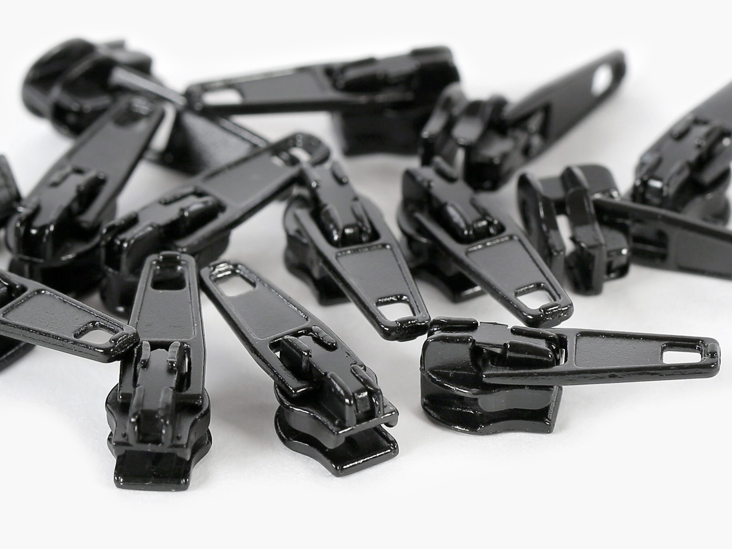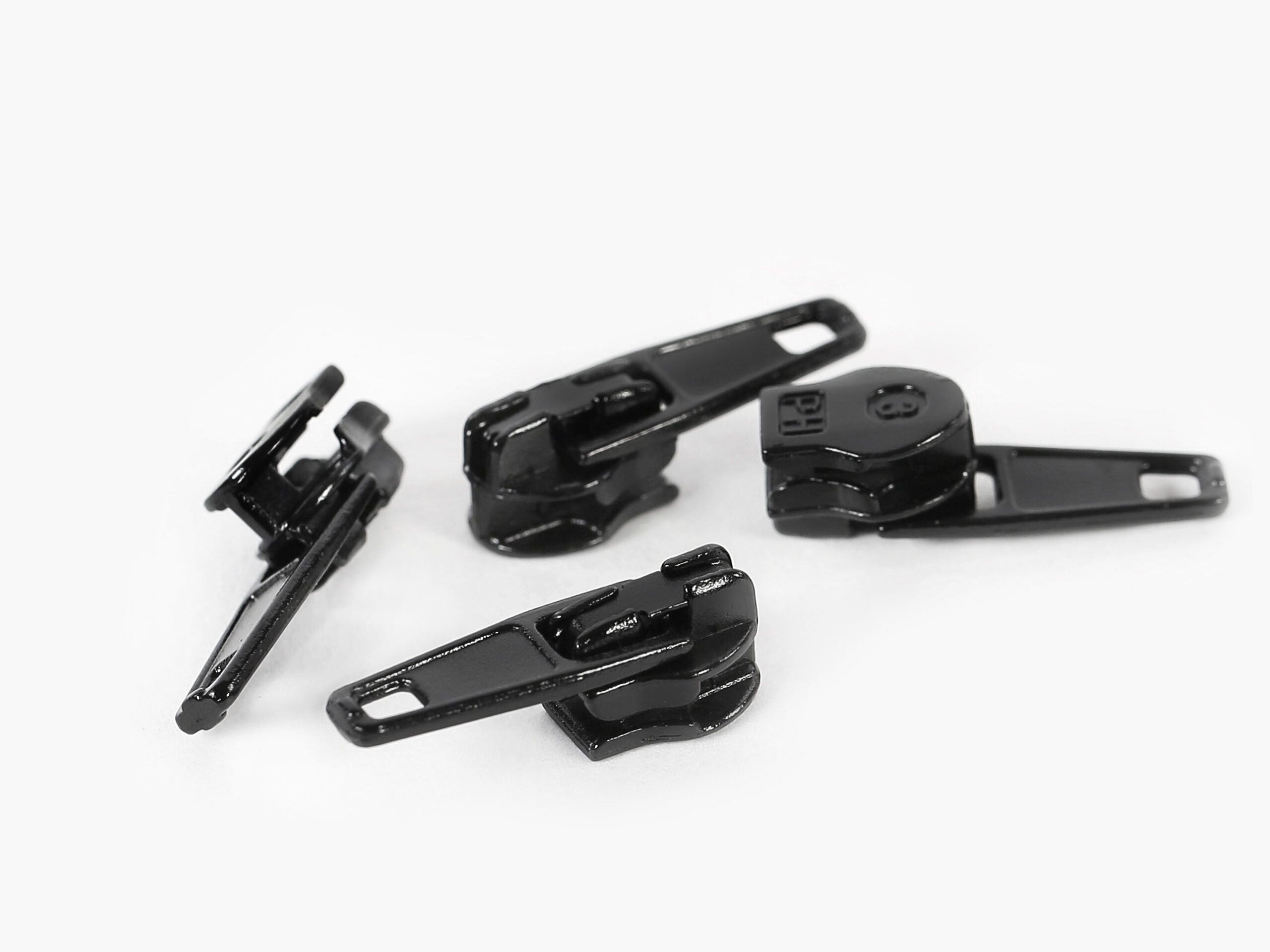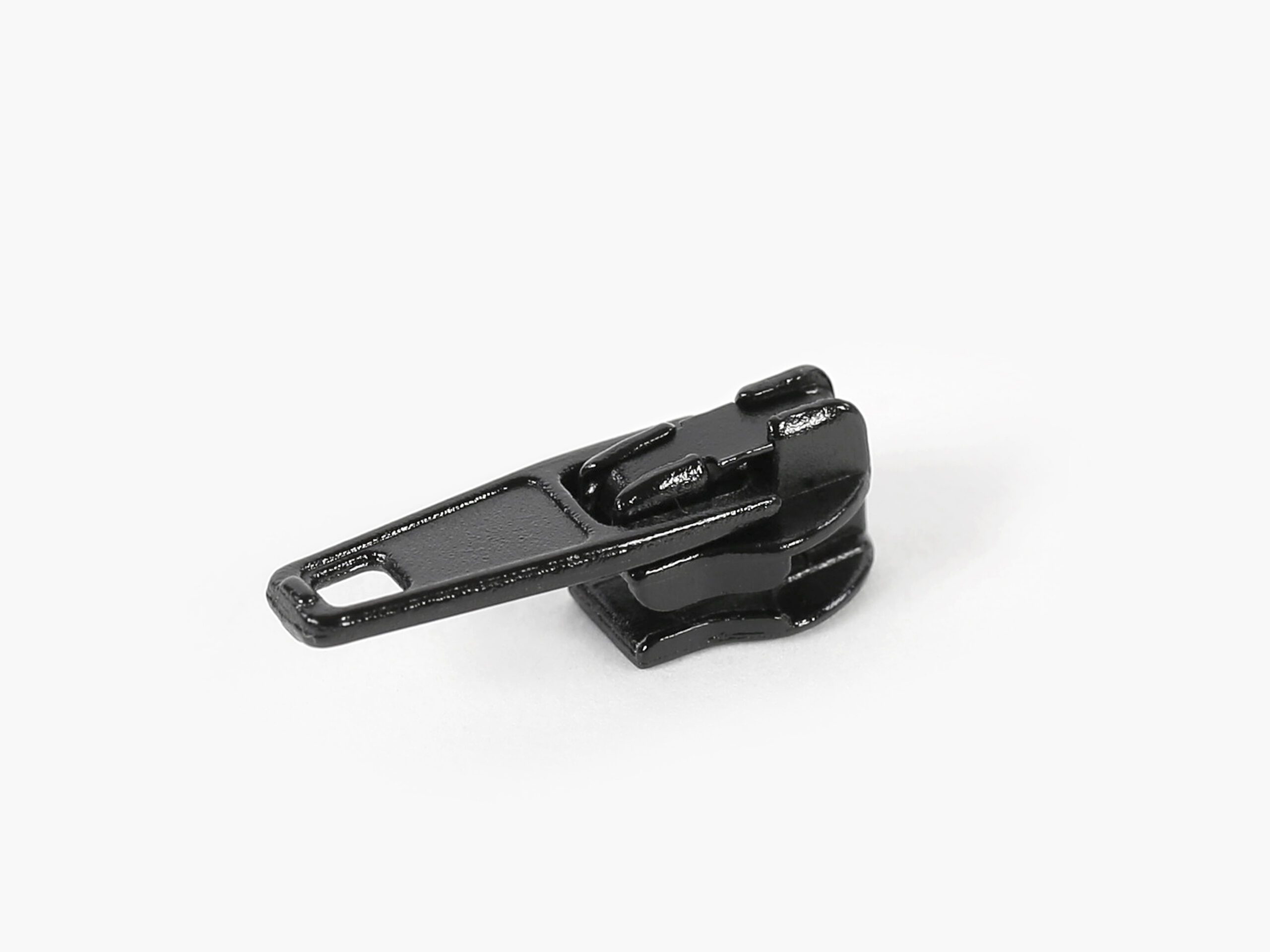 Kovový jezdec s táhlem v černé barvě je určený pro spirálové zipy o šíři 3 mm. Je vybaven táhlem a nemá aretaci (brzdu), což zajišťuje plynulý a tichý chod při použití. Vhodný pro výrobu nebo opravy oděvů, polštářů, povlečení, tašek a dalších textilních výrobků využívajících nekonečné zipy.